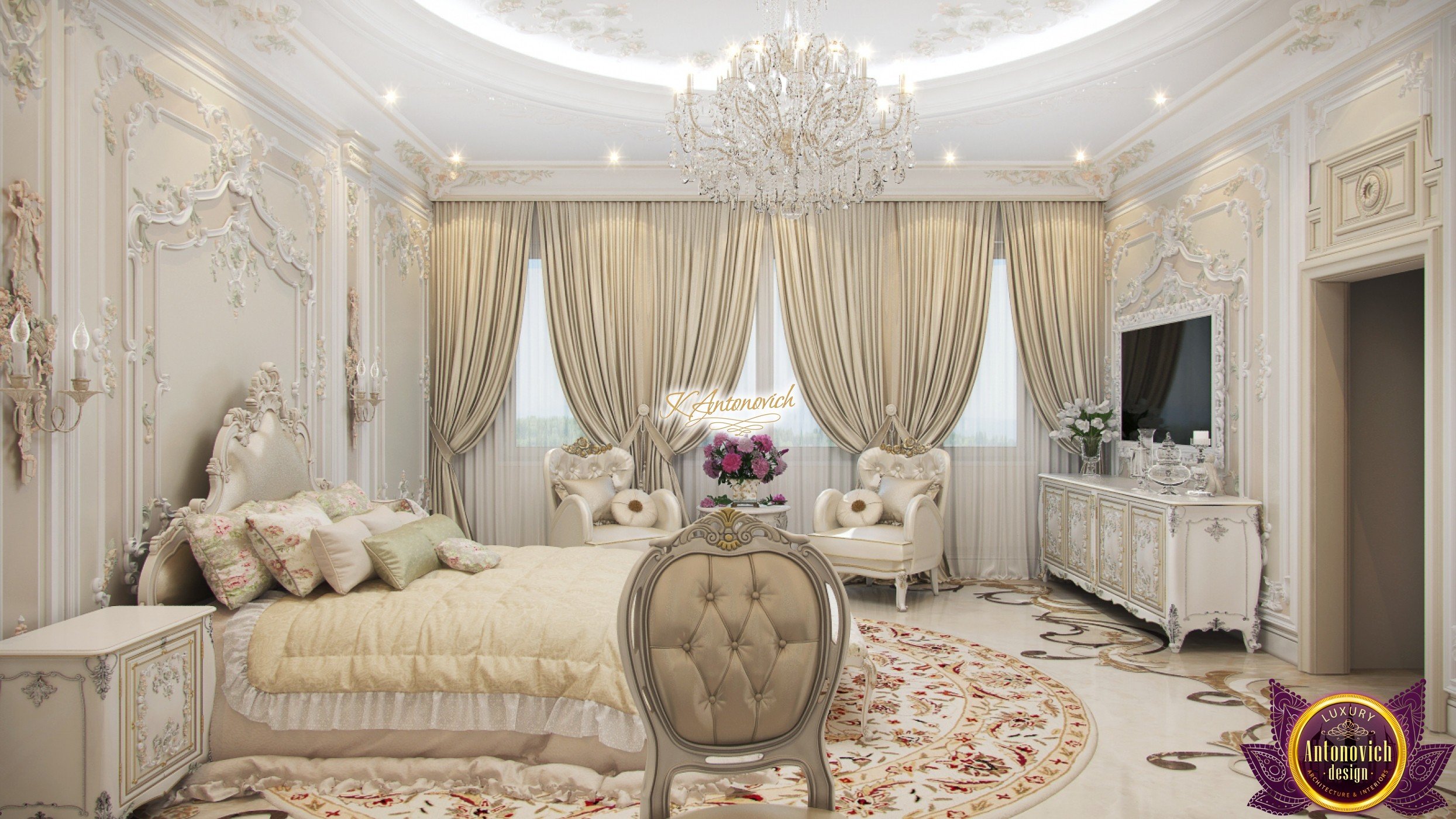 Improvisation with classic interior design always gives the unique charm of each house projects. And in this best bedroom designs, designers of interior company Antonovich Design added gentle and romantic accents of French style in the spirit of Provence. You can easily notice these fascinating aspects in a decoration of walls and ceilings. Beautiful romantic accent in the interior design for bedroom of the walls and the ceiling became precisely stucco molding. Charming floral compositions perfectly fit into master bedroom interior design and filled it with a lush and cozy mood. The ceiling is decorated with deep niche the right circular shape, which is around the entire perimeter illuminated by backlighting line. A delightful play of light and shade provides by an elegant crystal chandelier. interior design consultant exquisitely repeated the ceiling decoration motives in the decoration of floors. Curls of carved patterns on the marble floor design echoed also with contours of curls stucco decoration. Round natural carpet with floral ornament repeats the outlines of niches in the ceiling.