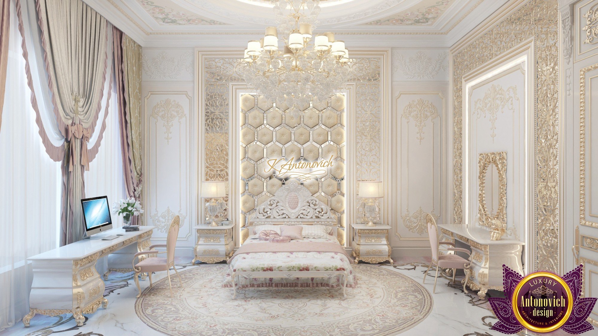 This bedroom interior in a classical style with Art Deco accents just fascinates with its lush beauty and luxurious decoration.Interior designers of design studio Antonovich cleverly combine a classic style with bright moments and rococo art deco touches.The result is an interior of unique beauty. Let us consider in detail the interior of the bedroom. Let's start with the design of the ceiling.It is the ceiling in the bedroom becomes the main point that we are more likely to contemplate in moments of relaxation. Therefore, the decoration of the ceiling in the interiors bedrooms we treat with special attention.In this project, the ceiling decorated with traditional stucco in the best traditions of classical style and elegant art painting.The elements of gilding and magnificent crystal chandelier complete the beautiful picture of the ceiling design.And, of course, the main decoration of the bedroom has become a beautiful bed with exquisitely carved headboard. To more enhance the luxurious and festive mood, the wall behind the headboard is decorated with decor panel made of genuine leather of cream shade with mirror inserts. Mirror panels with gilded forged patterns framed it.Forging ornament, interior designers repeat in the stucco decoration on the walls. The furniture in the bedroom of ivory inlaid with carved decor handmade gilding. Large windows decorated with charming curtains of silk with beautiful ruffles and soft grabs in the form of bows. The floor made of natural marble with beautiful swirls of carved patterns and luxurious Persian rug continues the splendor and beauty of the interior of the bedroom.