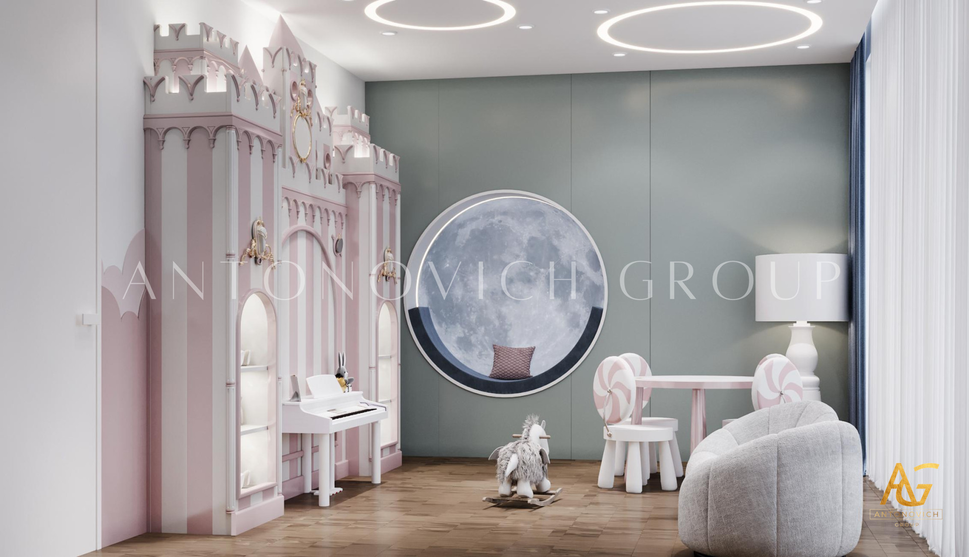 Bright and stylish children's room interior was designed by the studio Luxury Antonovich Design for the daughter of apartment owners in Dubai. The interior is a subject to dreams and desires of the room owner. A bright and stylish image reflects her bright and stylish character. Interior Designers Dubai perfectly organized space, filling it with tenderness and warmth. Each square meter of interior is an elegant piece of the luxury image of the interior. Charming composition is a luxurious bed, wall decor behind the headboard and an armchair. The wall is decorated with a soft textile panel of light beige color with a shallow sink marks. An elegant panel is complemented by line of soft lighting. Against this background, elegant armchair upholstered in noble velvet of purple hue looks charmingly. High soft headboard is a bit lighter than a wallboard. It is completed by fragment of handwork carved decoration. The decoration of the bed is in perfect harmony with the window design. The bed is decorated with quilted silk cover of lilac hue. From the same fabric luxurious curtains are made. A large wardrobe with sliding glass system and charming ornaments exquisitely blended into the interior. Children's room interior design for a girl is filled with a sense of warmth and tenderness. The main emphasis on the softness and warmth becomes fluffy round carpet with a high pile and a floor made of natural wood of valuable species.