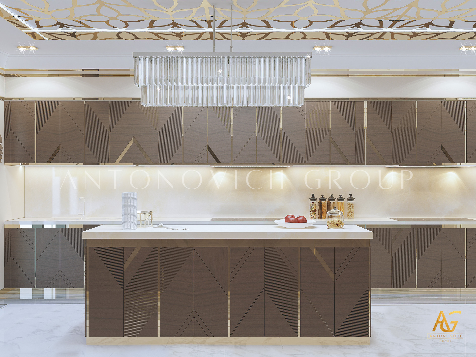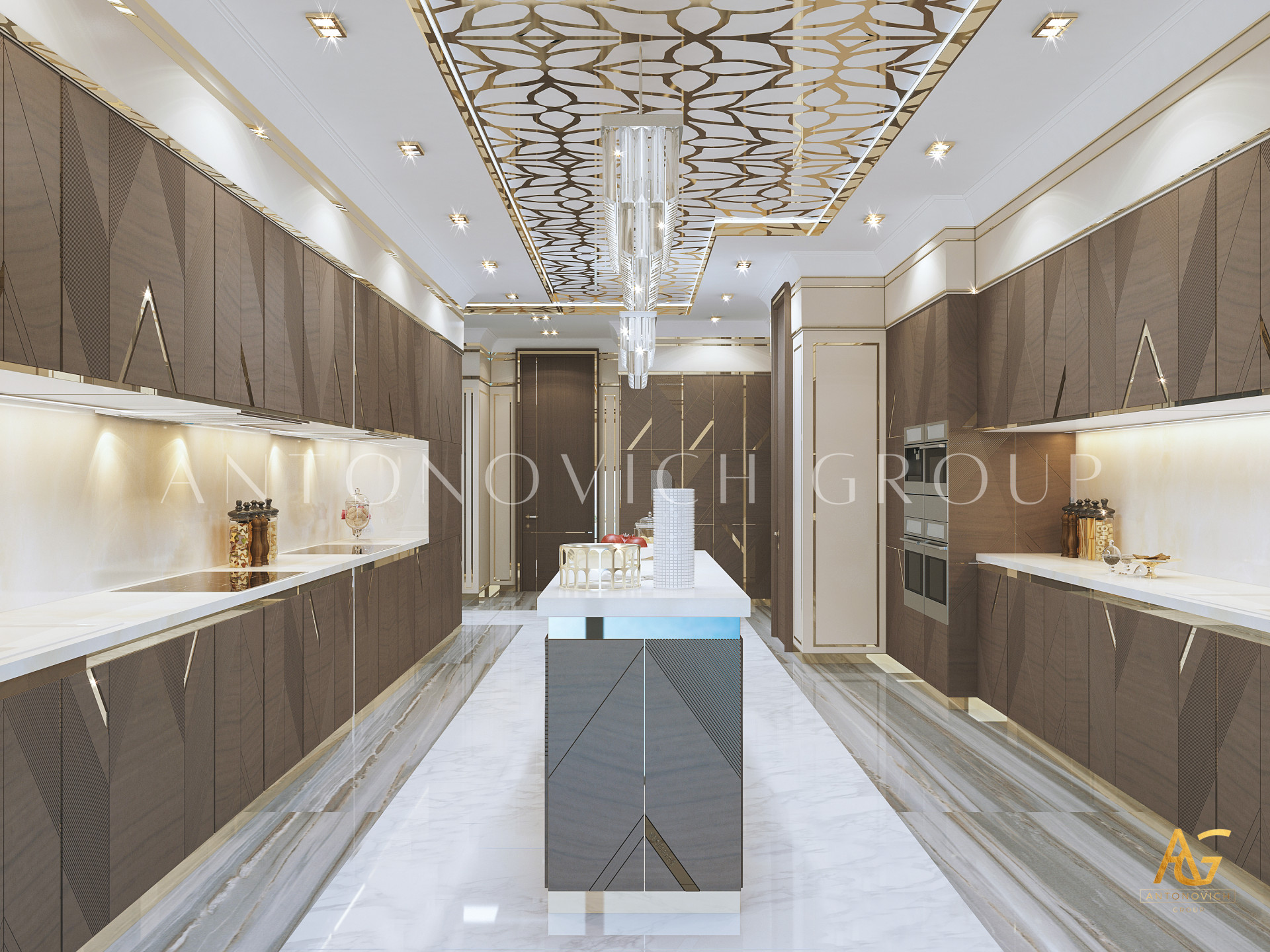 To create a kitchen design that would be ideal for our customers, the designers of Luxury Antonovich Design Studio use creative ideas, best traditions, and modern technologies. Its no secret that it is the kitchen in our house that becomes the most beloved room.It is the kitchen interior is most connected with new technological innovations.In this spacious kitchen, behind the laconic facades of natural wood, the latest storage systems, and modern kitchen appliances are exquisitely concealed.Fashionable design of the kitchen means a stylish, harmonious and aesthetically perfect image. In this project for the kitchen was allocated a large room.In this regard, a fairly large number of kitchen furniture, which is placed almost along the entire perimeter, looks unpretentious and exquisite.In the center of the room, we proposed to organize a small dining area with soft chairs with a noble bearing and a table made of natural valuable wood. The stylish design of the kitchen depends on many things. And in this kitchen design, every detail and each thing are well thought through.So, the window was decorated with a luxurious triple Roman blind. Work surfaces made of white marble are flawlessly combined with brown kitchen facades. The exclusive design of the kitchen in the classical style is filled with a mood of sublime nobility and elegance. The highlight of the project become a luxurious ceiling with elements of stucco decoration and artistic painting. Modern ideas of kitchen design are closely interconnected with innovations in the field of material processing. So, for curtains are selected fabrics with special impregnation. And for floors, marble coverings with a special anti-slip texture. This is the European kitchen design in the best traditions of the modern classic.The design kitchen became an excellent continuation of the interior story of an elite villa.