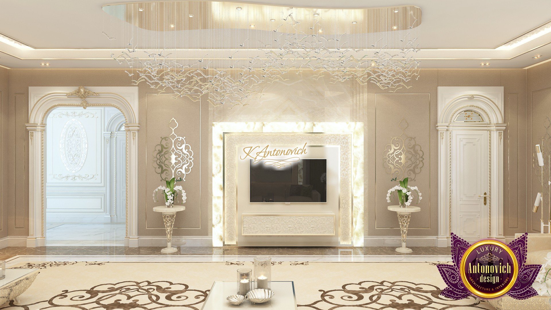 The Art Nouveau style in modern interiors originated elegant transformations. Keeping the main moments and rules, interior designers of the studio Luxury Antonovich Design bringing something new to the decoration of luxurious interiors of houses and apartments.This interior of a beautiful living room fully expresses the desire of a person to surround himself with beauty. If we talk about the color scheme of the project, the warmth and tenderness in the room provided by a pleasant range of pastel shades, from milky to beige.To make the space more expressive, the textile designers of Antonovic Design Studio offered luxurious curtains made of silk velvet with a mustard-green hue.In the interior, there is a lot of cozy and luxurious accents. Take a look to the original flowerpots, which are decorated with soft velvet panels. In the ceiling decoration, present an element of romance and novelty.The luxurious modern chandelier is a set of small crystal birds, which are suspended on the finest metal strands.This creates a complete illusion of soaring birds in the air. Another bright and expressive moment in the interior was the decoration of the floors.Against the background of light marble, large monogram ornaments of dark brown marble look very beautiful. An important role in this project plays the ornamental solution, which interior designers masterly repeat in the decor of furniture, walls, and floors. Luxury sofas have rather simple shapes. But nevertheless, furniture looks very luxurious and respectable. It is upholstered with monochrome velvet, and on the sides, it is decorated with carved handmade decor.Also, exquisite openwork patterns are repeated in the decoration of the walls framed by the beautiful decor panels.