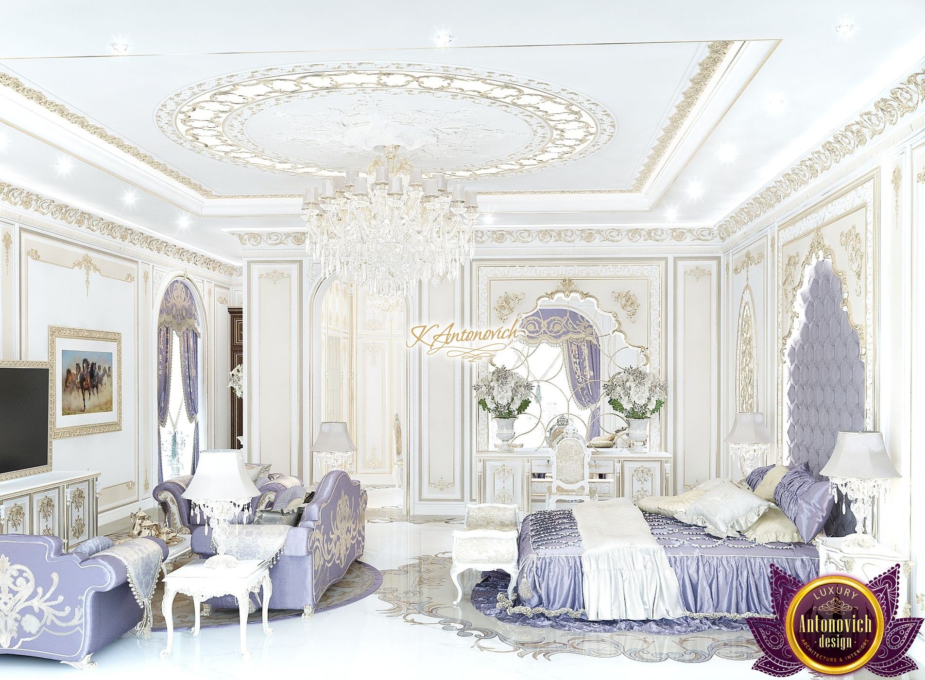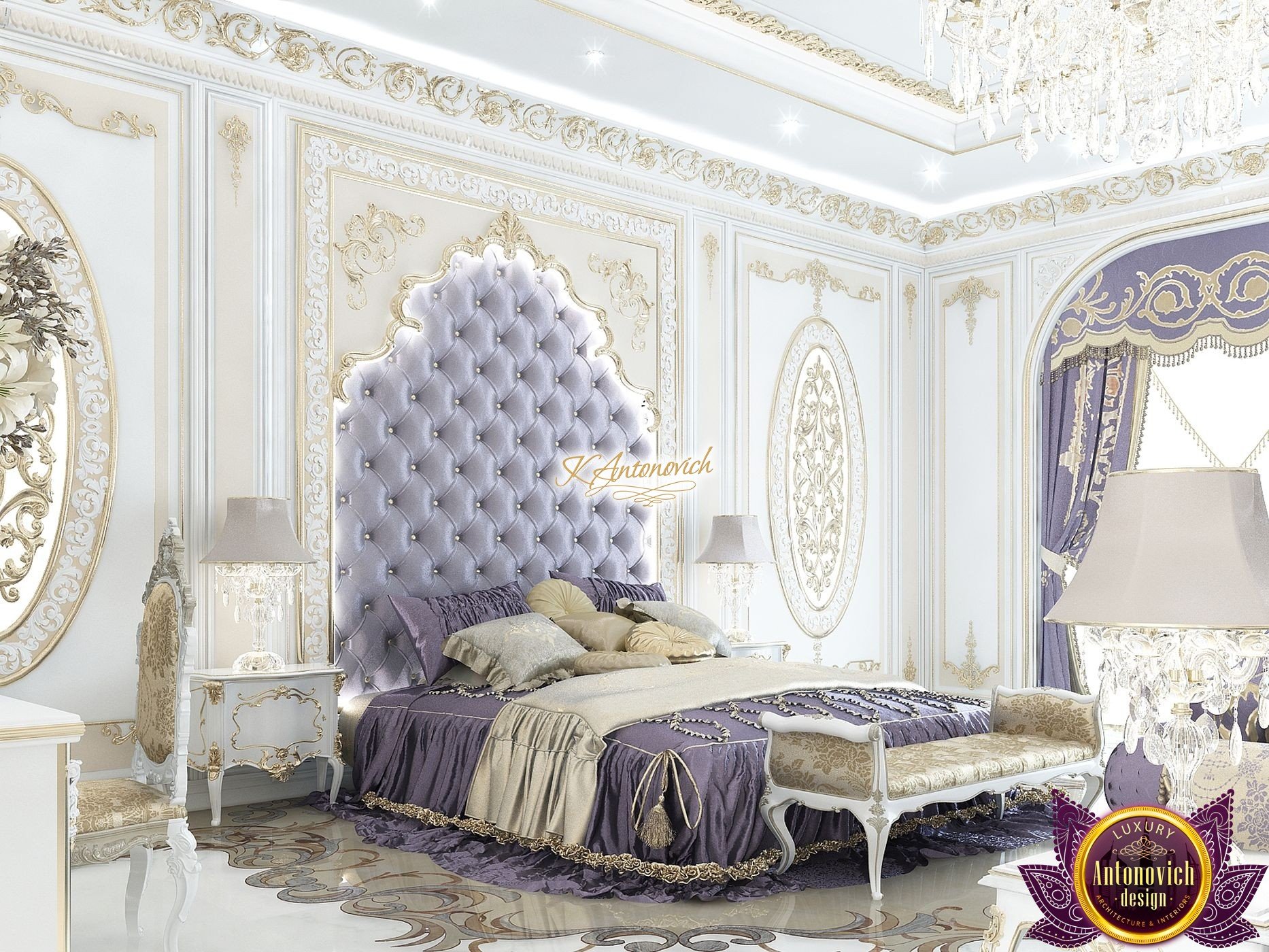 An architectural and design company Luxury Antonovich Design creates an individual image of your home. Exclusive design of the house is the embodiment of your dreams into reality. One has only to refer to specialists of design company Luxury Antonovich Design. The leading architects and professional designers create a comfortable, luxury, and most importantly functional interior. Luxury Master Bedroom Design is an example of how beauty and comfort are intertwined and are embodied in the beautiful design of the house. The skilful designers of an architectural firm Luxury Antonovich Design created a fantastically beautiful interior with a delicate lilac color. It looks gentle and romantic. These shades have inner tranquility and serenity. Furniture is the main attribute in decorating of the premises. The bed, with beautiful headboard in the form of textile panels emphasizes the elegant artistic taste of homeowners. Artificial, low-cost materials are intolerable in this interior. Only high quality finishing, expensive materials, natural wood are used in the creation of a unique space. The feature of an elegant bed – applique of gilding around the headboard. Exclusive fabrics look good to the eyes. The bedspreads with gold threads are the perfect complement of the irresistible style of the room. These designers of the design bureau Luxury Antonovich Design took care of home comfort. The original console-mirror with a mirror in the frame with hand painting from the gold plate gives a special unique atmosphere to the bedroom. Bed cabinets are an important element for creating comfort and convenience. Leisure area is equipped with plush sofas, armchairs, poufs, which are in perfect harmony with other elements of decor.