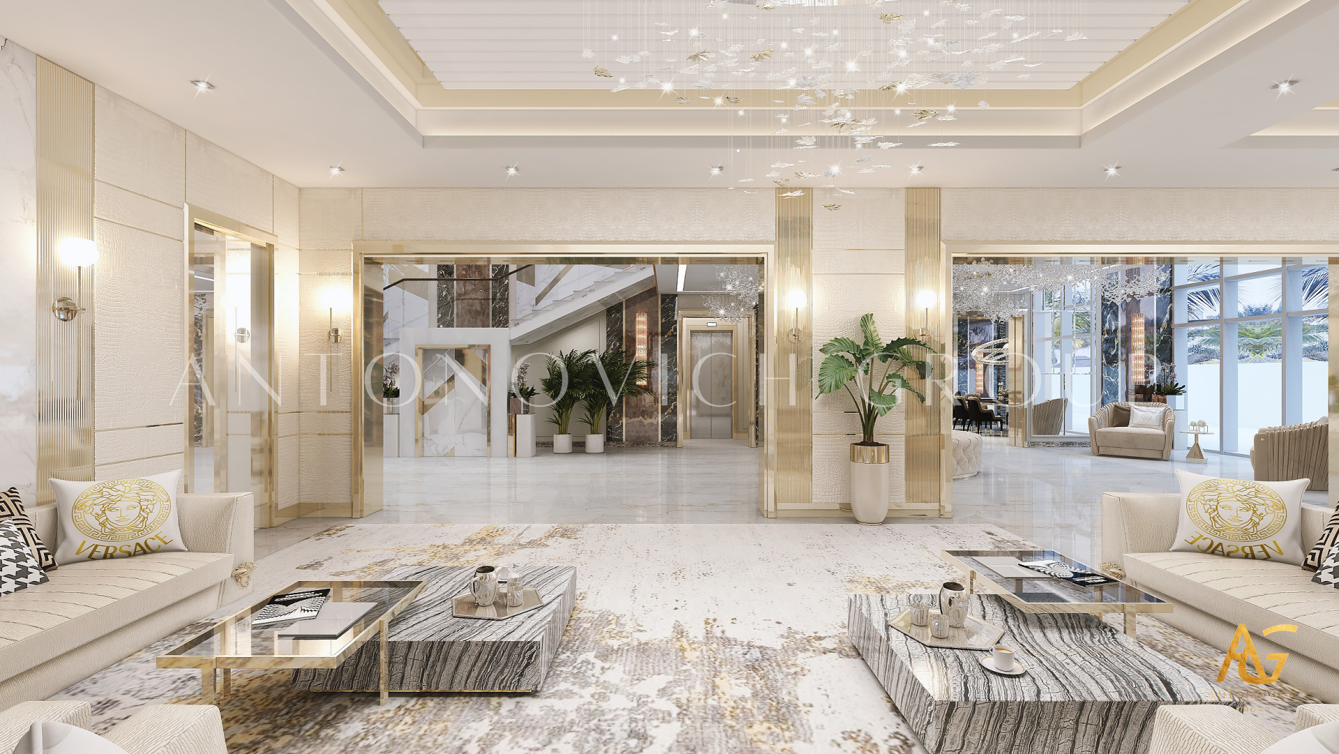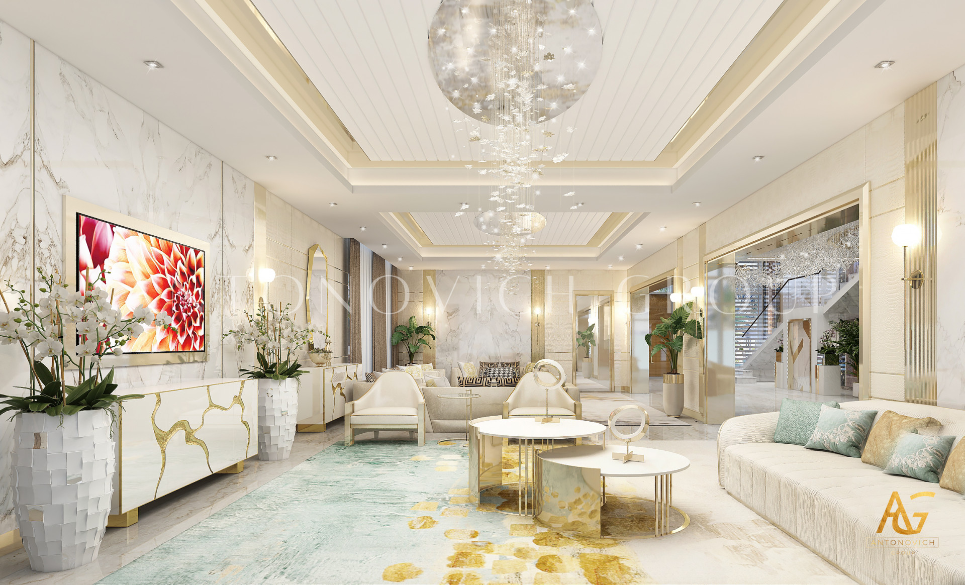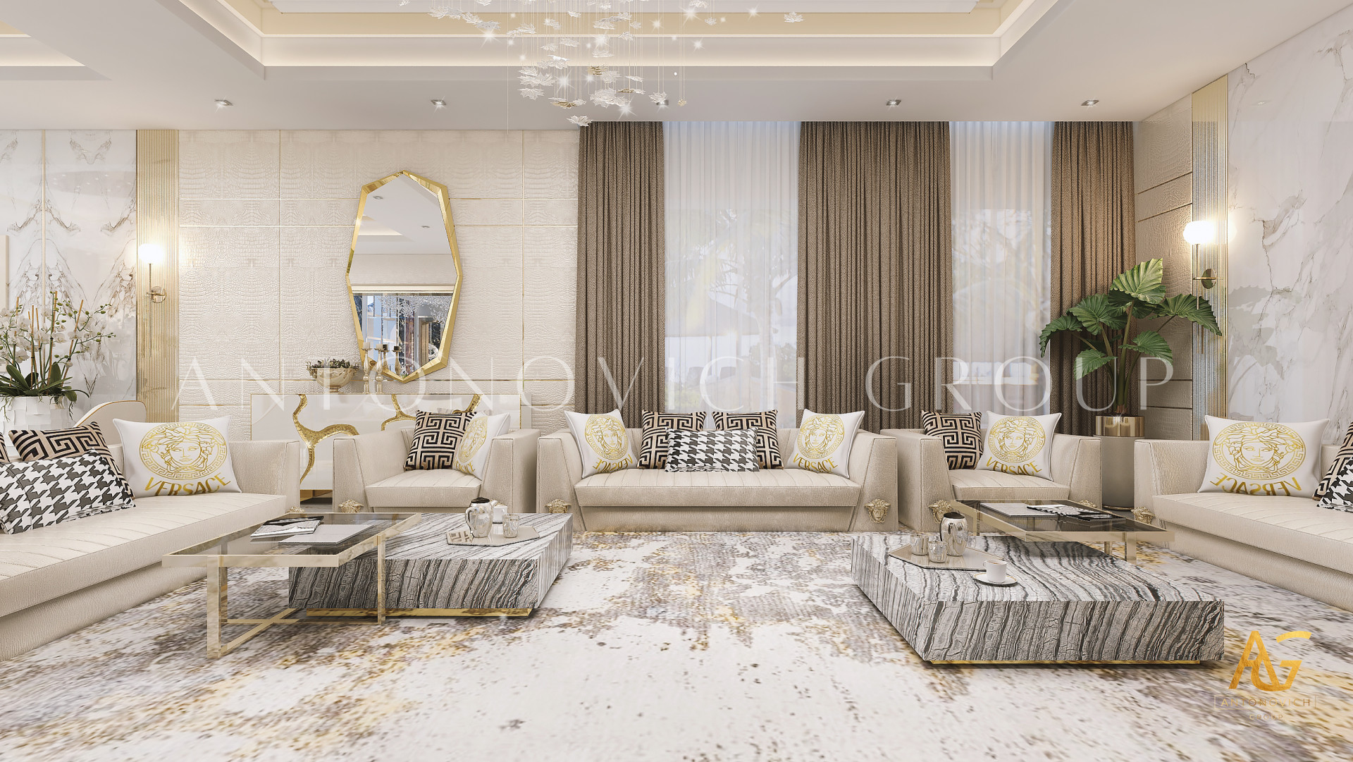 We pay a lot of attention to house architecture. House is a place where you find harmony, where you relax and spend time with your family. A modern studio of the design ideas offers the most original and fresh trends that are popular in the interior. The original design of the Majlis from Luxury Antonovich Design Company impresses with the beautiful colors - a combination of gray and turquoise colors. These colors inspire and give good emotions. The professionals of global renowned added Majlis a little wind, waves and clear sky to Majlis interior design. The design of the space has played with joyful colors. The turquoise color in the interior of Majlis gives the charm and uniqueness to the room. Grey tint envelops the room with comfort, making it more sophisticated. The geometric patterns on the floor and walls diluted a minimalistic style. The patterns are a certain highlight. Through a variety of options, the lines are perfectly combined with the interior. The geometric patterns help to create a space that looks modern. An upholstered furniture is made from the high quality materials and its beautiful view shows a sophisticated design taste of the homeowners. An essential attribute of any interior is the chandelier. The look of the whole interior depends on the selected chandelier. The masters of their craft selected quite an unusual chandelier, which catches the views of others. You will spend your free time with pleasure in such atmosphere, gain strength and energy every day. Majlis is a place that inspires.