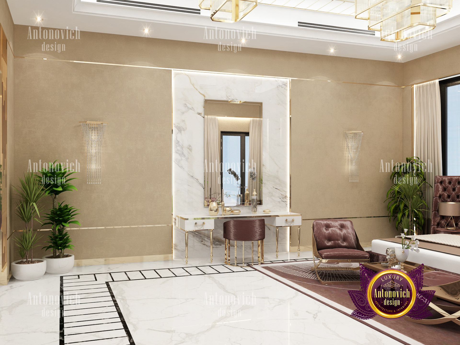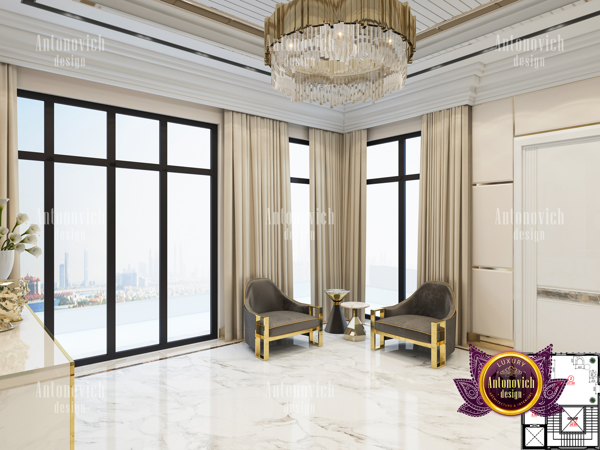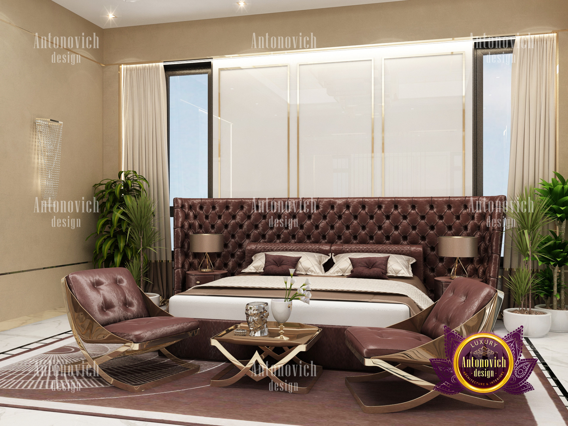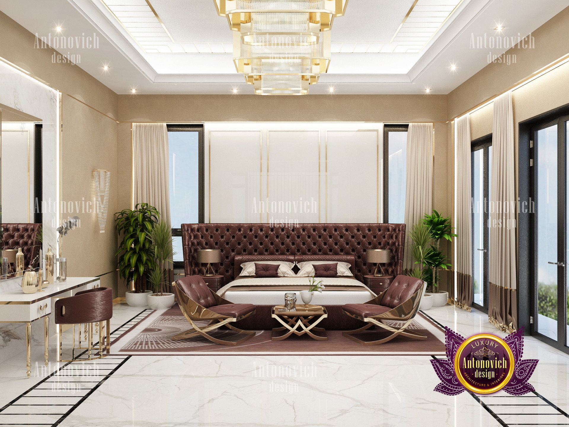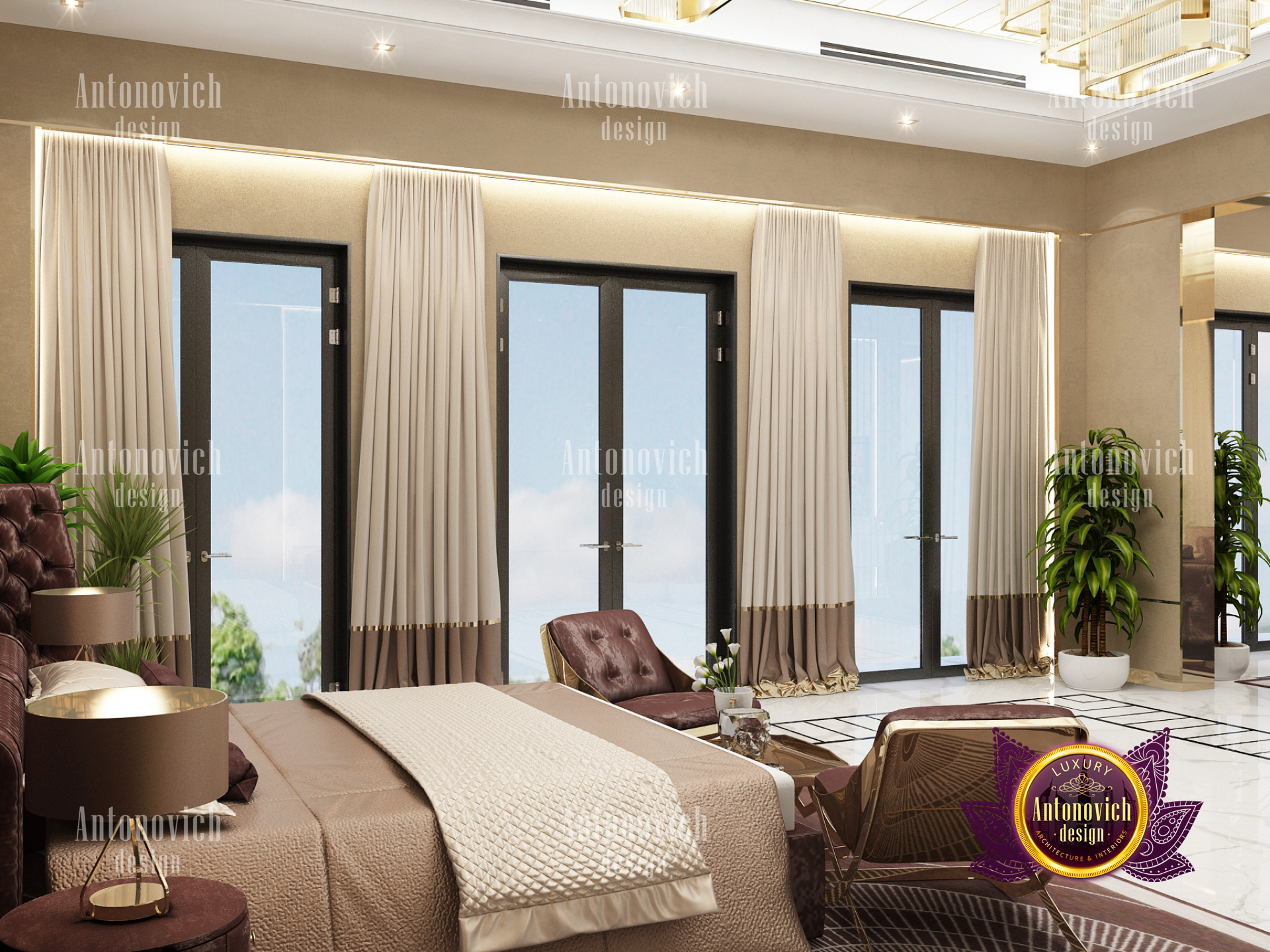 A bedroom is full of luxurious elements that you and your family require. It has every piece of furniture required for a luxurious bedroom. The gold embellishments are very stunning. The bed is stunning on its own. One of the most beautiful headboards weve ever made. The bedsheets are likewise adorned with opulent embellishments. A nice bedroom with a great Dubai Hills view is something that everyone wishes for. This magnificent design, designed by the countrys greatest interior designer, Luxury Antonovich Design, oozes class and elegance. The view from the bedroom is spectacular, and waking up to such opulence is a dream come true.