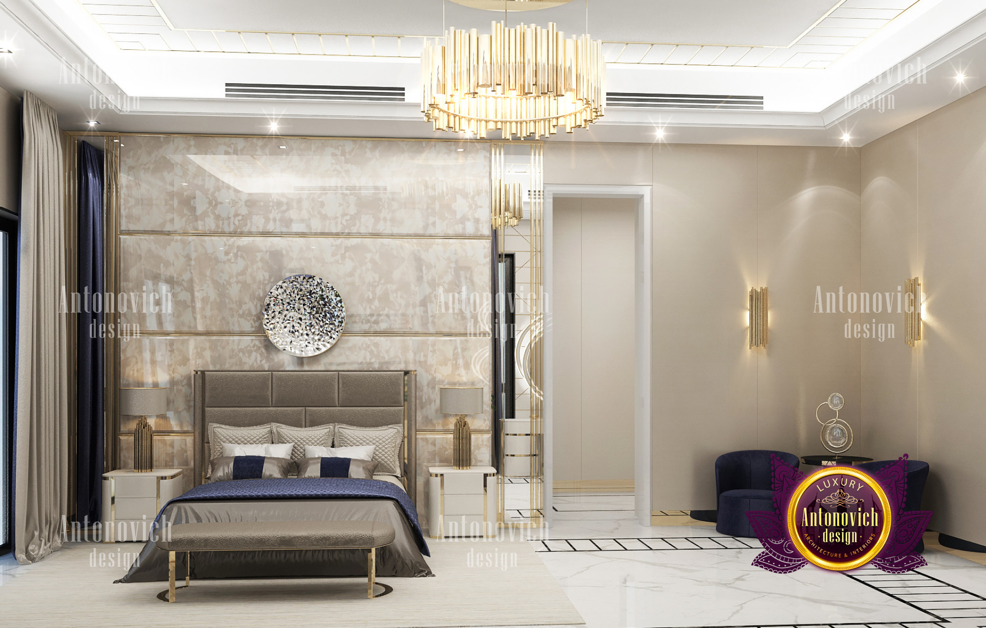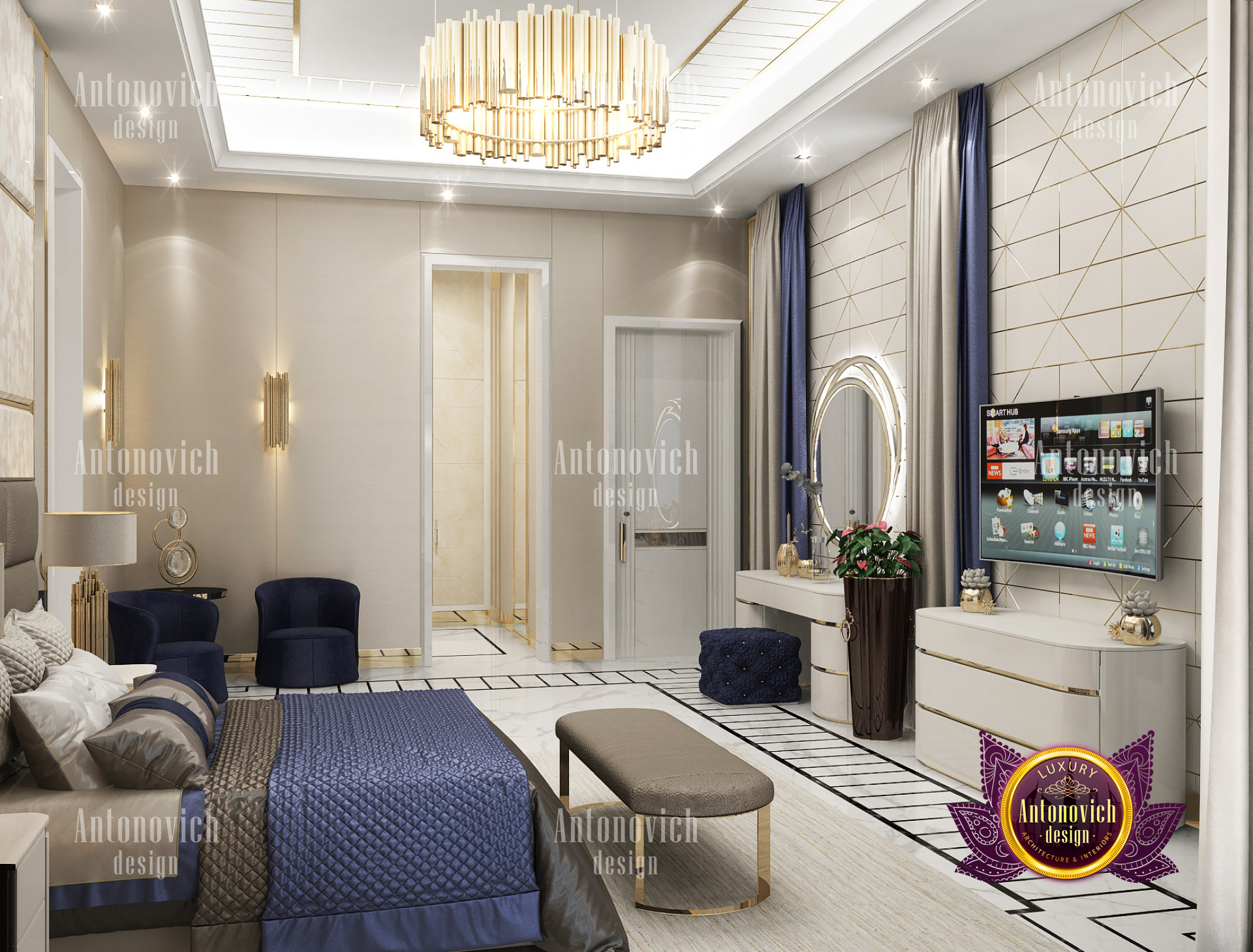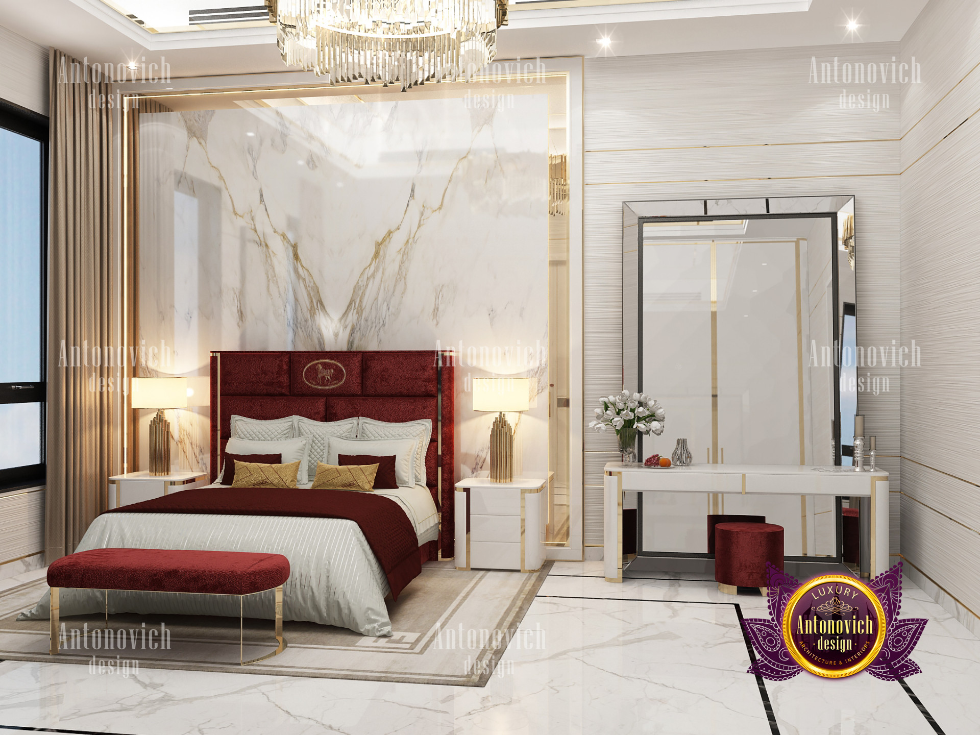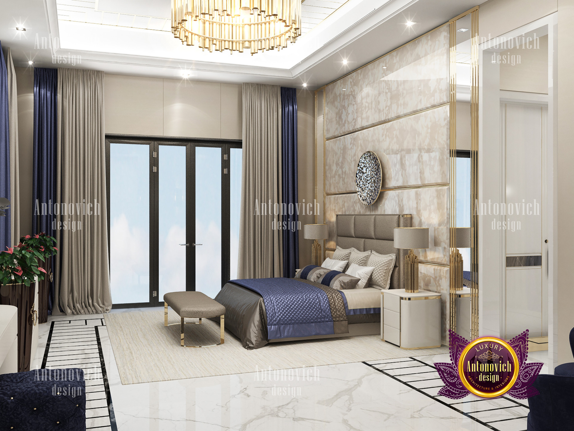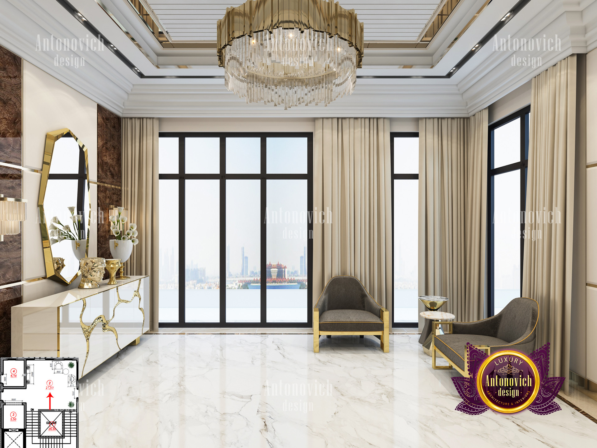 A bedroom is full of luxurious elements that you and your family require. It has every piece of furniture required for a luxurious bedroom. The gold embellishments are very stunning. The bed is stunning on its own. One of the most beautiful headboards weve ever made. The bedsheets are likewise adorned with opulent embellishments. A nice bedroom with a great Dubai Hills view is something that everyone wishes for. This magnificent design, designed by the countrys greatest interior designer, Luxury Antonovich Design, oozes class and elegance. The view from the bedroom is spectacular, and waking up to such opulence is a dream come true.