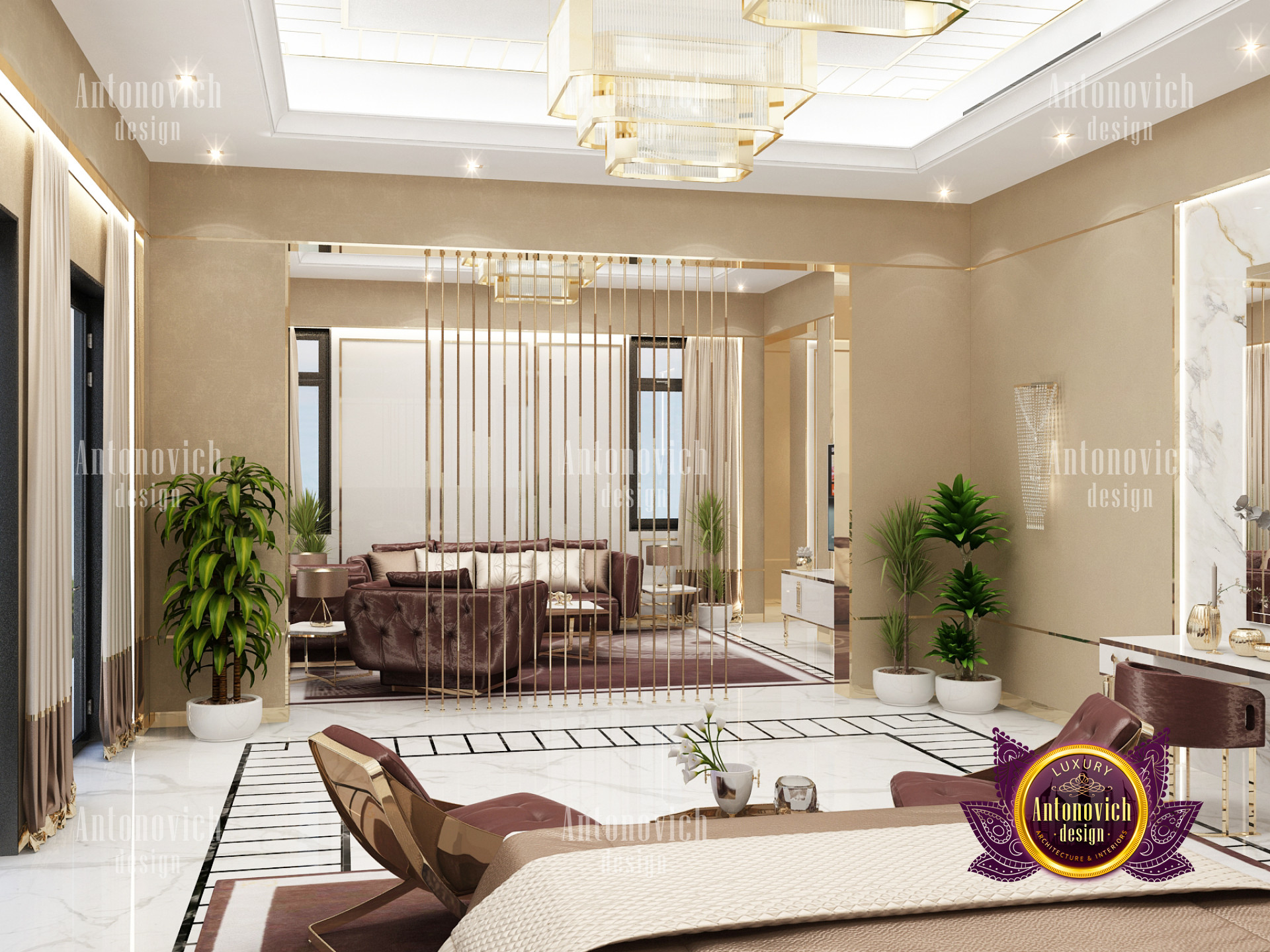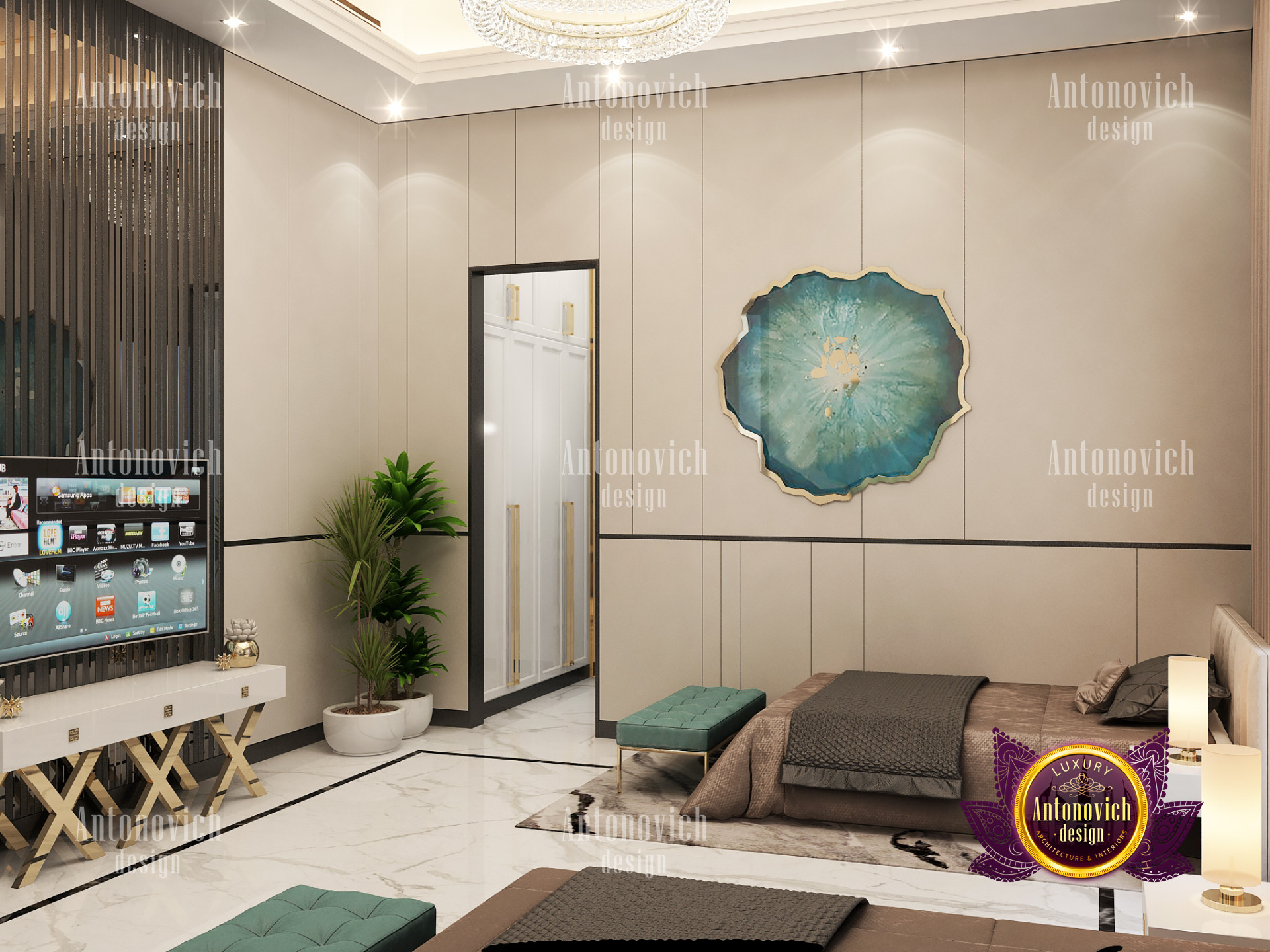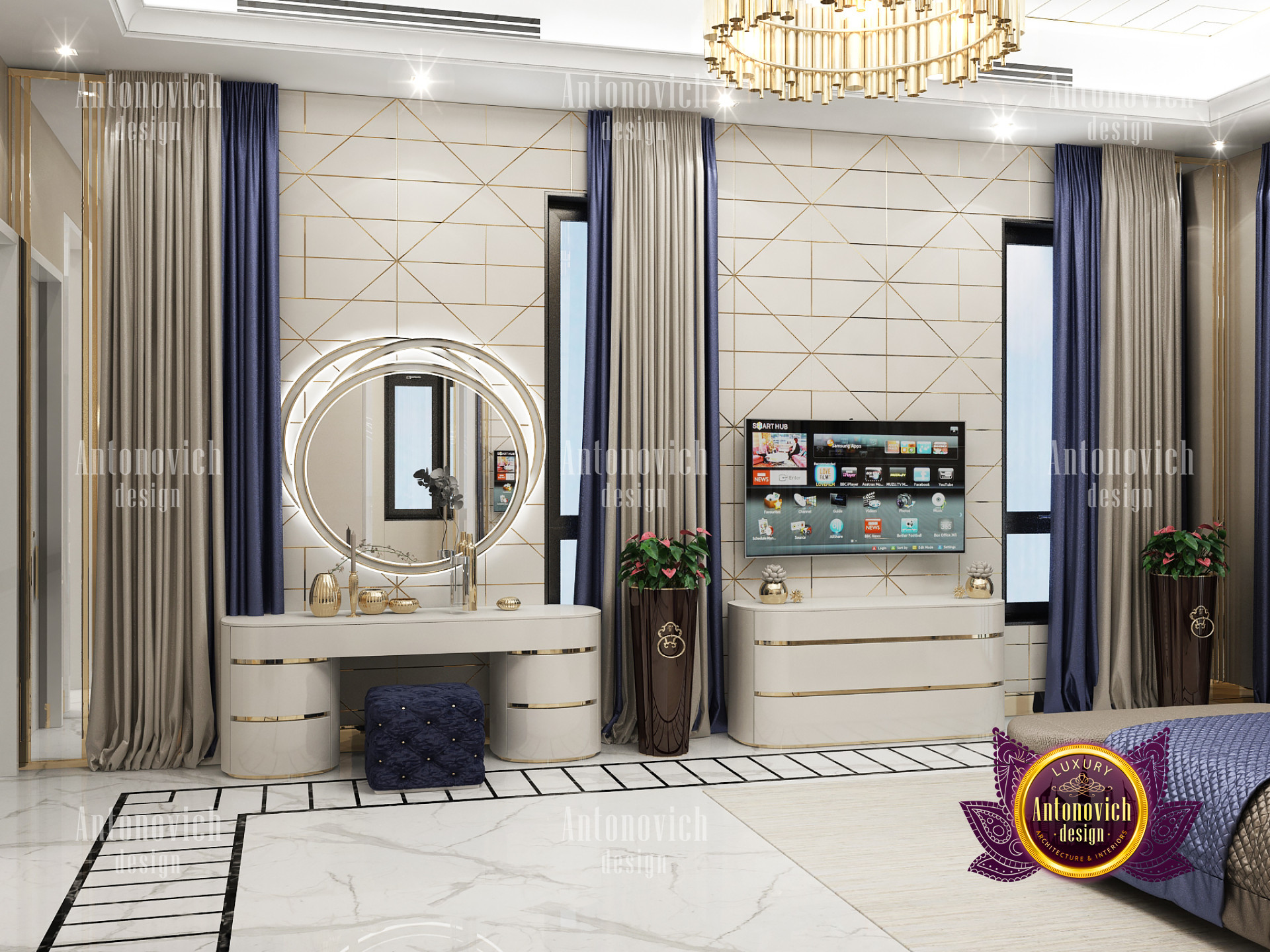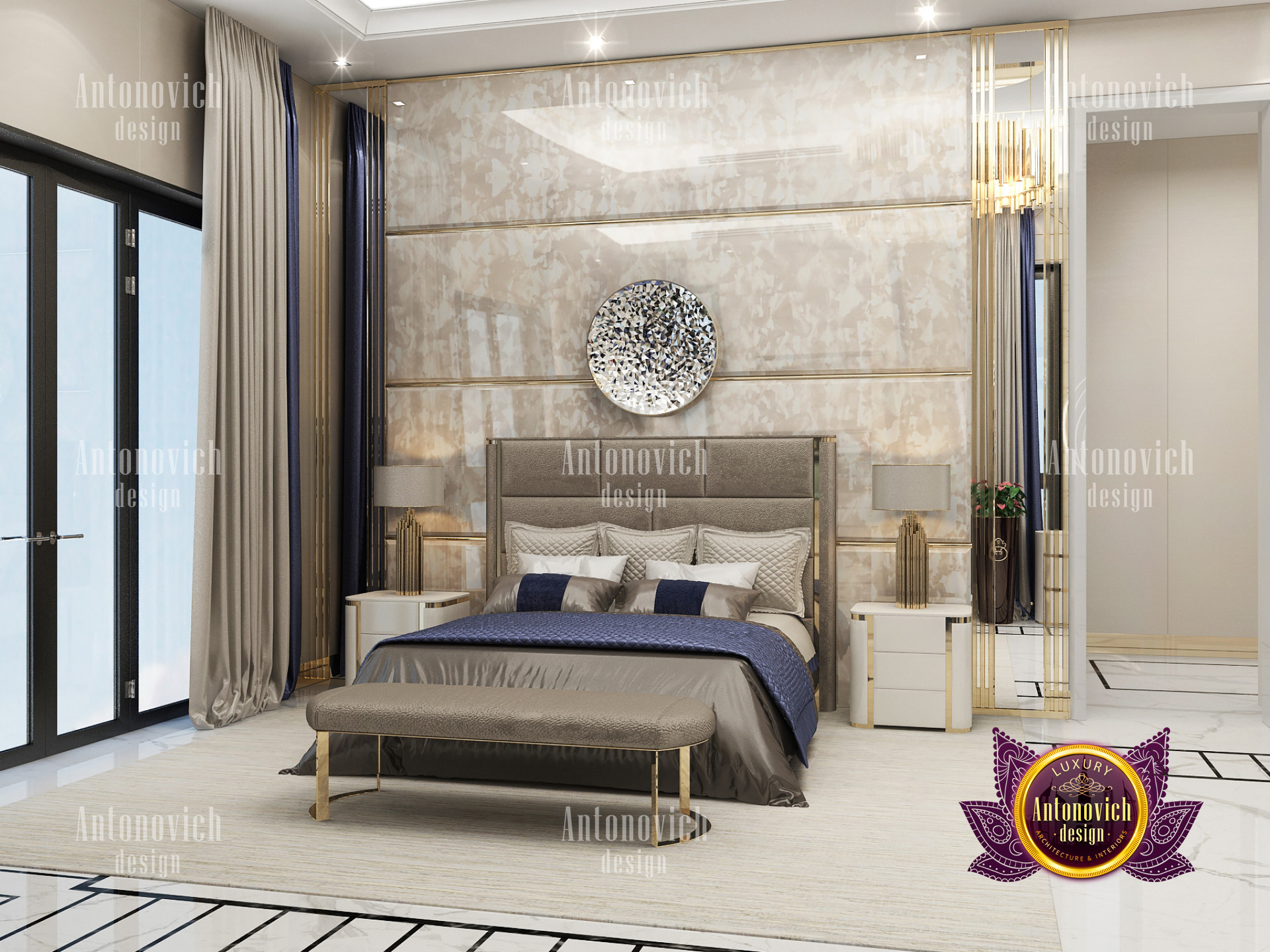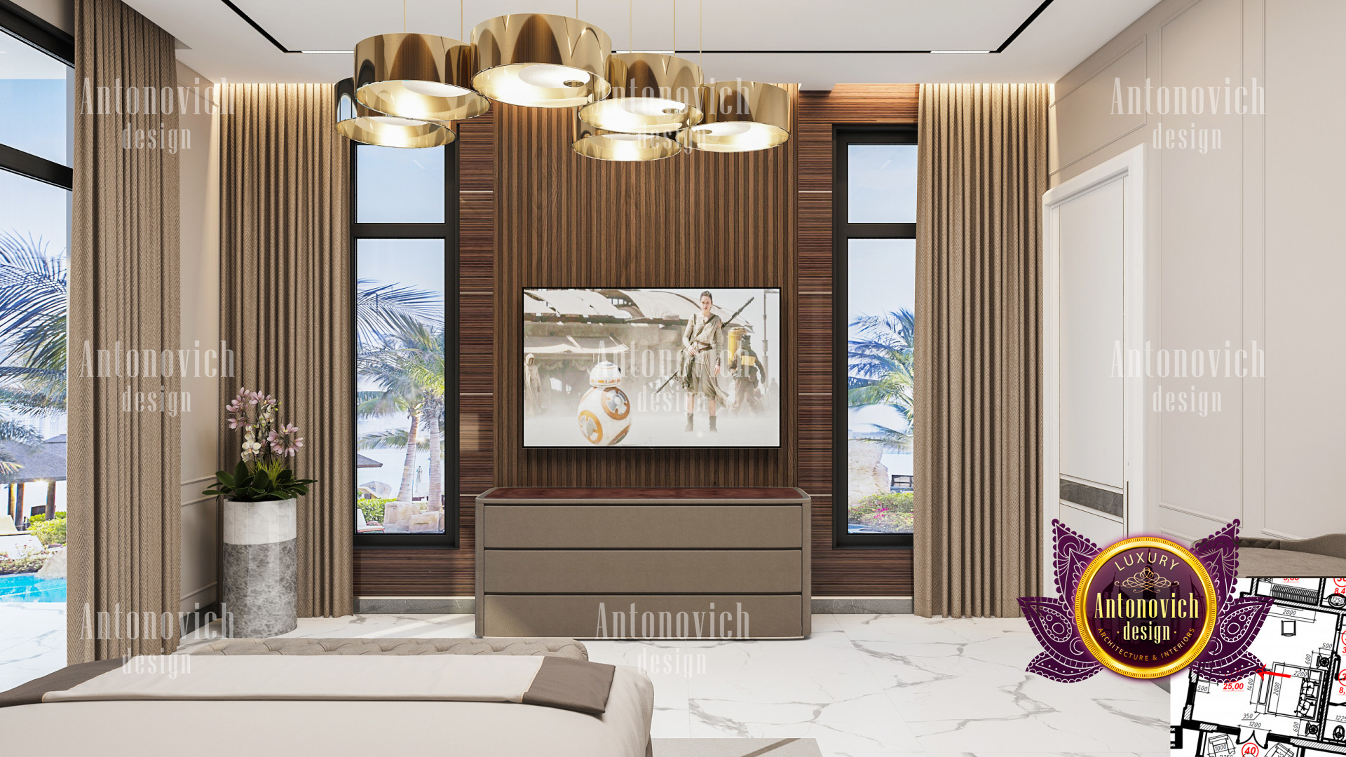 A bedroom is full of luxurious elements that you and your family require. It has every piece of furniture required for a luxurious bedroom. The gold embellishments are very stunning. The bed is stunning on its own. One of the most beautiful headboards weve ever made. The bedsheets are likewise adorned with opulent embellishments. A nice bedroom with a great Dubai Hills view is something that everyone wishes for. This magnificent design, designed by the countrys greatest interior designer, Luxury Antonovich Design, oozes class and elegance. The view from the bedroom is spectacular, and waking up to such opulence is a dream come true.
