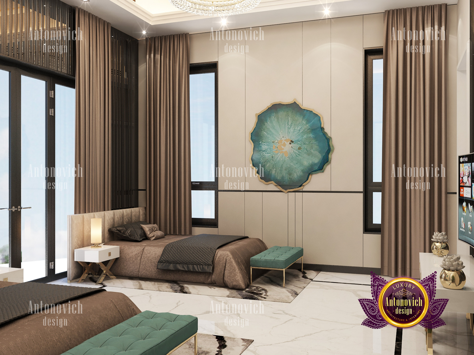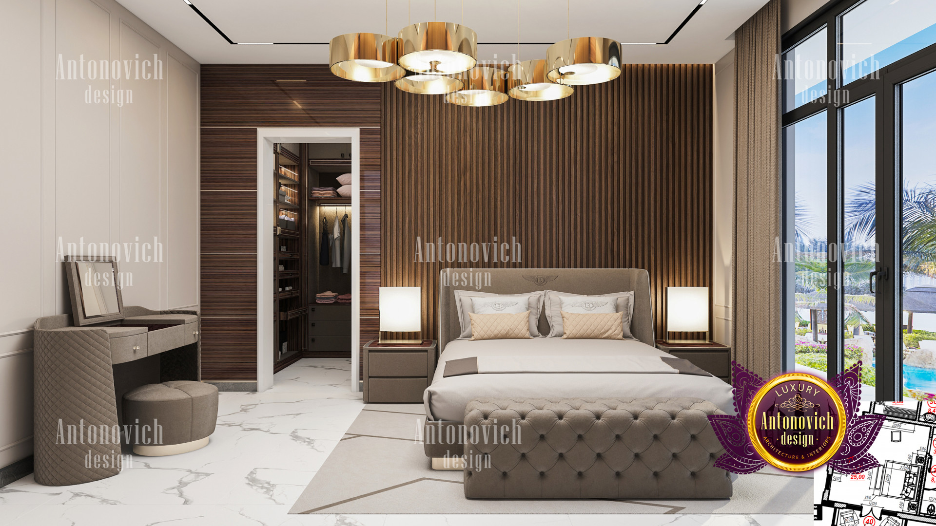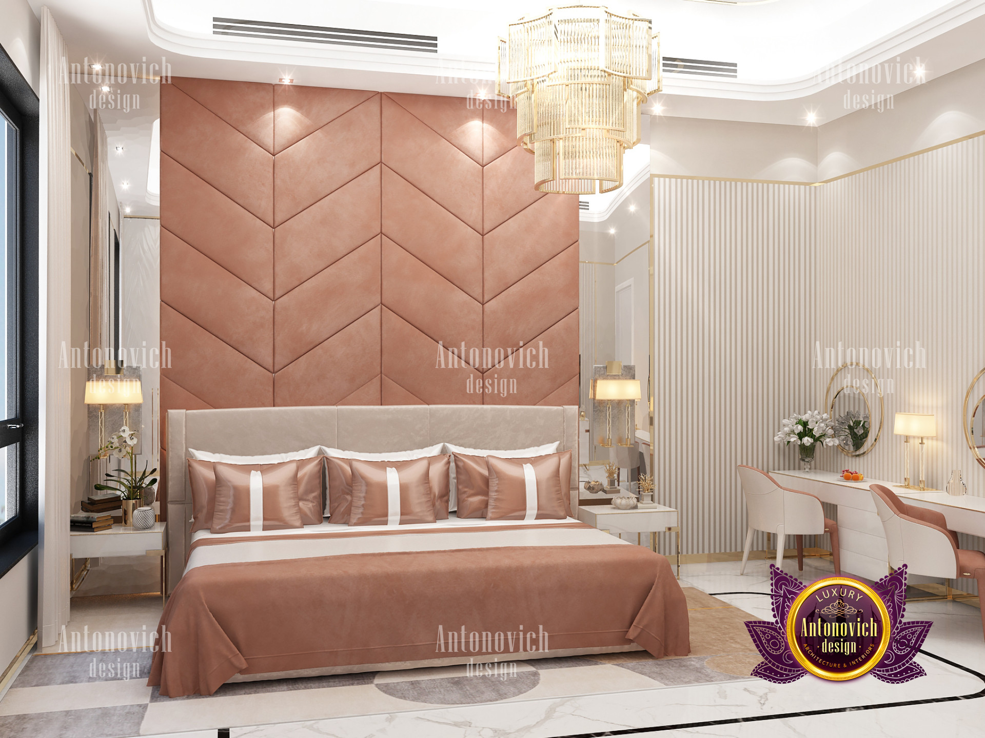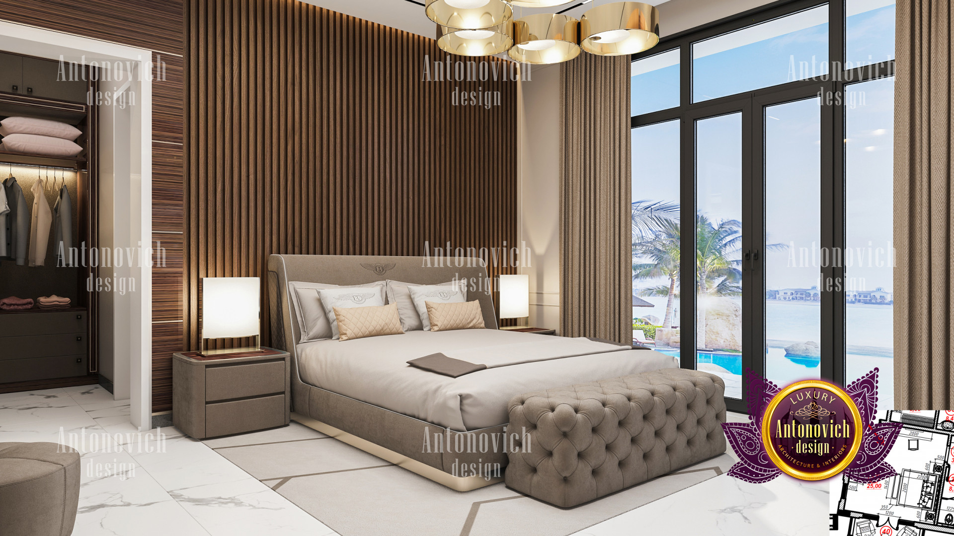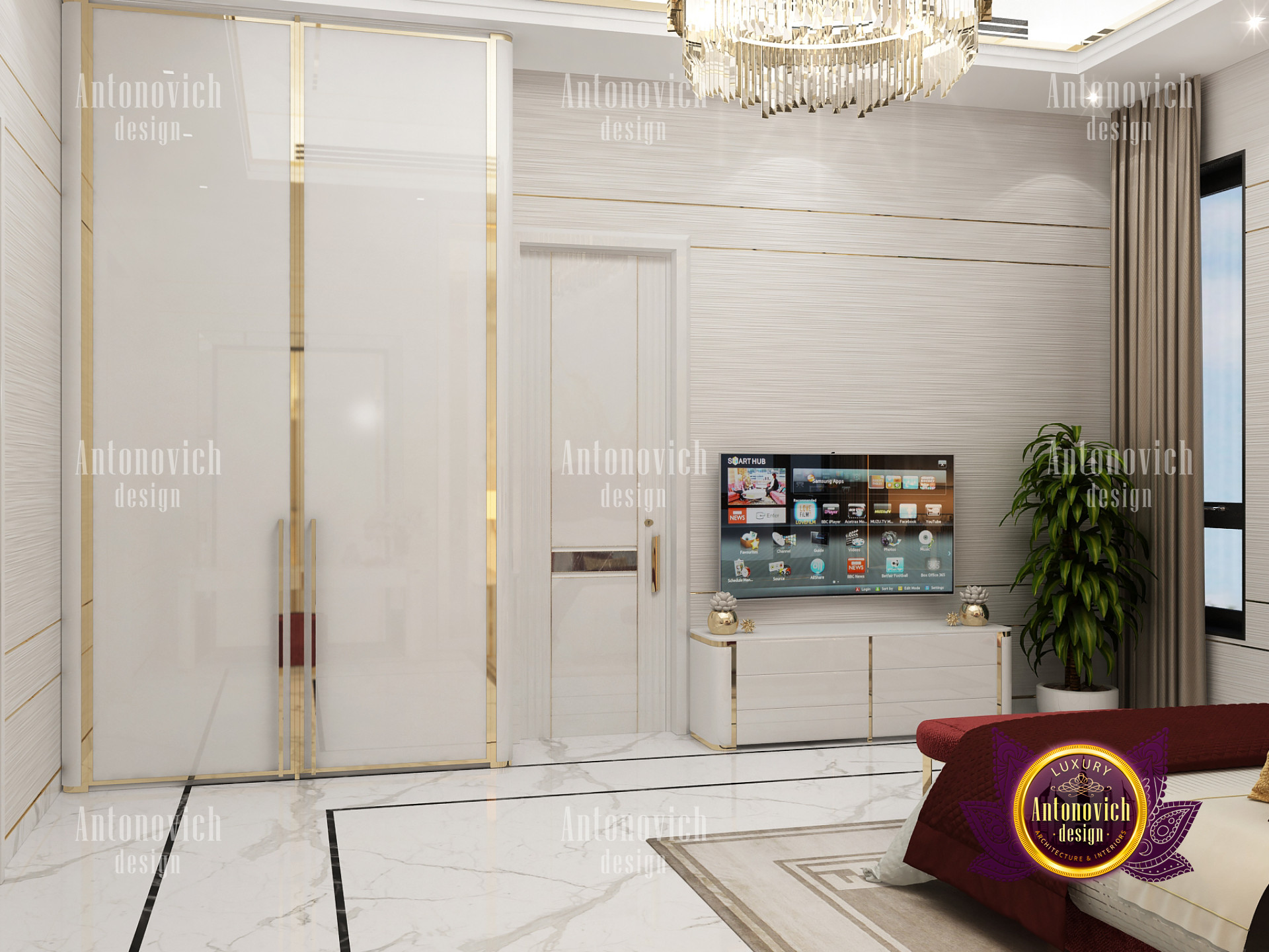 A bedroom is full of luxurious elements that you and your family require. It has every piece of furniture required for a luxurious bedroom. The gold embellishments are very stunning. The bed is stunning on its own. One of the most beautiful headboards weve ever made. The bedsheets are likewise adorned with opulent embellishments. A nice bedroom with a great Dubai Hills view is something that everyone wishes for. This magnificent design, designed by the countrys greatest interior designer, Luxury Antonovich Design, oozes class and elegance. The view from the bedroom is spectacular, and waking up to such opulence is a dream come true.