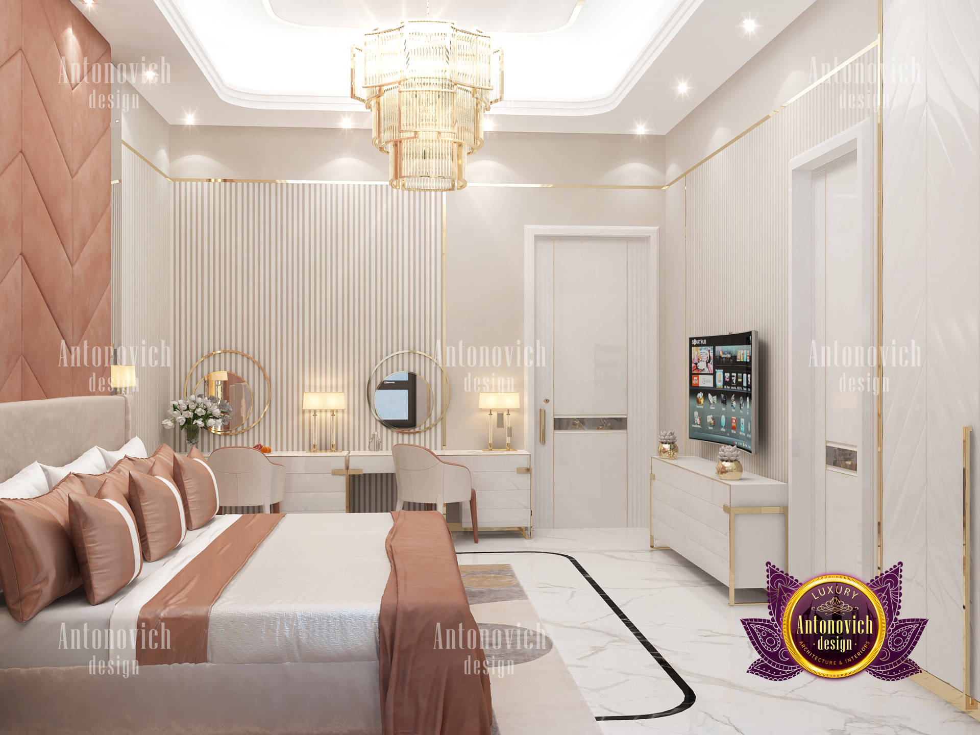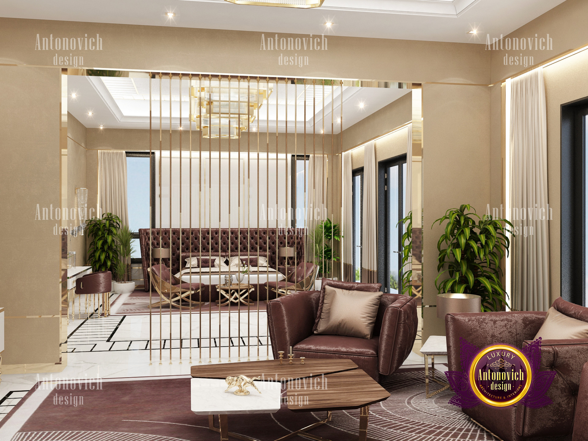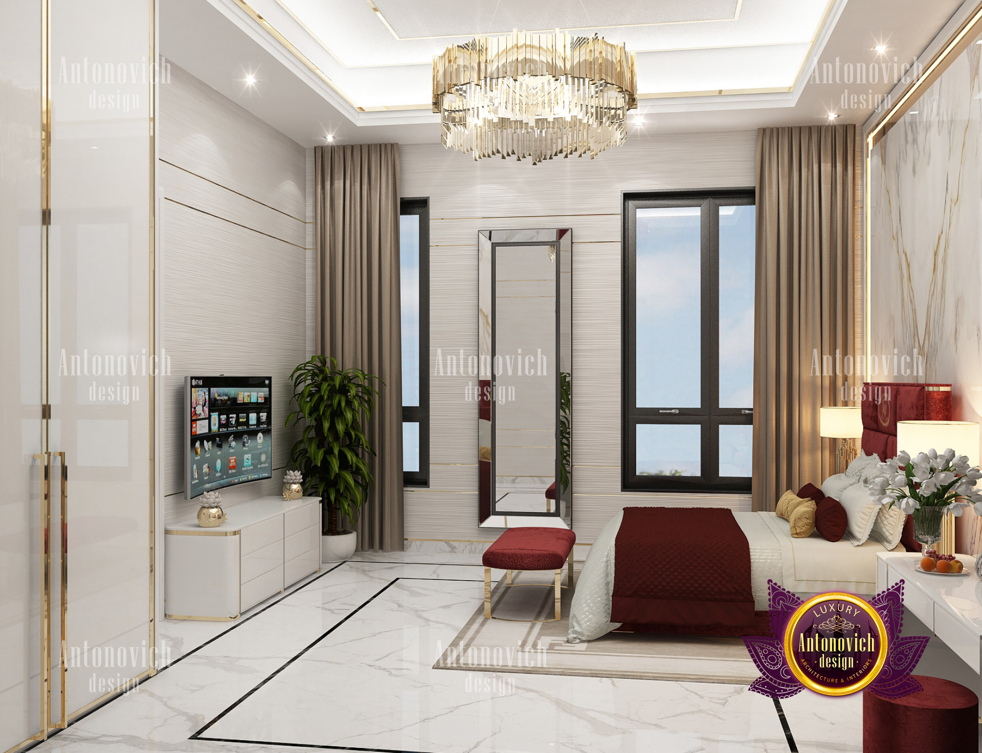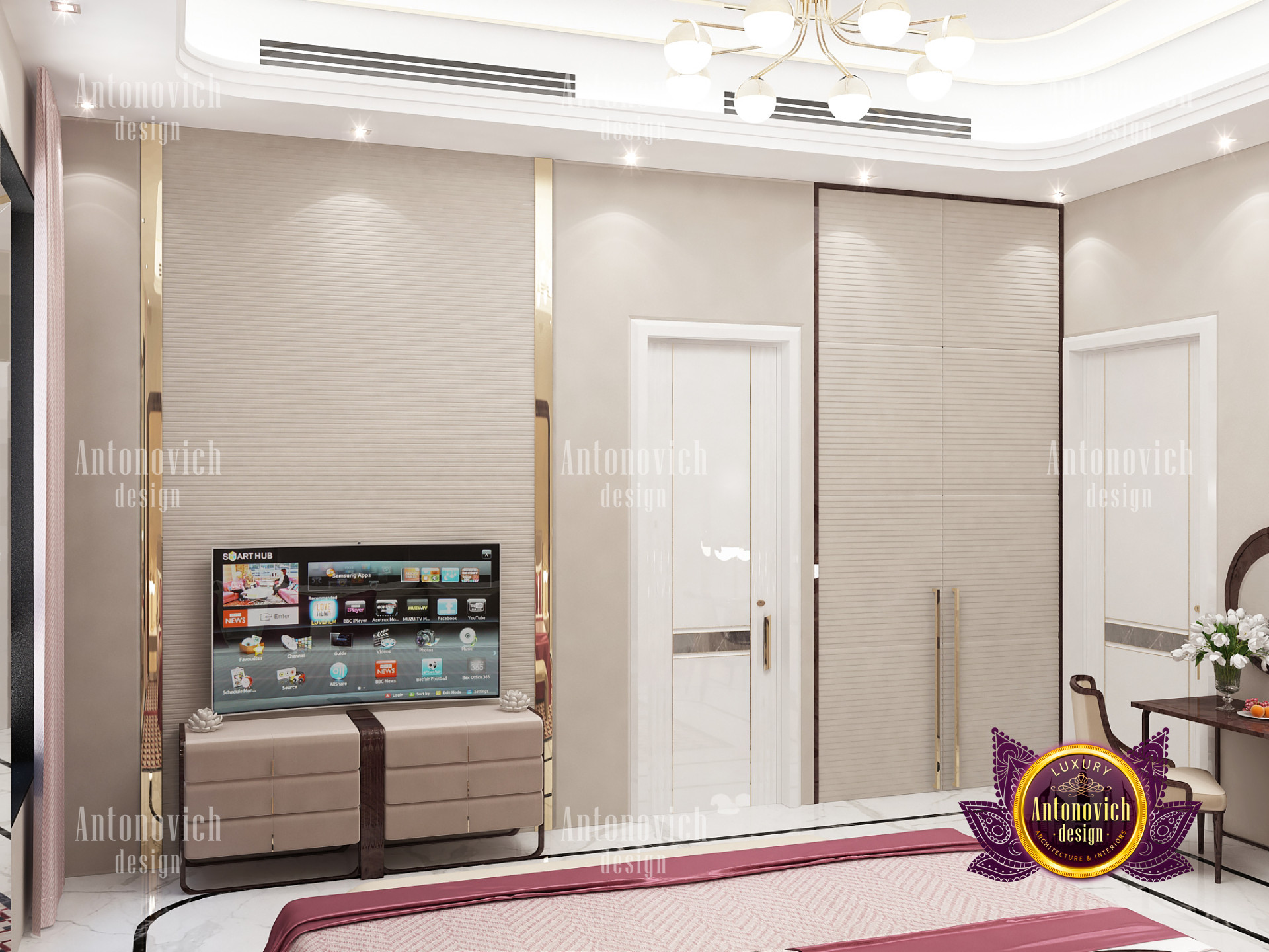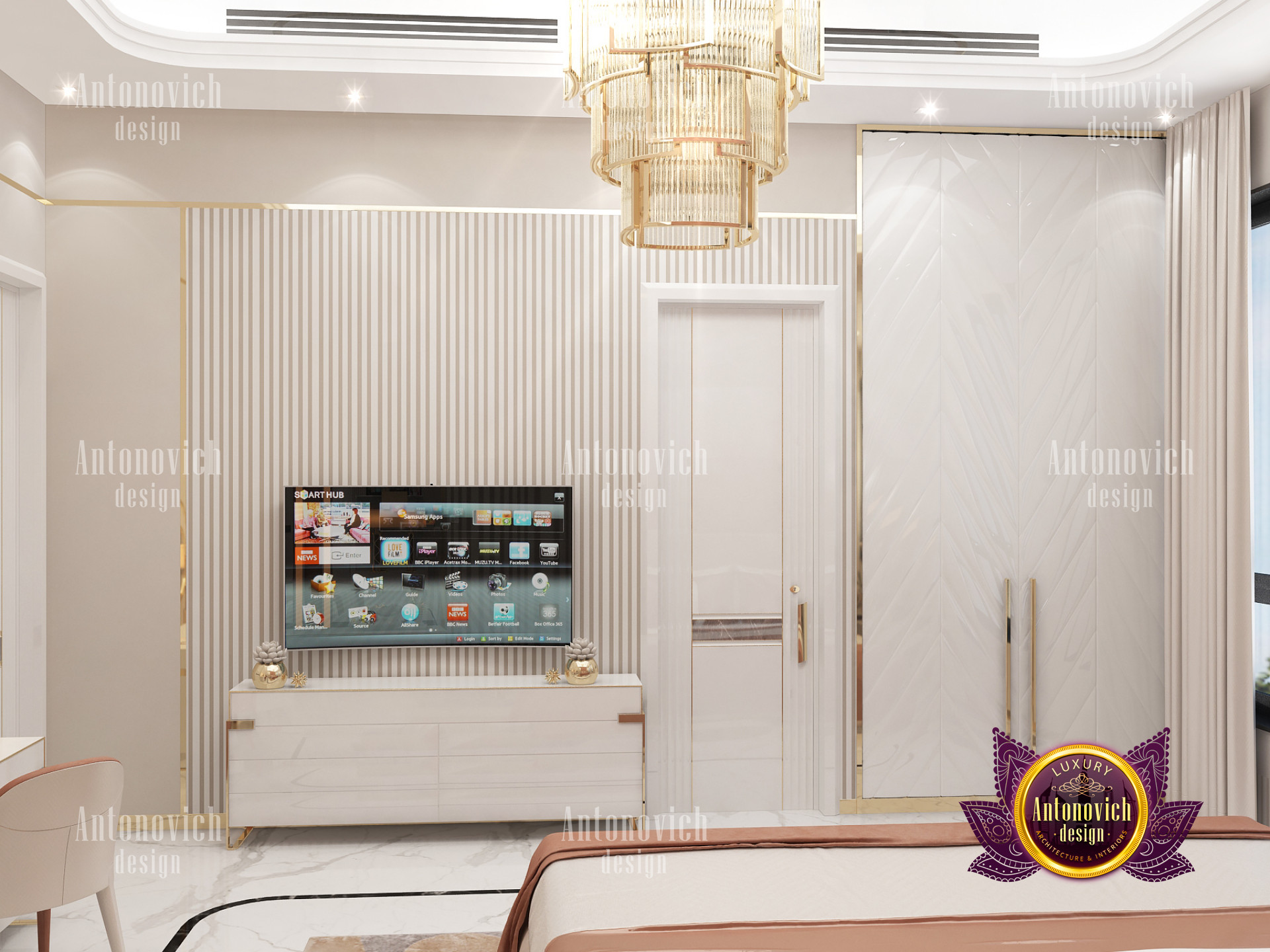 A bedroom is full of luxurious elements that you and your family require. It has every piece of furniture required for a luxurious bedroom. The gold embellishments are very stunning. The bed is stunning on its own. One of the most beautiful headboards weve ever made. The bedsheets are likewise adorned with opulent embellishments. A nice bedroom with a great Dubai Hills view is something that everyone wishes for. This magnificent design, designed by the countrys greatest interior designer, Luxury Antonovich Design, oozes class and elegance. The view from the bedroom is spectacular, and waking up to such opulence is a dream come true.