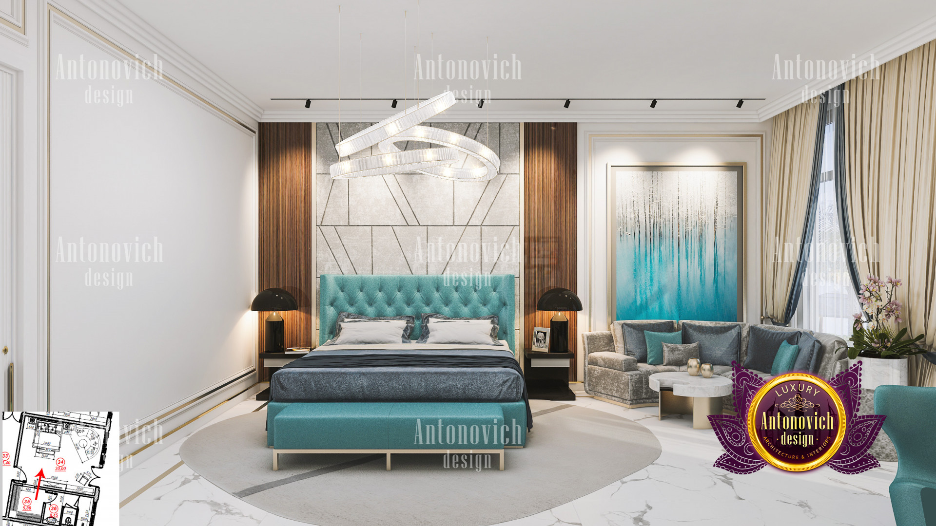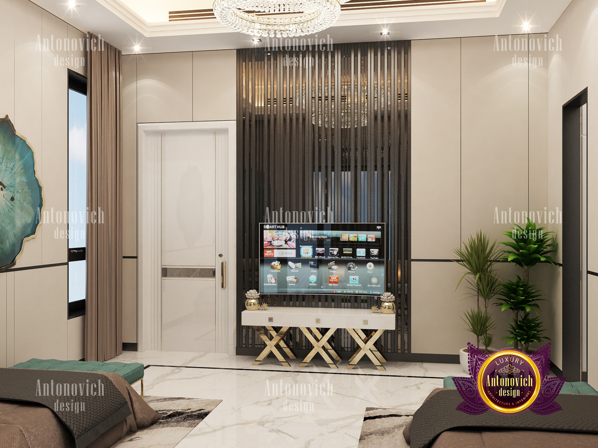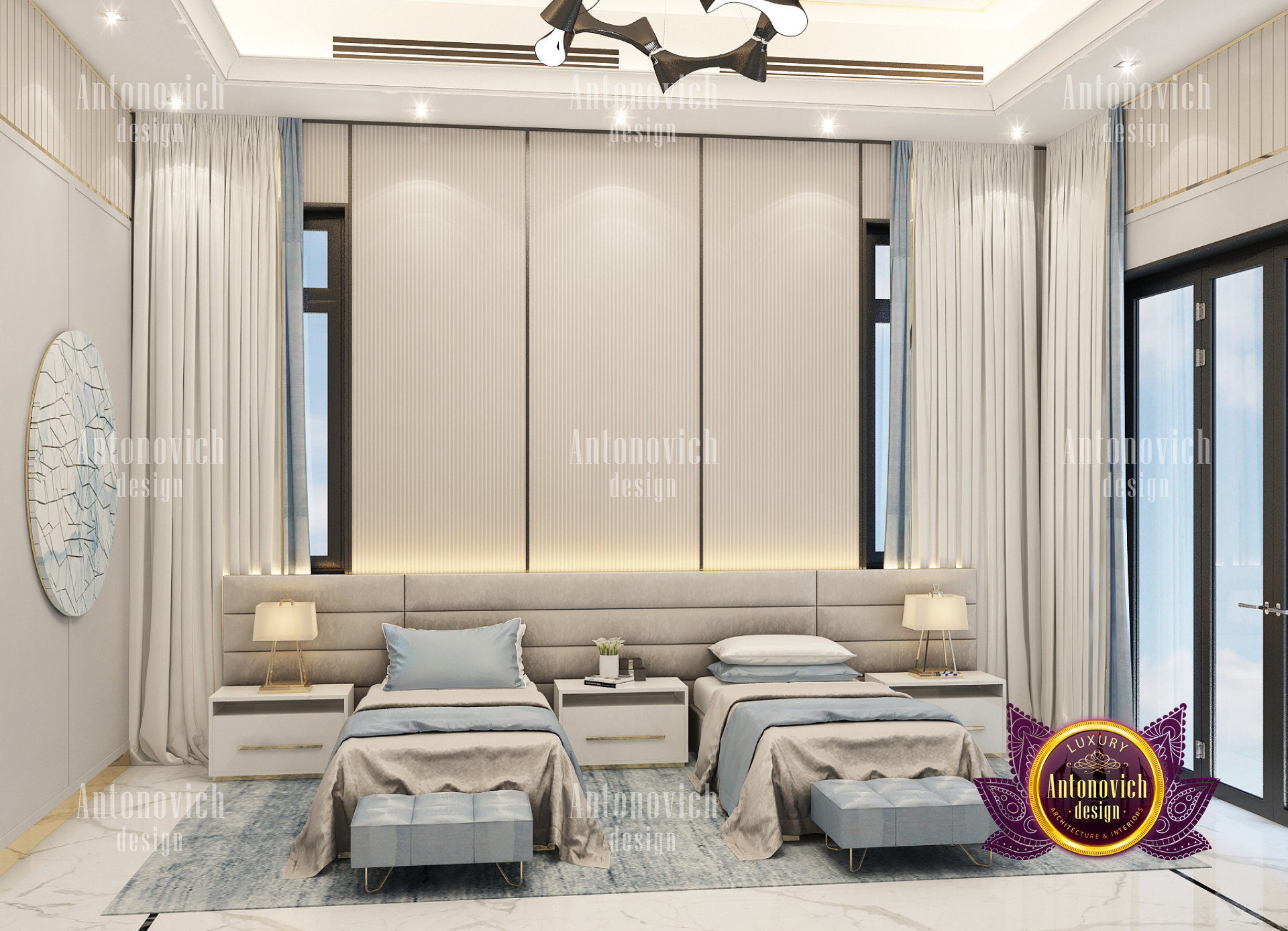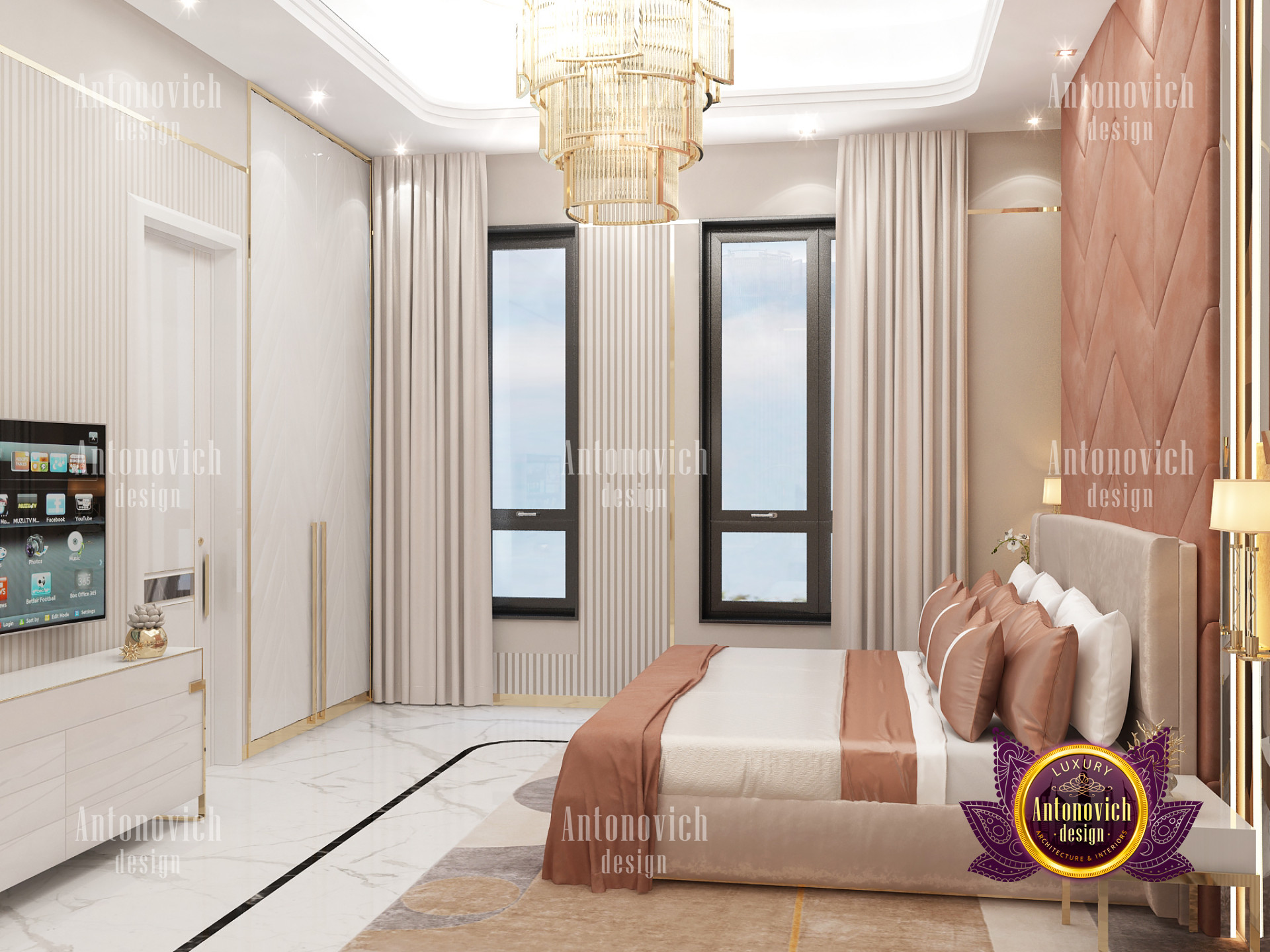 A bedroom is full of luxurious elements that you and your family require. It has every piece of furniture required for a luxurious bedroom. The gold embellishments are very stunning. The bed is stunning on its own. One of the most beautiful headboards weve ever made. The bedsheets are likewise adorned with opulent embellishments. A nice bedroom with a great Dubai Hills view is something that everyone wishes for. This magnificent design, designed by the countrys greatest interior designer, Luxury Antonovich Design, oozes class and elegance. The view from the bedroom is spectacular, and waking up to such opulence is a dream come true.