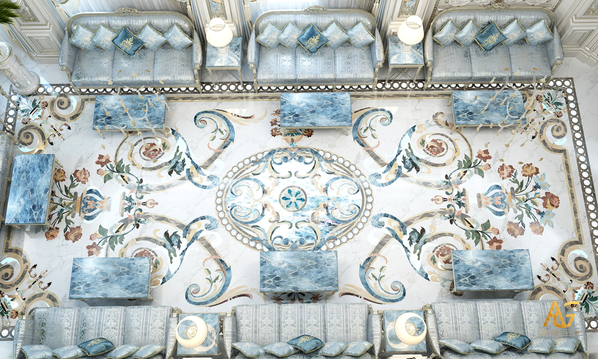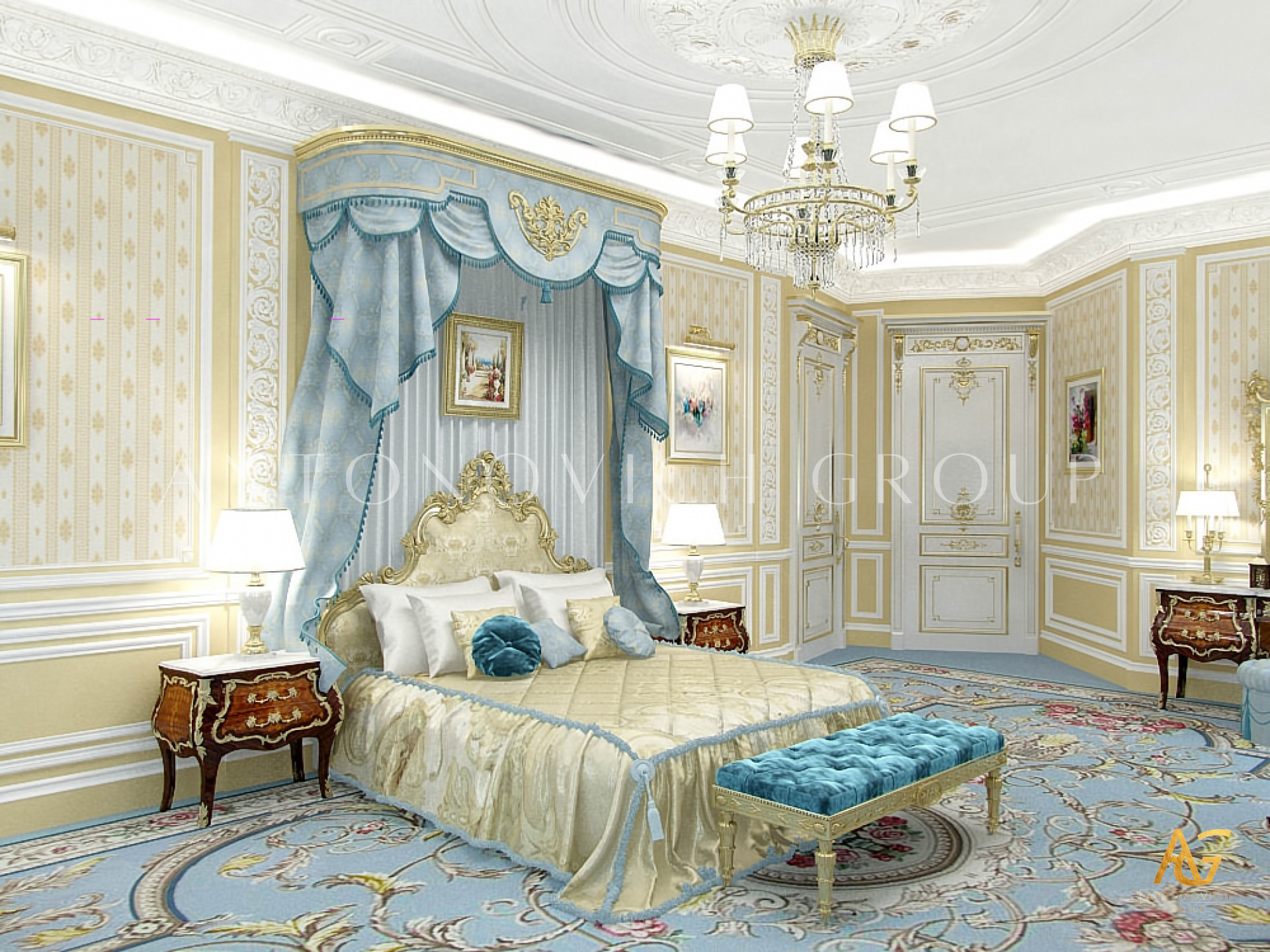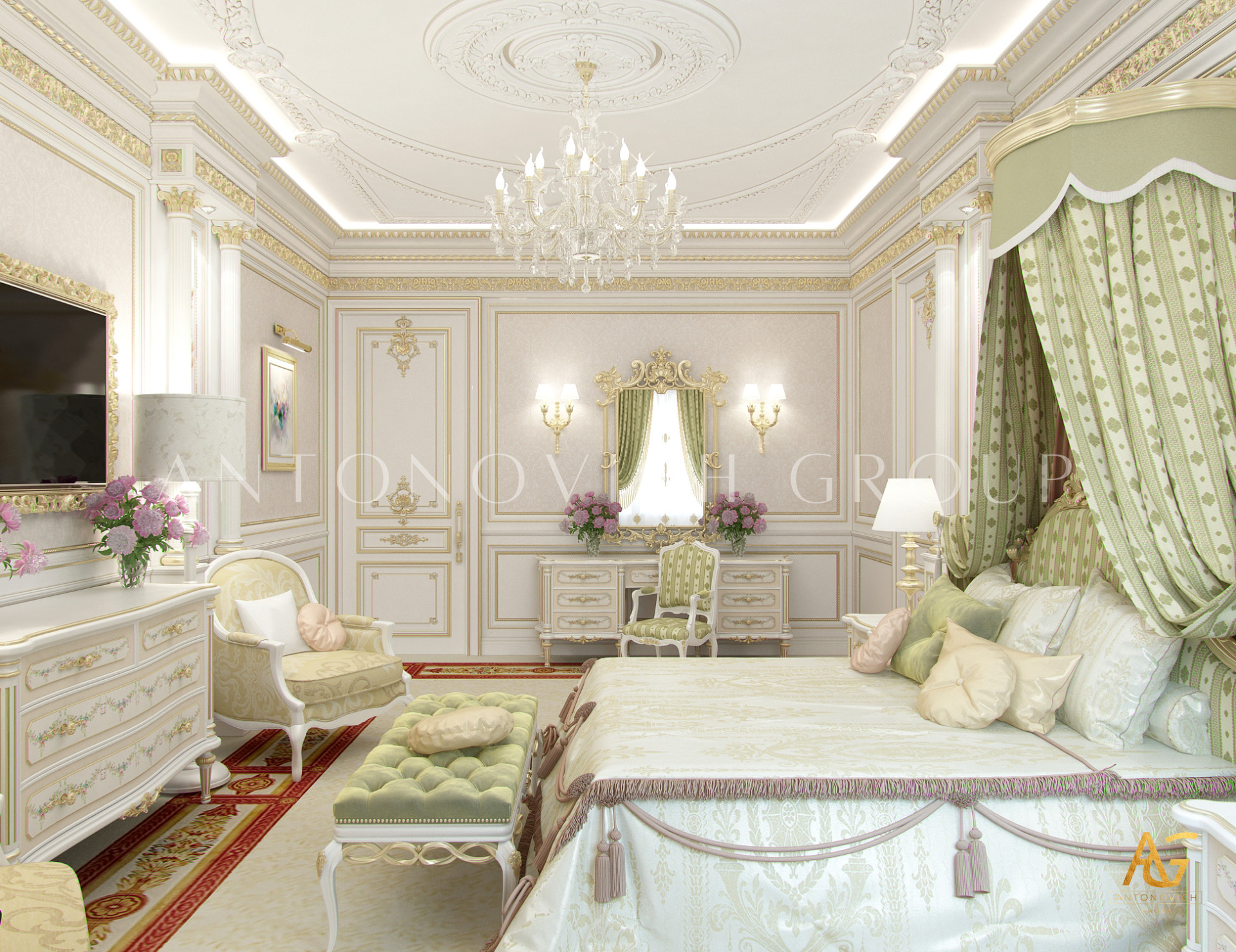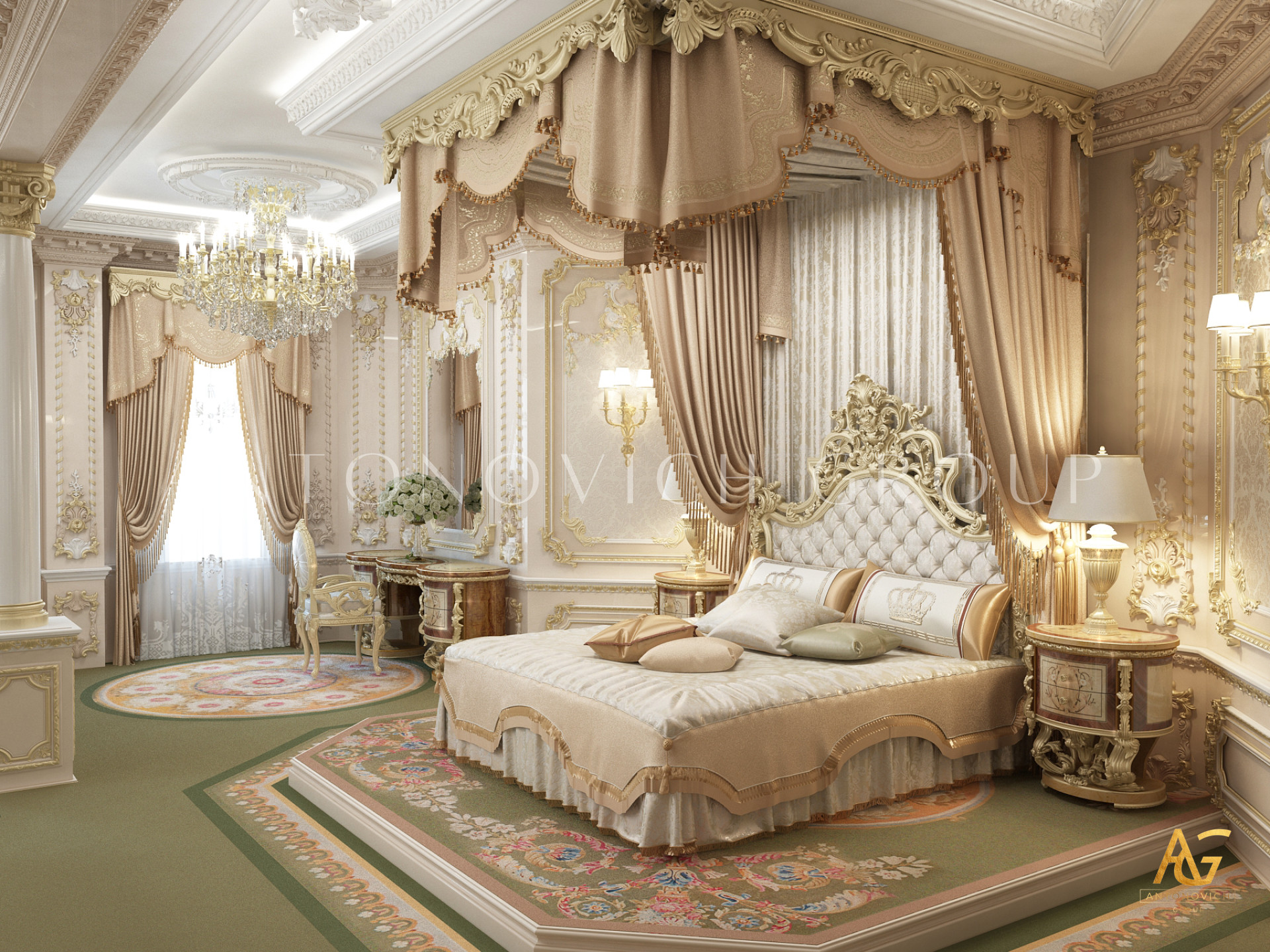 One of Antonovich Group’s hallmarks is their ability to produce custom luxury furniture tailored to each project. For this villa, the furniture collection was designed in-house, featuring carved wooden frames, damask upholstery, and gilded finishes. Each piece was created to complement the villa’s overall design theme while ensuring comfort and durability.