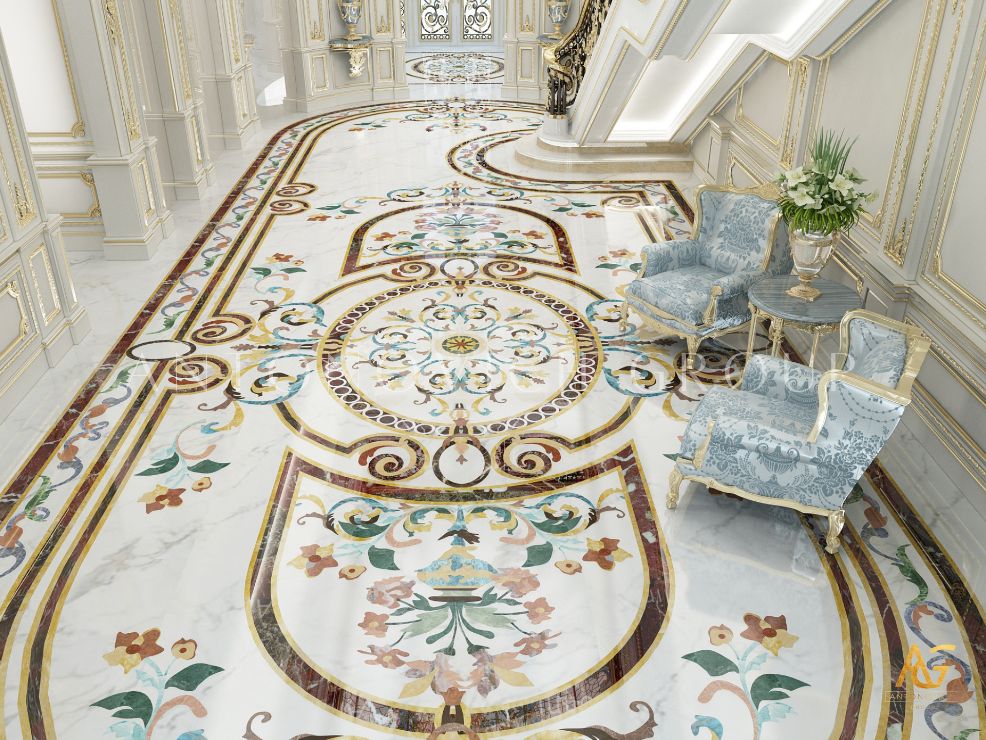 The company’s team of world-class designers curated a palette of soft neutrals, gold accents, and rich textures for the villa. Luxurious fabrics like silk and velvet complement marble floors and carved woodwork, while delicate ceiling moldings elevate the sophistication of each room. Every space—from the formal living room to the private suites—was designed to reflect both elegance and functionality.