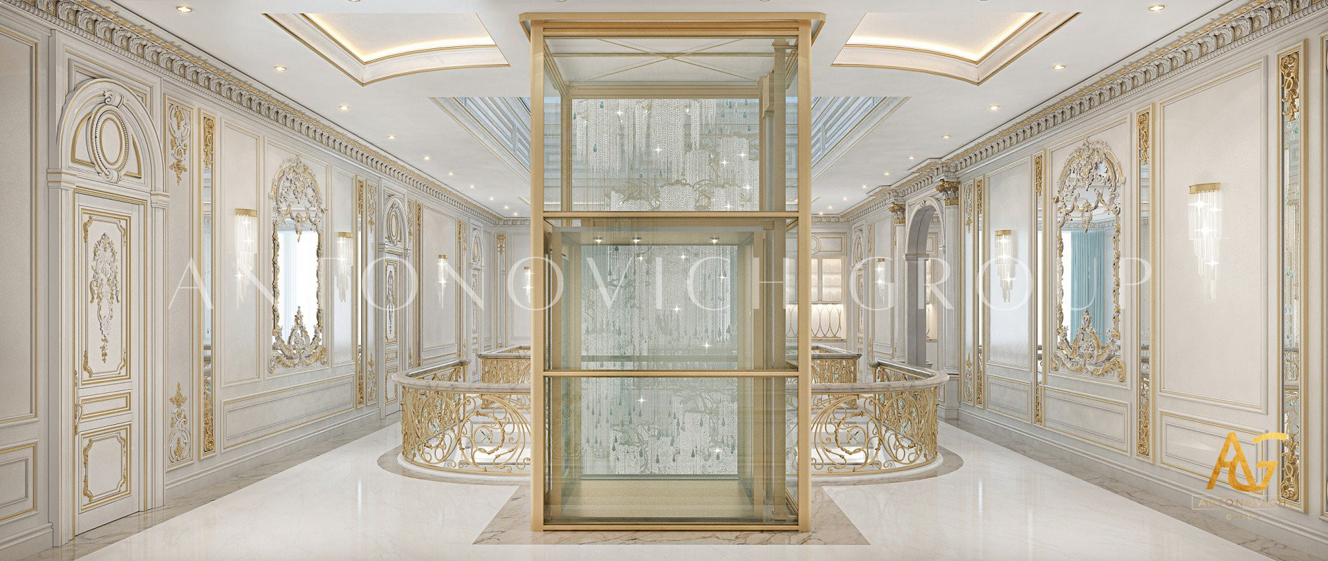 The staircase design is one of the most awaited interior design features in every luxury villa. With a great balance in spaces, Luxury Antonovich Design has been very well decorated the most glamorous staircase design in a golden trail and handle. It has the most splendid touch of elegance having a customized chandelier which is being installed upon it. The perfect elegance and dramatic design have been continuously implemented up to the first floor which has an overlooking setup. A very stylish and elegant elevator has been placed a crossed the staircase for alternative use, most especially for the elder member of the family.