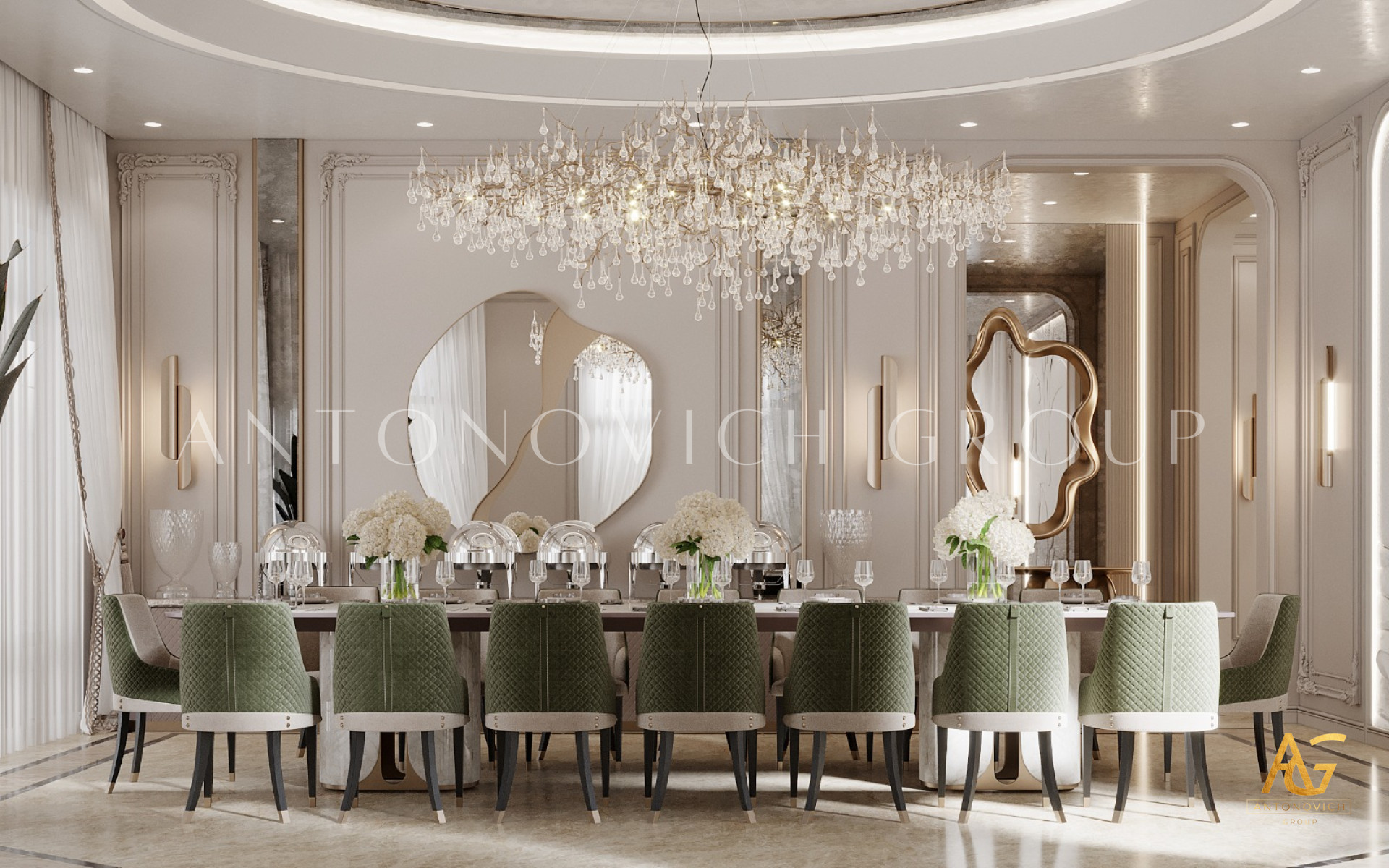 An exclusive and luxurious villa of modern design from Luxury Antonovich Design with an elevator, the interior of which is an exceptional living room, an amazing dining room and bedroom and space for relaxing with exquisite furniture. The interior is simply gorgeous, with great brightness thanks to large windows and superb decor, with unique items that you fall in love with at first sight. Because of the large number of rooms, it is ideal for large groups or several families who want to be together.