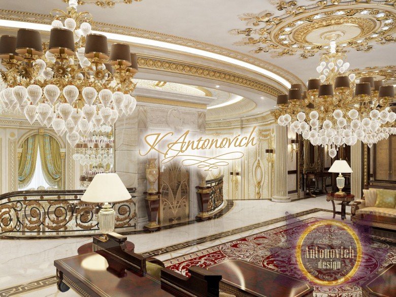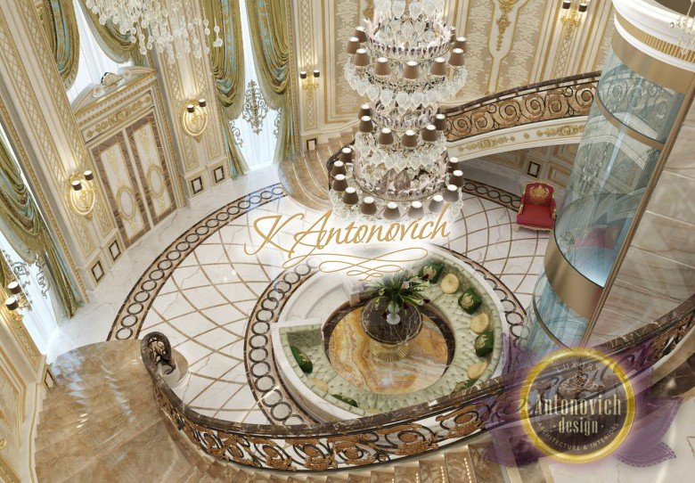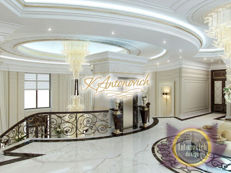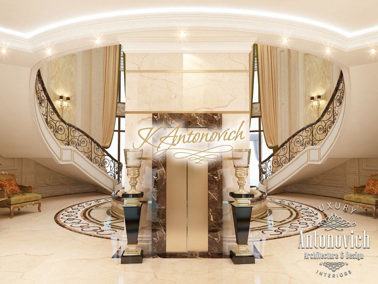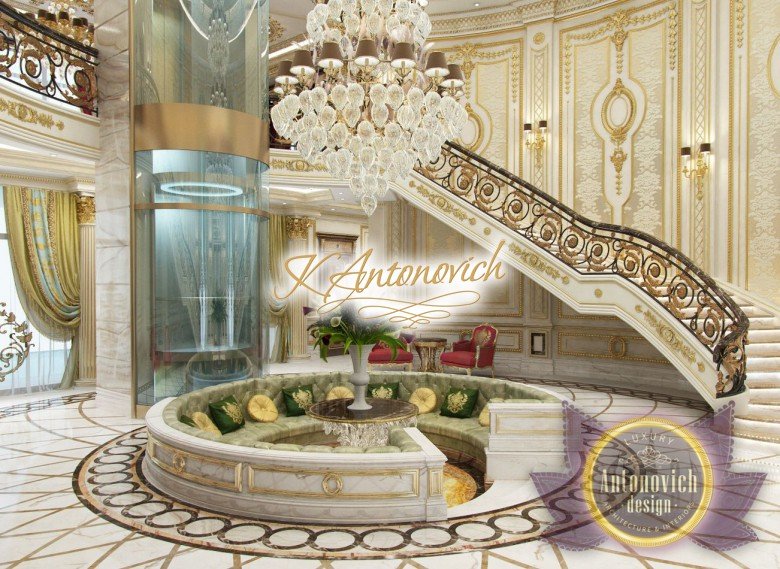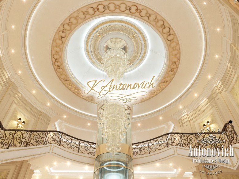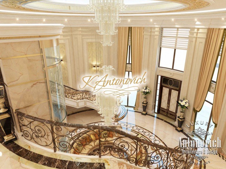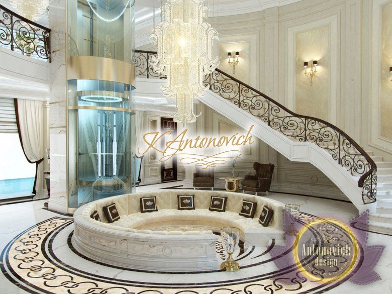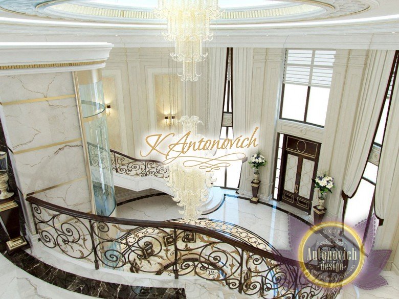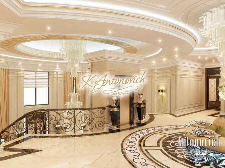 This is the beginning of work on one of the most ambitious villa projects from Luxury Antonovich Design Studio. Not so long ago our studio was added to a list of interior designers in Dubai. And today we are pleased to offer luxury interior design in Dubai, Sharjah and other Emirates regions. Interior designers in Sharjah offered an original solution of the entrance portal into the house. This is an elegant and expressive composition with a central axis. The family living area defines the center of the space. On the carved floor of natural marble, you can see a very comfortable and luxurious round sofa that can accommodate quite a large number of guests. This composition visually is «embraced» by a stair portal. Two marble staircases are connected on the terrace of the second floor. Wrought balustrade with delicate swirls of authors patterns complements the luxurious staircases. In this villa project, the interior designers in Sharjah demonstrate the fusion of traditions and modern technologies. In the hall interior, a modern elevator cab made of transparent glass looks very gently and harmoniously. The elegant and festive mood of the interior continues in the ceiling decor with a massive crystal chandelier and additional lines of illumination.