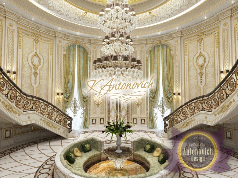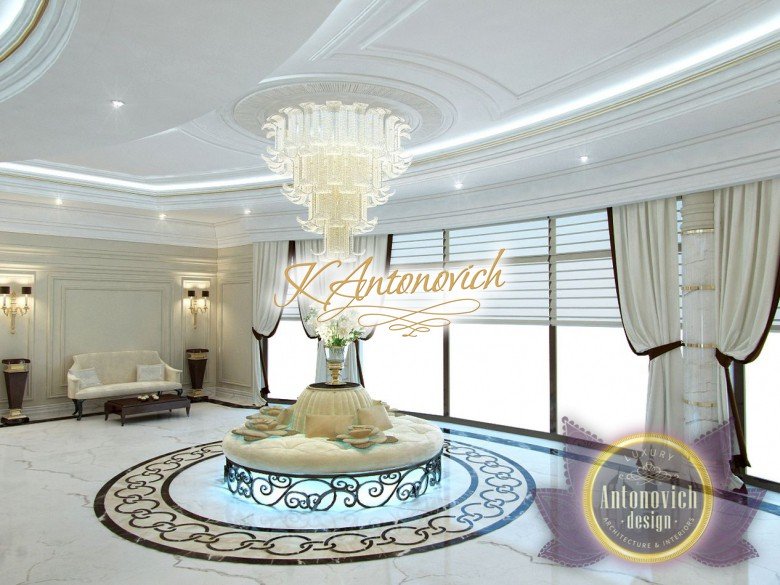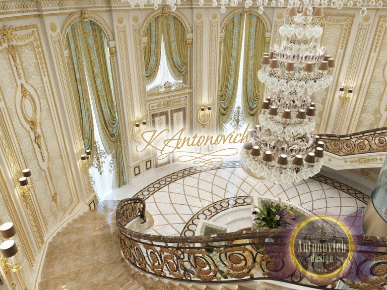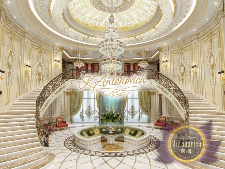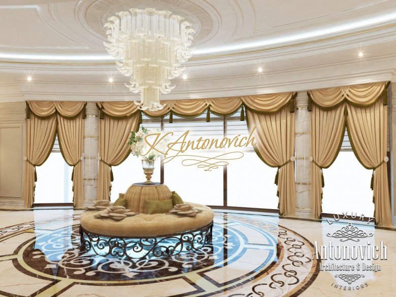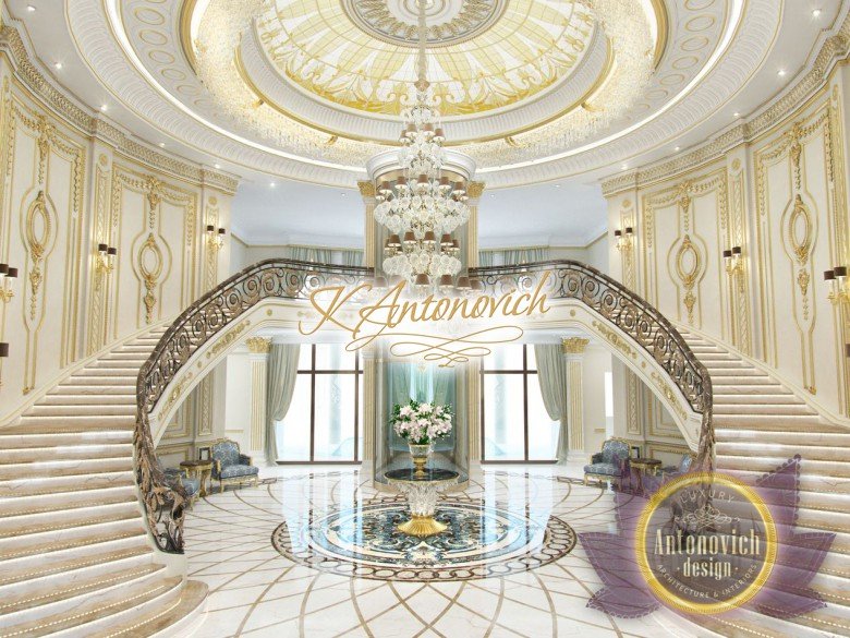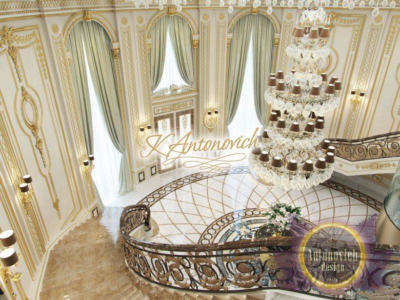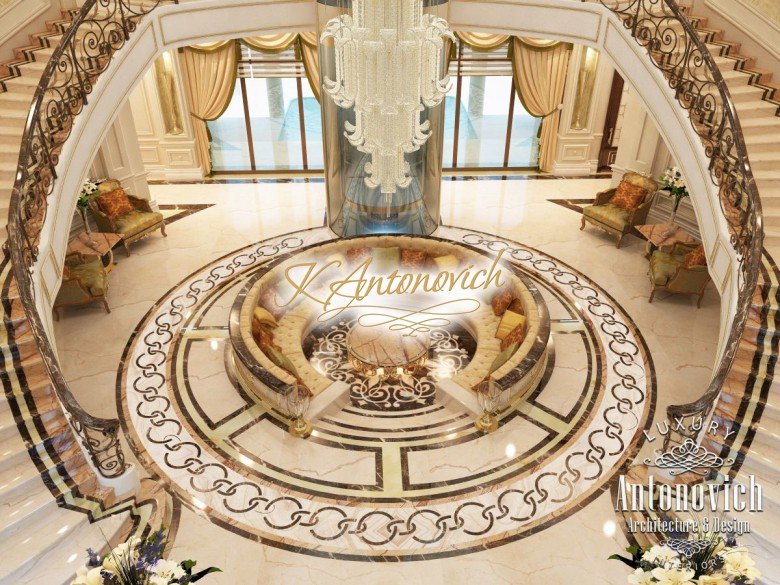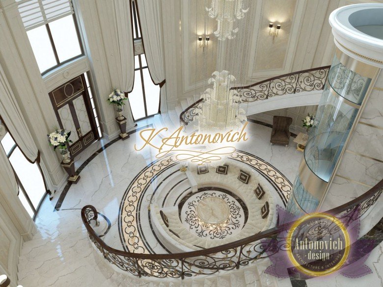 This is the beginning of work on one of the most ambitious villa projects from Luxury Antonovich Design Studio. Not so long ago our studio was added to a list of interior designers in Dubai. And today we are pleased to offer luxury interior design in Dubai, Sharjah and other Emirates regions. Interior designers in Sharjah offered an original solution of the entrance portal into the house. This is an elegant and expressive composition with a central axis. The family living area defines the center of the space. On the carved floor of natural marble, you can see a very comfortable and luxurious round sofa that can accommodate quite a large number of guests. This composition visually is «embraced» by a stair portal. Two marble staircases are connected on the terrace of the second floor. Wrought balustrade with delicate swirls of authors patterns complements the luxurious staircases. In this villa project, the interior designers in Sharjah demonstrate the fusion of traditions and modern technologies. In the hall interior, a modern elevator cab made of transparent glass looks very gently and harmoniously. The elegant and festive mood of the interior continues in the ceiling decor with a massive crystal chandelier and additional lines of illumination.