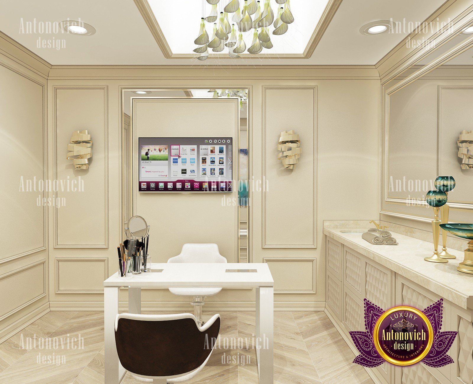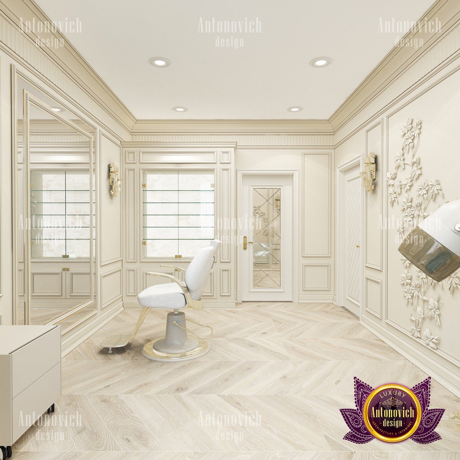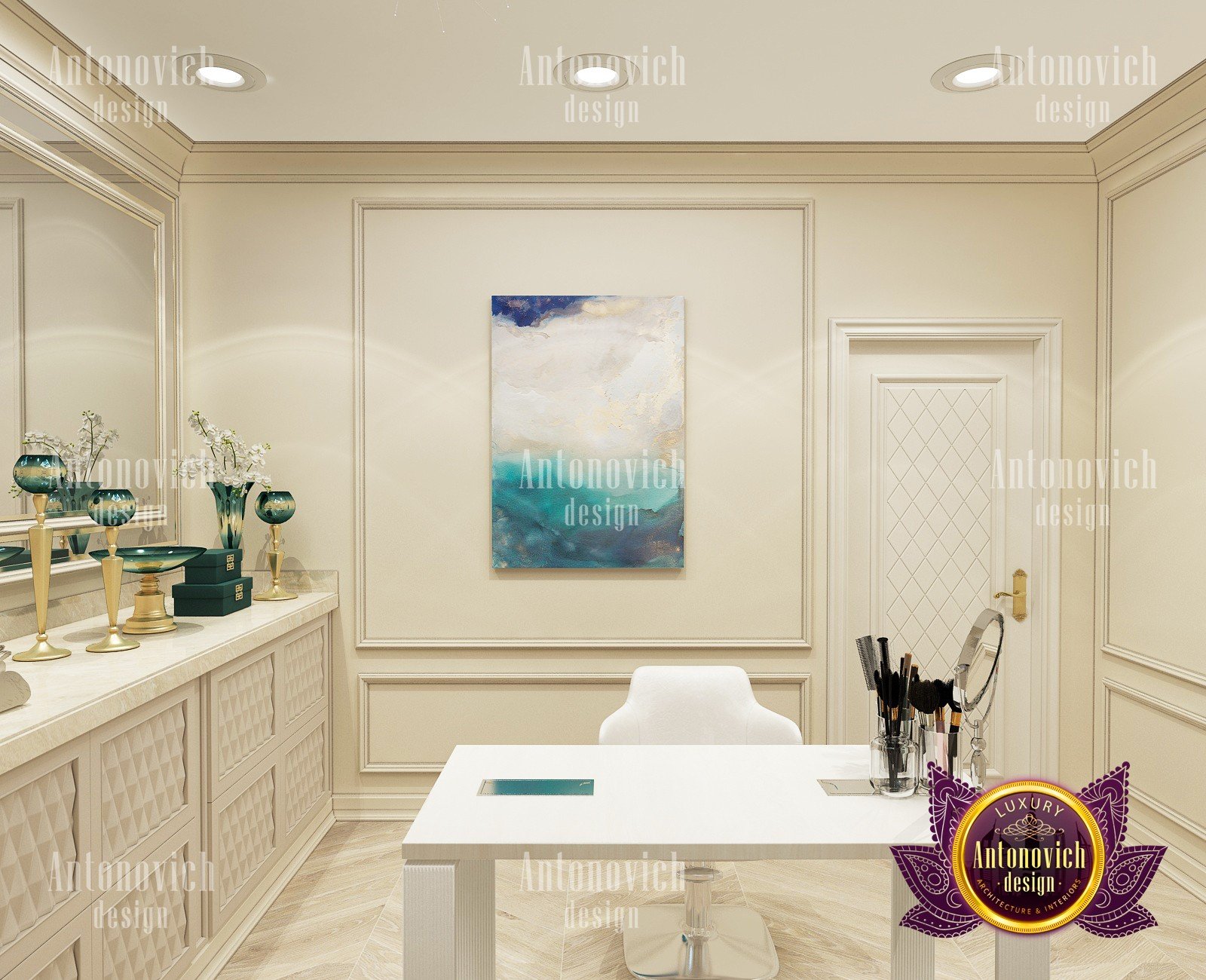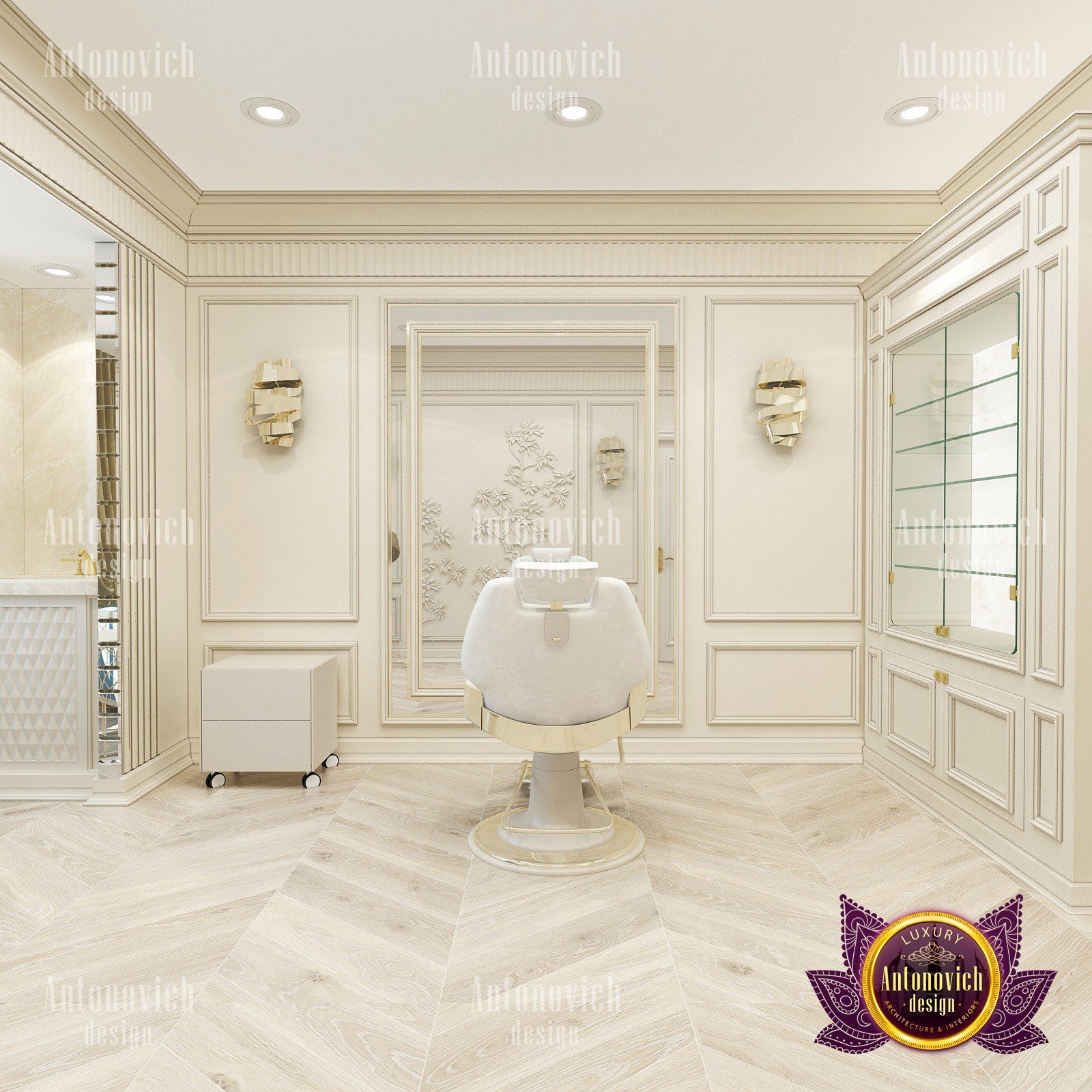 Elegant, stylish and a little bit strict — this is how you can characterize the interior design of this beauty salon by Luxury Antonovich Design. Our designers managed to create a light and bright mood thanks to a harmonious combination of white and creamy shades. As a result you can notice there a slight shade of glamour. The interior design of this salon can serve as an example of beauty, grooming and fashion. The attractive aesthetics of the setting here is balanced by practicality, and the functionality echoes with the original idea.