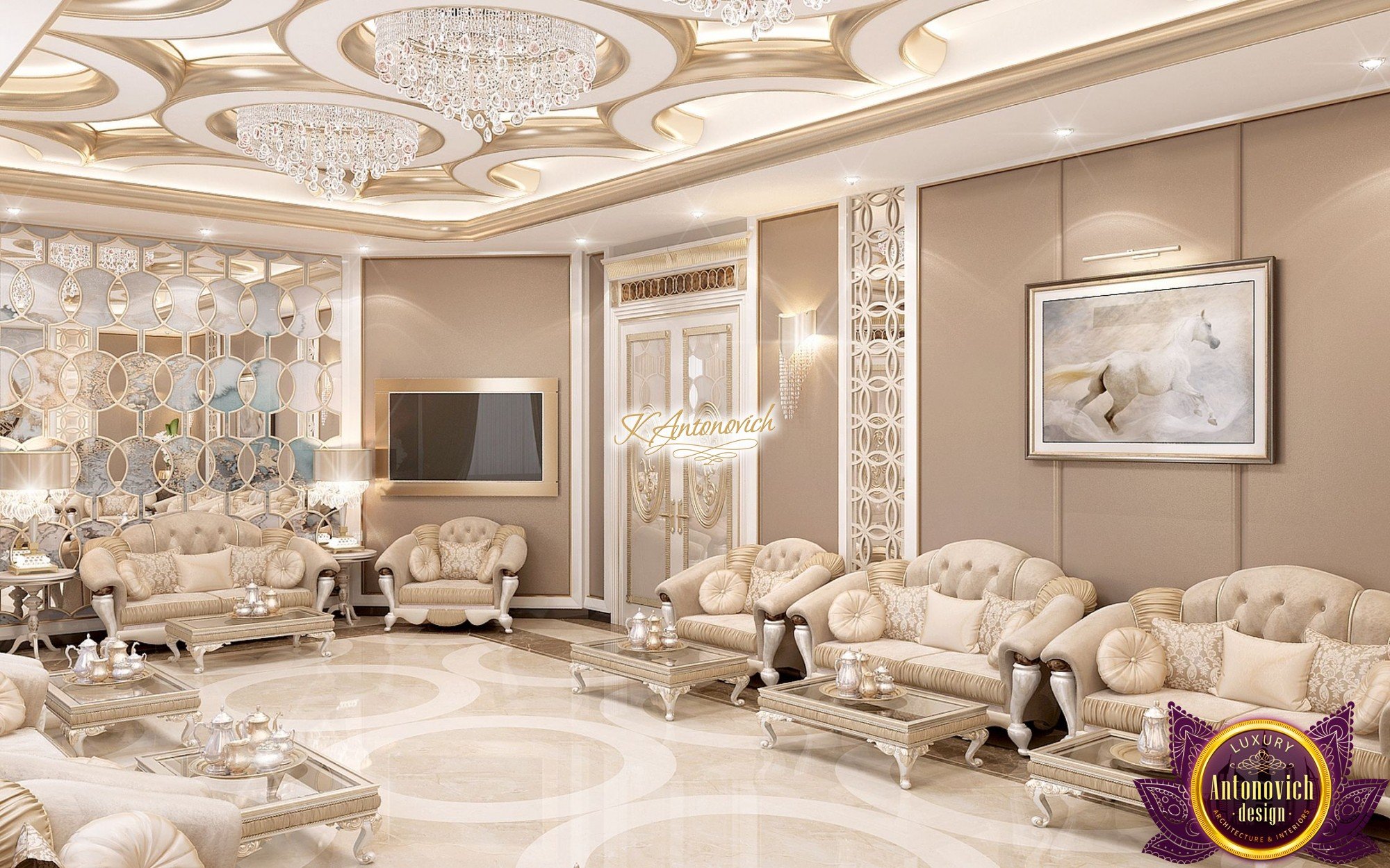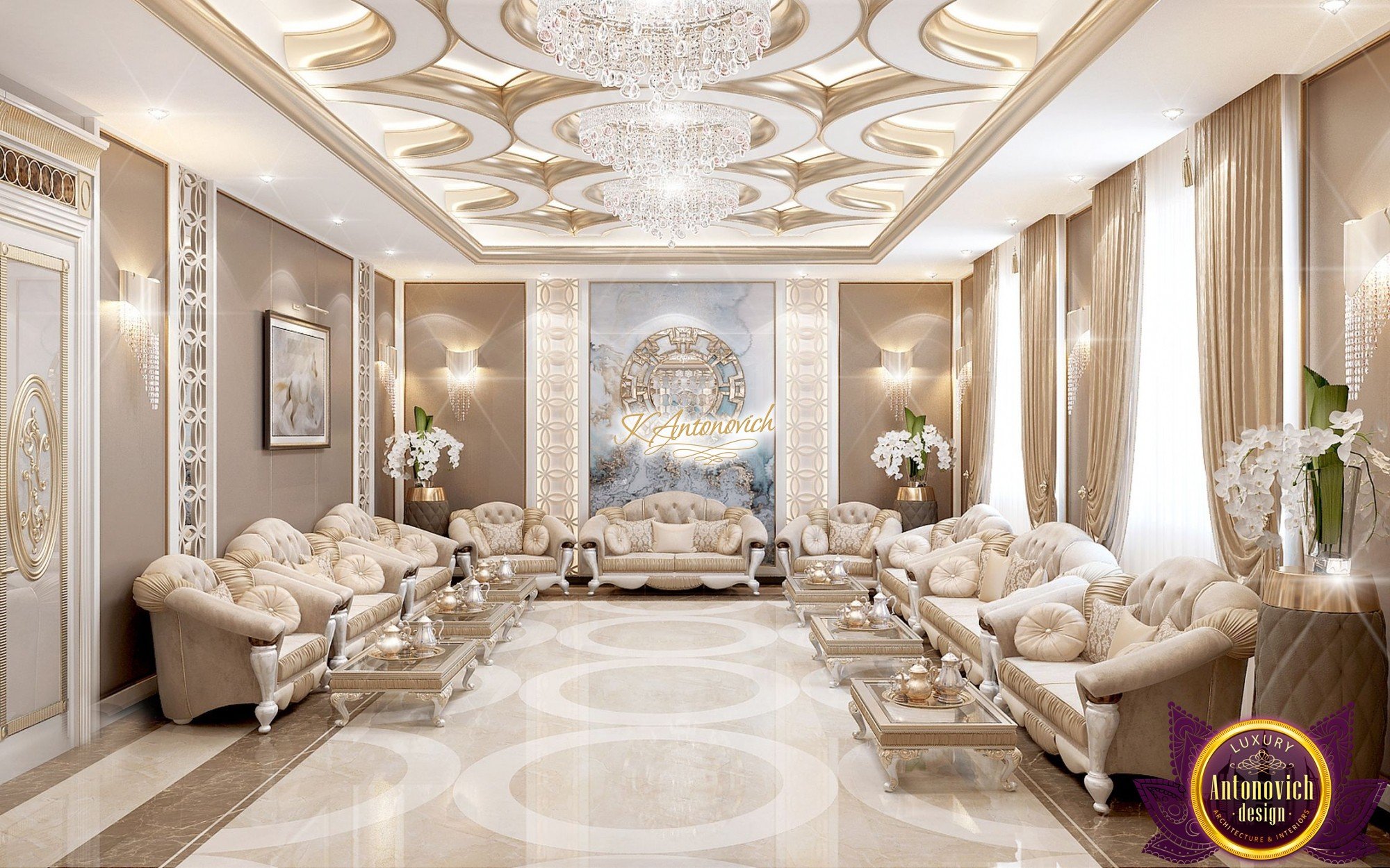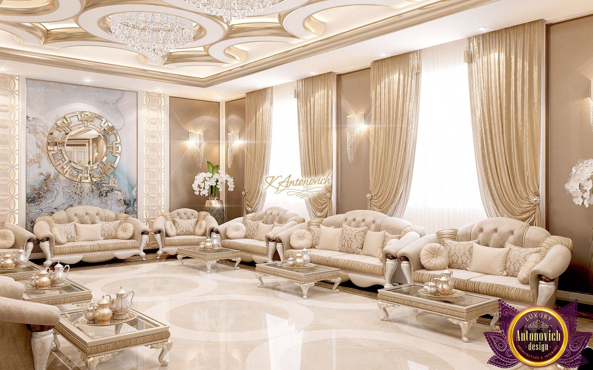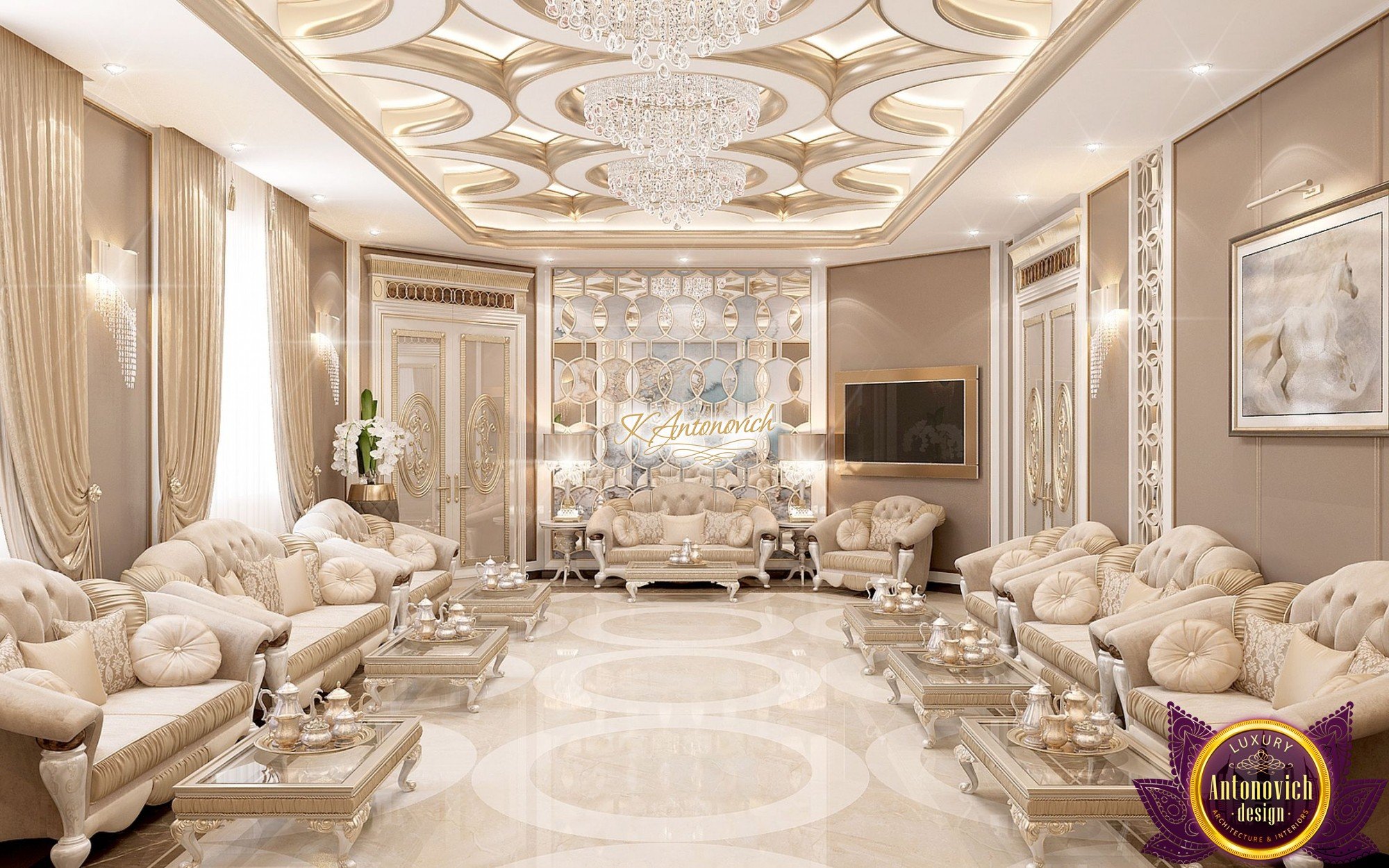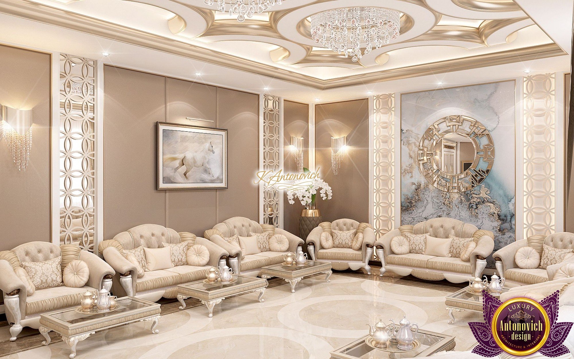 Interior design, from the studio Luxury Antonovich Design, becomes a wonderful moment of creativity of talented authors who create of unique beauty masterpieces. Each project is like a precious diamond with beautiful facets.Each element of the decor is a wonderful facet of this diamond.Interior design embodies the best achievements of modern technologies in conjunction with ingenious design techniques. And it's not just beautiful words. This is a wonderful reality of elite interior design from Antonovich Design Studio. This design project of the living room embodies the wonderful celebration of life. The owners of the house are successful people with impeccable taste. The interior is not loaded with unnecessary details of the decor. And yet it looks very chic and dignified. One of the brightest moments in the work on the project was the decoration of the walls. Here, the decorative plaster of brown shade with a matte effect, a panel of natural stone in blue tones, voluminous decor panels with illumination and elegant sconces are quite harmoniously coexisting. The flooring of natural marble is rather laconic. Light surface framed by a broad band of darker marble in shades of brown.This lightness and laconism with more than compensates the very elegant decor of the ceiling.The ceiling was decorated with a niche with three-dimensional elements and three crystal chandeliers.Each detail of the ceiling is highlighted by a line of LED lighting.In the interior of the living room is predominant monochrome gamma of shades in the pastel gamut of the beige palette. Charming soft sofas on graceful legs and coffee tables add to the interior of the living room the charm of hospitality and absolute comfort.