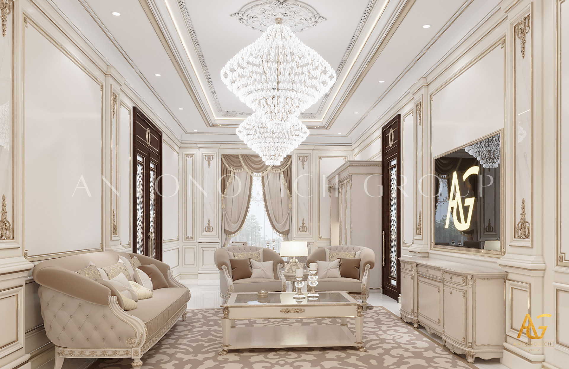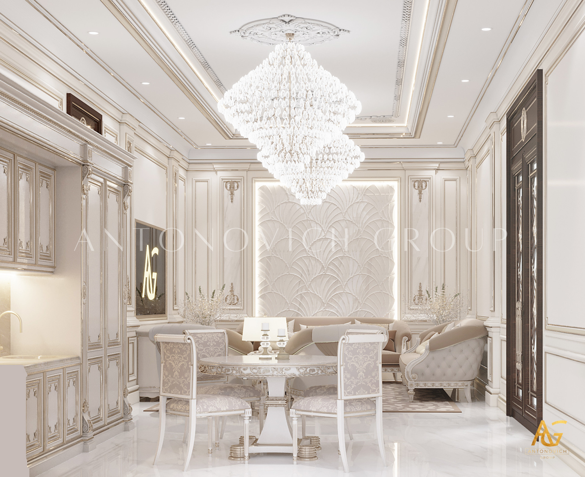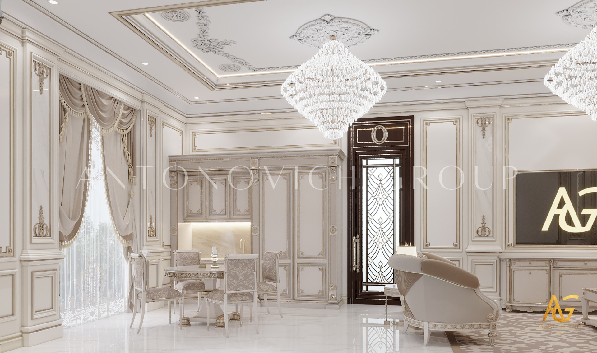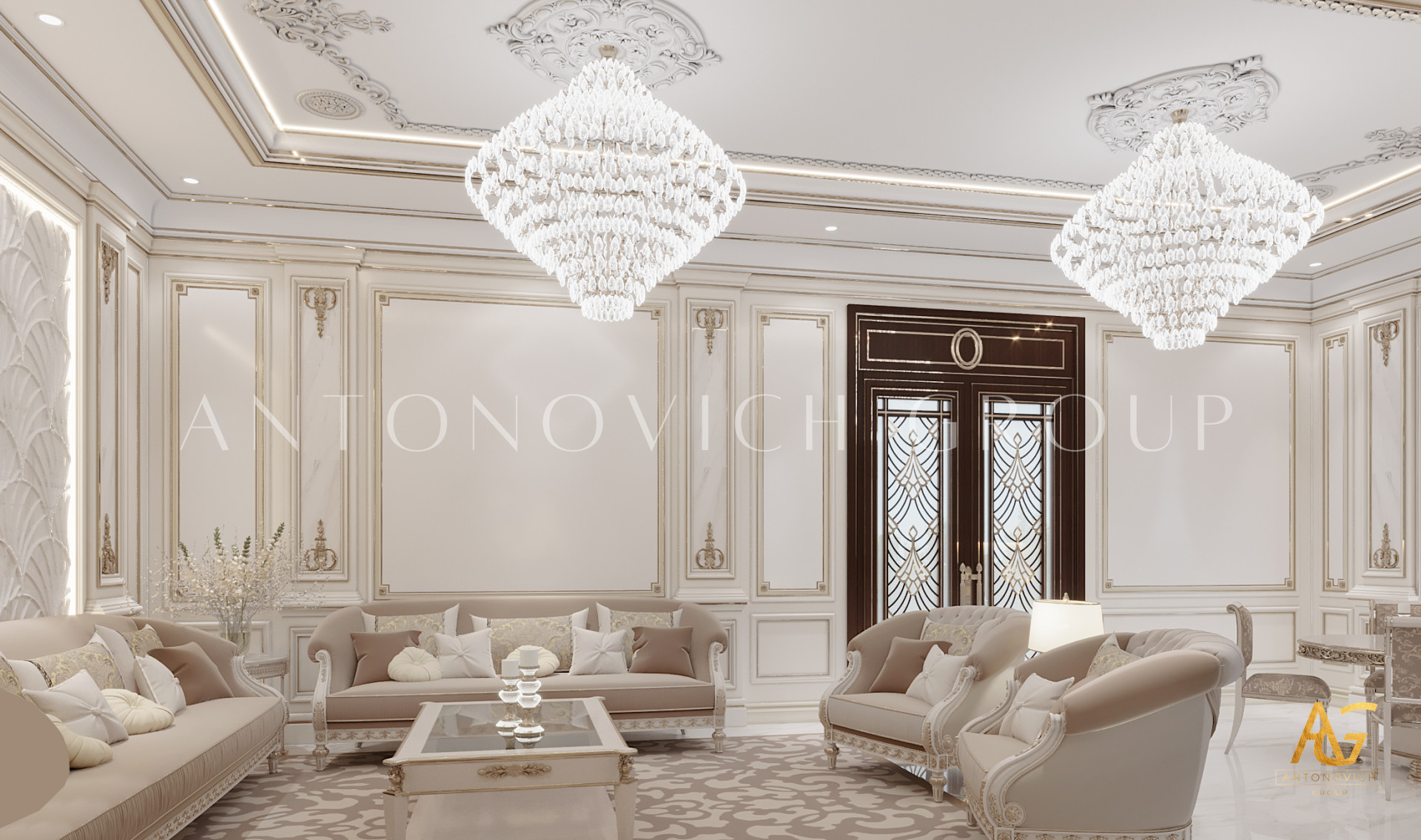 Each Majlis is designed with an emphasis on grandeur and functionality. Antonovich Group’s team of designers begins with precise space planning to ensure the layout encourages social interaction while maintaining a sense of luxury and order. The seating arrangement is carefully planned, using custom-made furniture pieces upholstered in premium fabrics, often complemented with elegant detailing such as gold or bronze accents, intricate woodwork, and refined finishing.