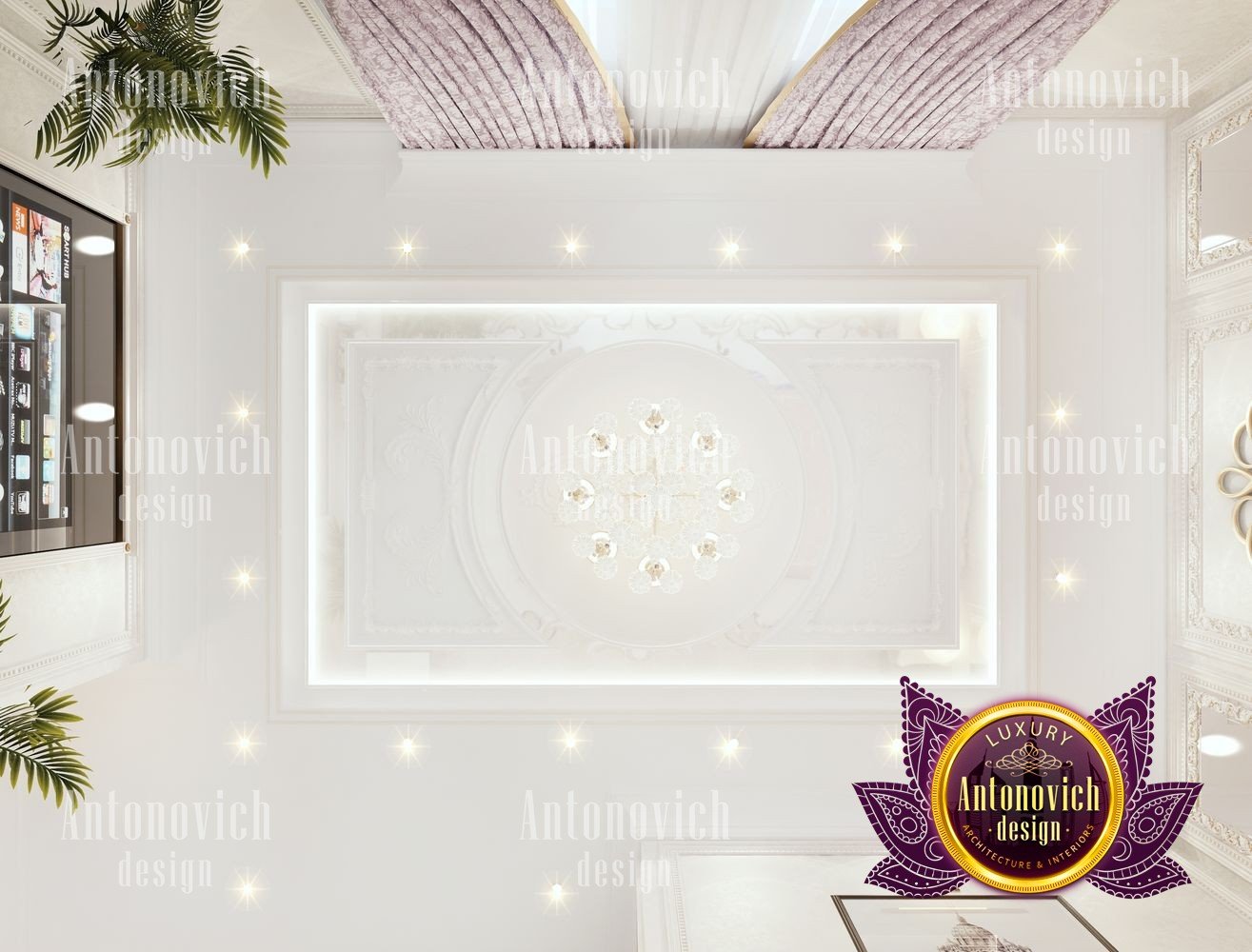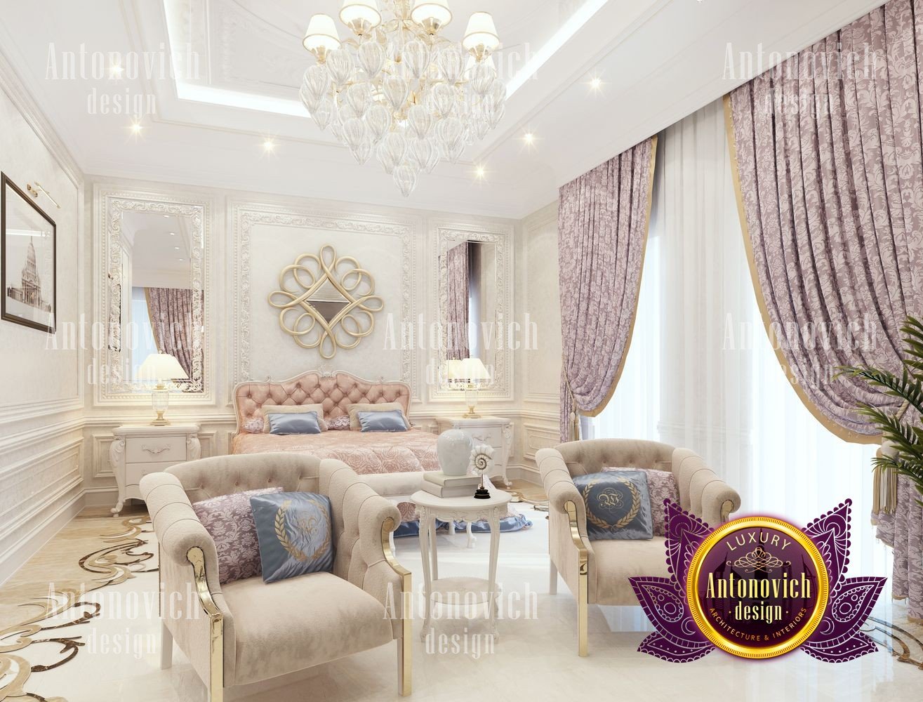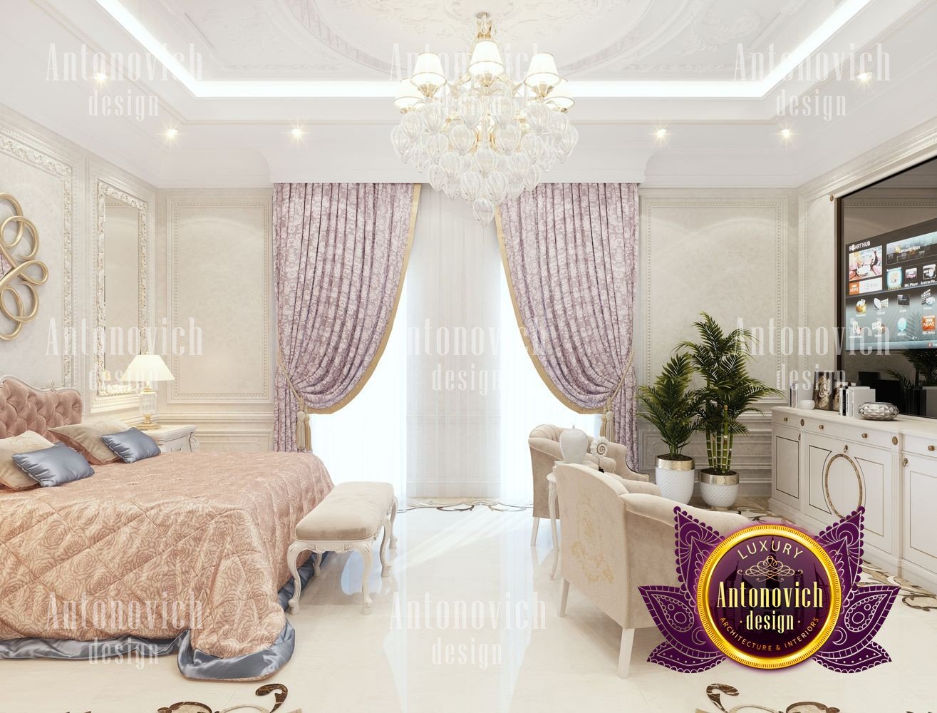 The flight of a designers fantasy depends on many factors. It is the inspiration, first of all, from communication with customers and penetration into their dreams. But even such a moment as a large area for the project of the interior of the bedroom can add many new moments in creating unique design ideas. The main bedroom in the big house became a luxurious masterpiece in the Art Nouveau style. The main zone is located near a large semicircular panoramic window. Beautiful curtains made of silk chocolate shade evenly distributed with vertical folds around the perimeter of the window. The elegant ceiling was decorated with a polygonal suspension with a lot of lamps and lines of mirror stripes all around the perimeter. The design of the ceiling becomes the most important point in the interior of the bedroom. In such space, in the morning and evening lying in bed, you can admire such bright and elegant details. The large headboard is upholstered in natural leather with a texture in geometric ornament. This extravaganza of bright and festive notes is complemented by the floor design made of natural marble and onyx elements with illumination. Continued the interior by a small living room with stylish furniture in a modern style. A lot of showcases with open shelves and lighting. The ceiling is also strewn with small LED lamps, which gives the bedroom interior a very romantic mood. In the decor of the walls, the matte plaster is decorated with thin strips of polished brass, which mirror the shimmering under the light of the chandelier and lamps. The interior design of the bedroom reflects the future fashion trends in the design of interiors.