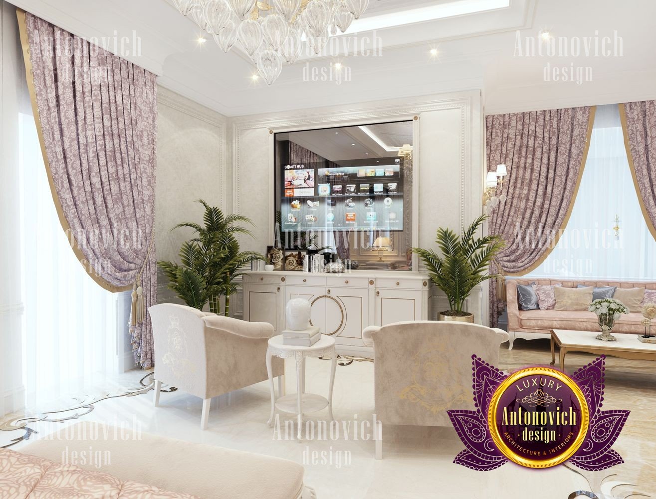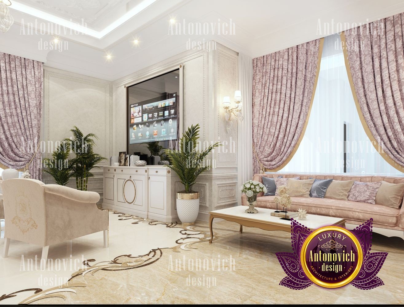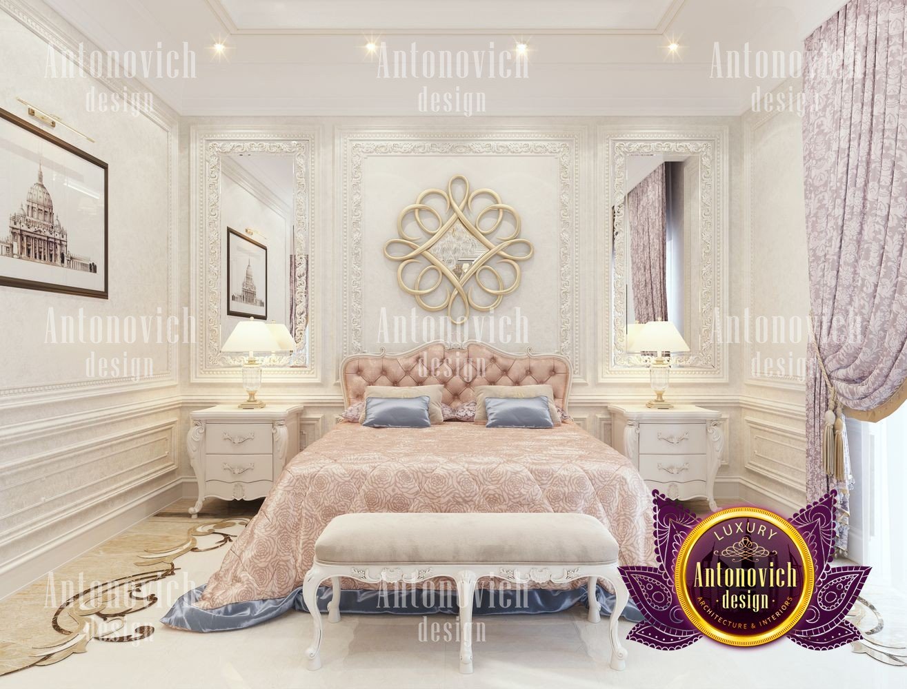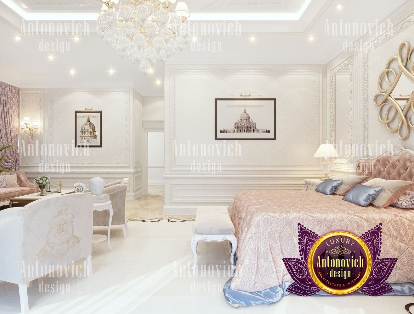 The flight of a designers fantasy depends on many factors. It is the inspiration, first of all, from communication with customers and penetration into their dreams. But even such a moment as a large area for the project of the interior of the bedroom can add many new moments in creating unique design ideas. The main bedroom in the big house became a luxurious masterpiece in the Art Nouveau style. The main zone is located near a large semicircular panoramic window. Beautiful curtains made of silk chocolate shade evenly distributed with vertical folds around the perimeter of the window. The elegant ceiling was decorated with a polygonal suspension with a lot of lamps and lines of mirror stripes all around the perimeter. The design of the ceiling becomes the most important point in the interior of the bedroom. In such space, in the morning and evening lying in bed, you can admire such bright and elegant details. The large headboard is upholstered in natural leather with a texture in geometric ornament. This extravaganza of bright and festive notes is complemented by the floor design made of natural marble and onyx elements with illumination. Continued the interior by a small living room with stylish furniture in a modern style. A lot of showcases with open shelves and lighting. The ceiling is also strewn with small LED lamps, which gives the bedroom interior a very romantic mood. In the decor of the walls, the matte plaster is decorated with thin strips of polished brass, which mirror the shimmering under the light of the chandelier and lamps. The interior design of the bedroom reflects the future fashion trends in the design of interiors.