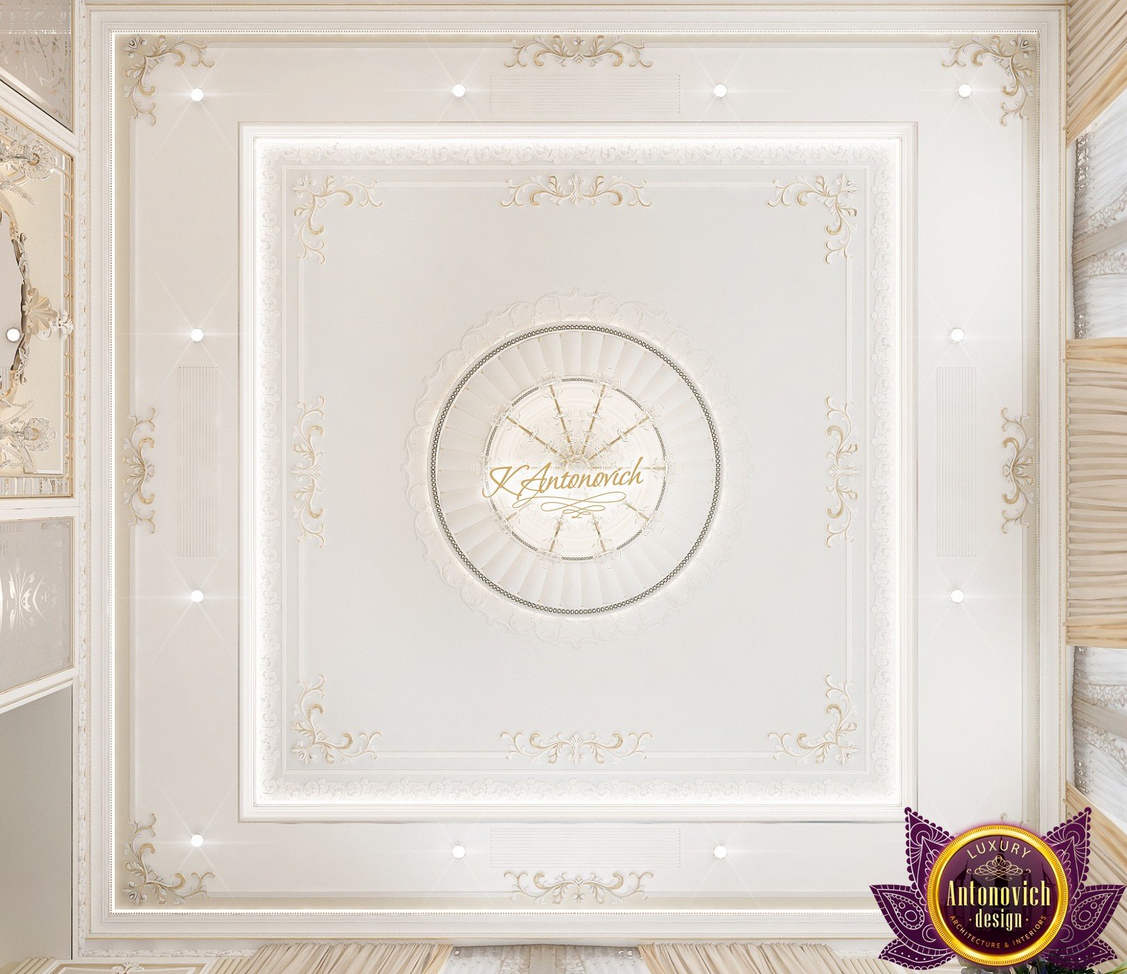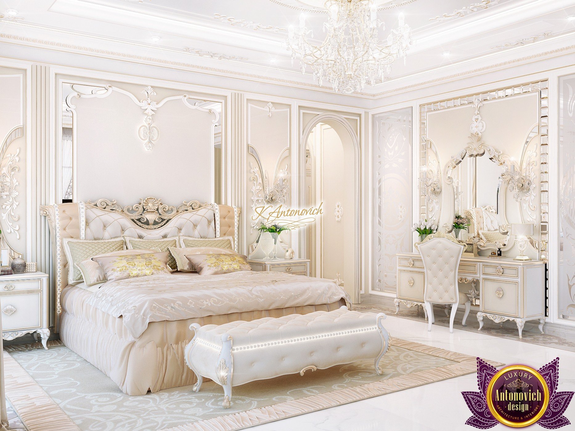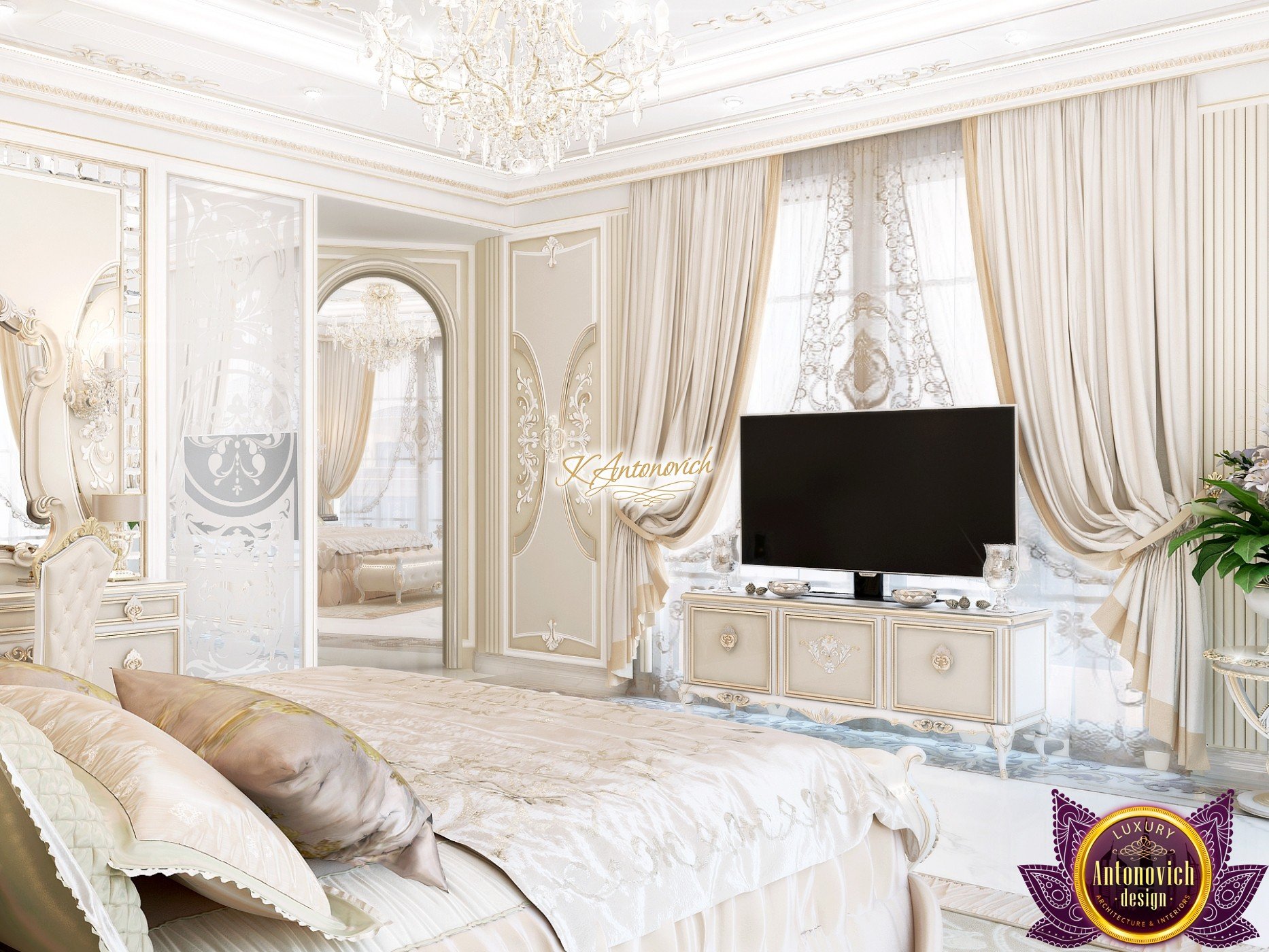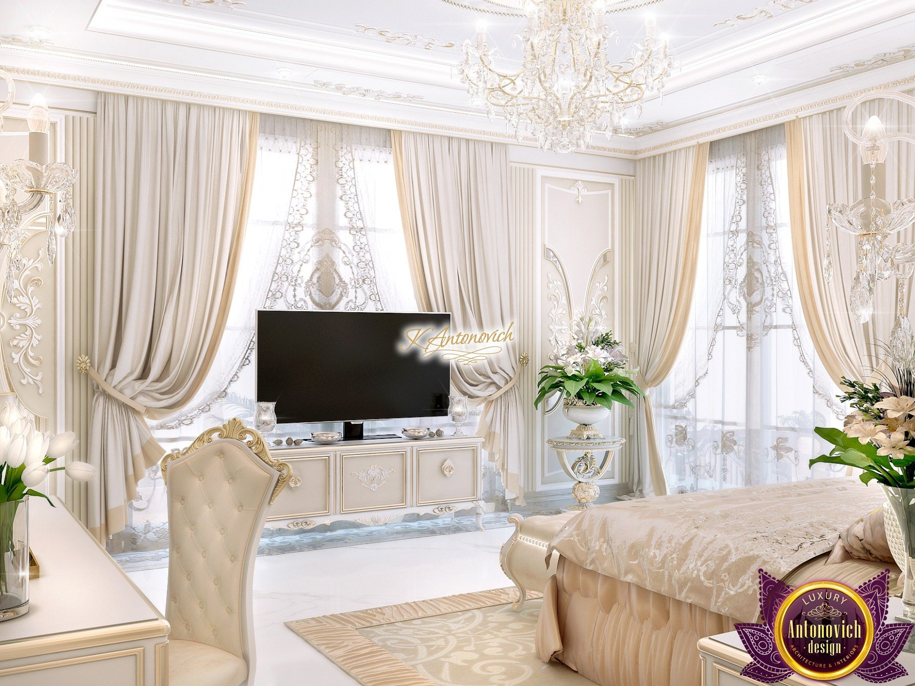 The incredible tenderness, sophistication, and elegance embodied in the interior of this beautiful bedroom in a classic style.The gentle character is based on pleasant pastel shades, dominated by cream and pale peach color. In the cottage plan, a bedroom on the second floor with a large panoramic window envisaged. Due to this, the bedroom gets a sufficient amount of natural light.To give the room a finished look, the interior designers have proposed for a window decor beautiful Italian curtains. In general design of curtains always harmoniously continues the design concept of the interior. Curtains for the bedroom should also be in harmony with the decoration of the bed. Elite luxurious silk curtains and curtains with handmade embroidery the bedroom interior are beautifully decorated. Wallpapers in the bedroom, authors of the project decided to replace with such material for wall decoration as decorative plaster. Gracefully and good looking the stucco decoration of the walls.Plaster decoration of gypsum in each work of talented designers acquires a special appearance.In this bedroom interior project, stucco on the wall beautifully combined with the stucco decoration on the ceiling. Photorealistic visualization of the projects that we offer to our customers also reflect methods of interior lighting. Beautiful chandelier surrounded by gilded stucco petals and expanded by lines backlighting and round ceiling lights.For decoration floorings, we offered light-colored Italian marble and luxury natural carpet. The interior of the bedroom is the ideal place for a comfortable stay.