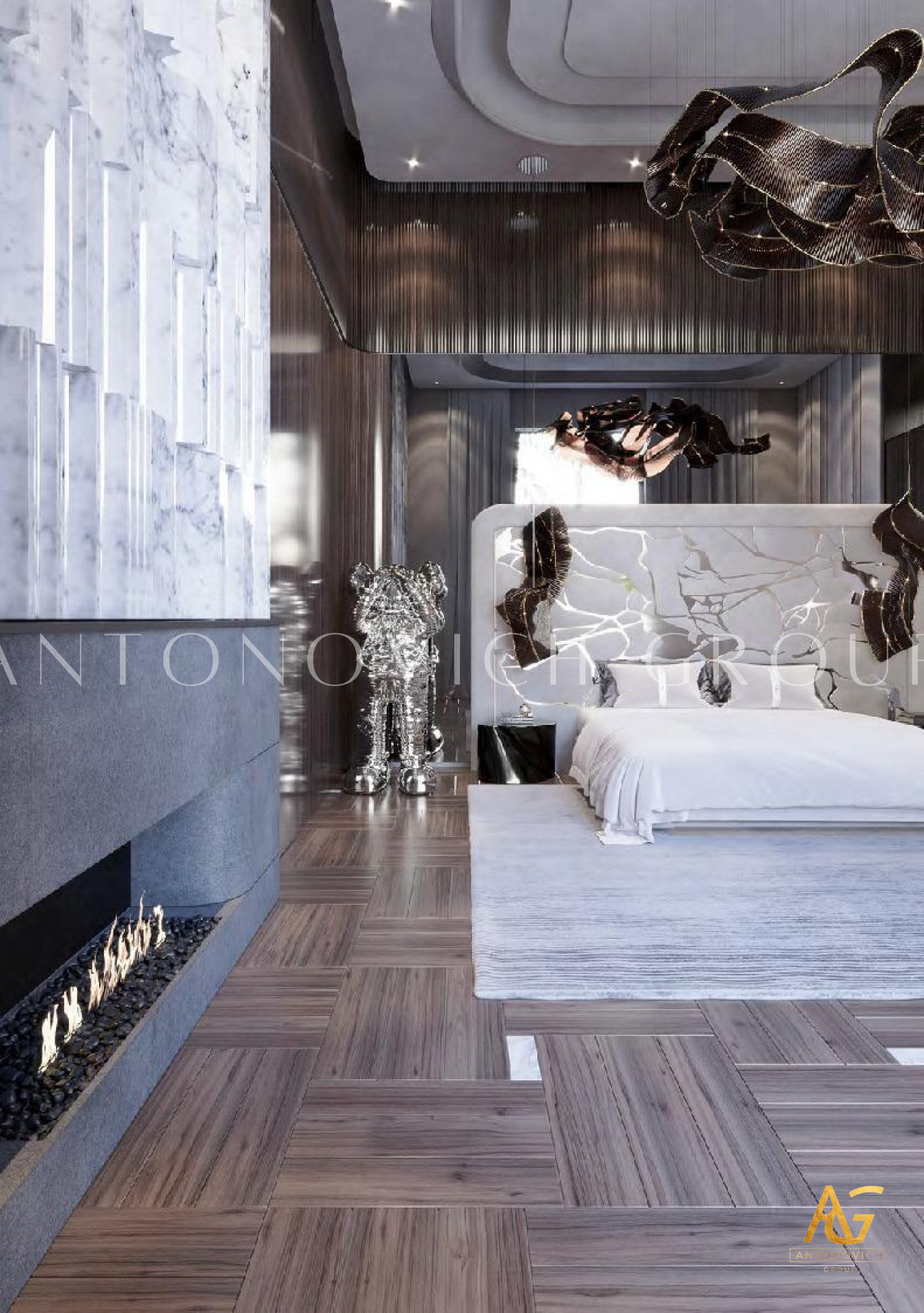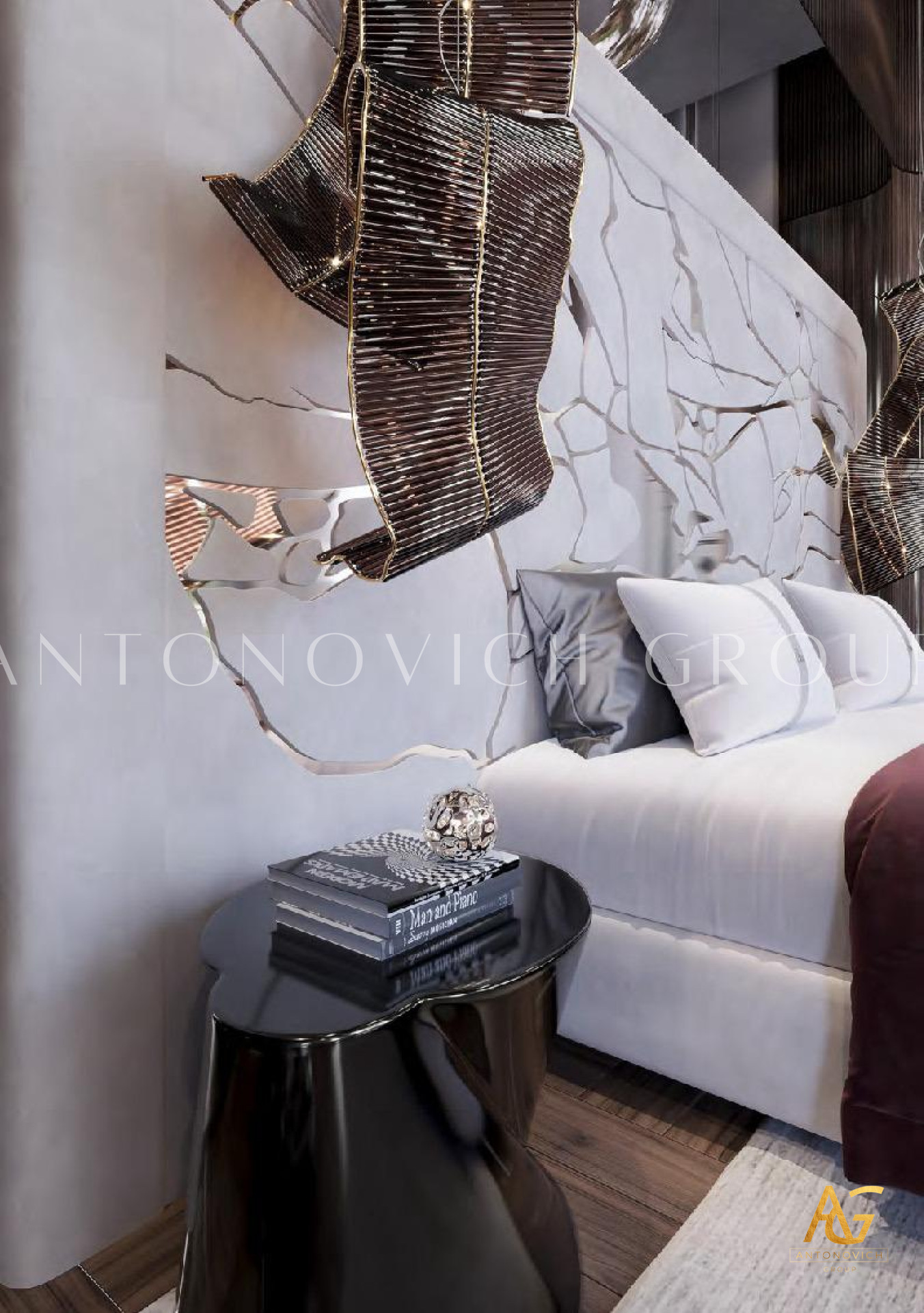 Tenderness, nobility and softness, interior designers presented in this interior as something very cozy and romantic. As always, the bedroom design occupies one of the leading roles in each project of a house or apartment. A place where you can relax and devote time only to yourself. Your rest should be perfect. Everything must obey your dreams and wishes. This approach always presented in the works of creative designers of the Luxury Antonovich Design. In this bedroom design project, textile design played a great role in the formation of a very precise and artistically expressive image. For the window decoration in the bedroom, the author of the project suggested charming curtains of noble silk of a pleasant lilac shade. The designer emphasizes the beauty and refinement of the fabric with the help of a wide strip of bows and folds at the top. Part of the cozy mood was the accent wall behind the headboard of the bed, which is decorated with a soft velvet panel in silver-beige shades. The rest of the walls in the bedroom interior are covered with decorative plaster with the texture of natural velvet. The interior designer masterfully improvises with such a fashionable trend in interior design 2019 as geometric ornaments. The pattern on the silk coverlet is repeated in the wall decoration behind the headboard of the bed. A pleasant feeling of coolness and ease were brought into the bedroom interior the by the flooring of white Italian marble. It gracefully complements a beautiful ceiling, with a modern chandelier and additional accents of lighting.
