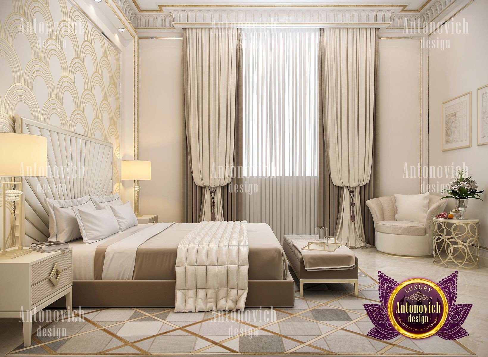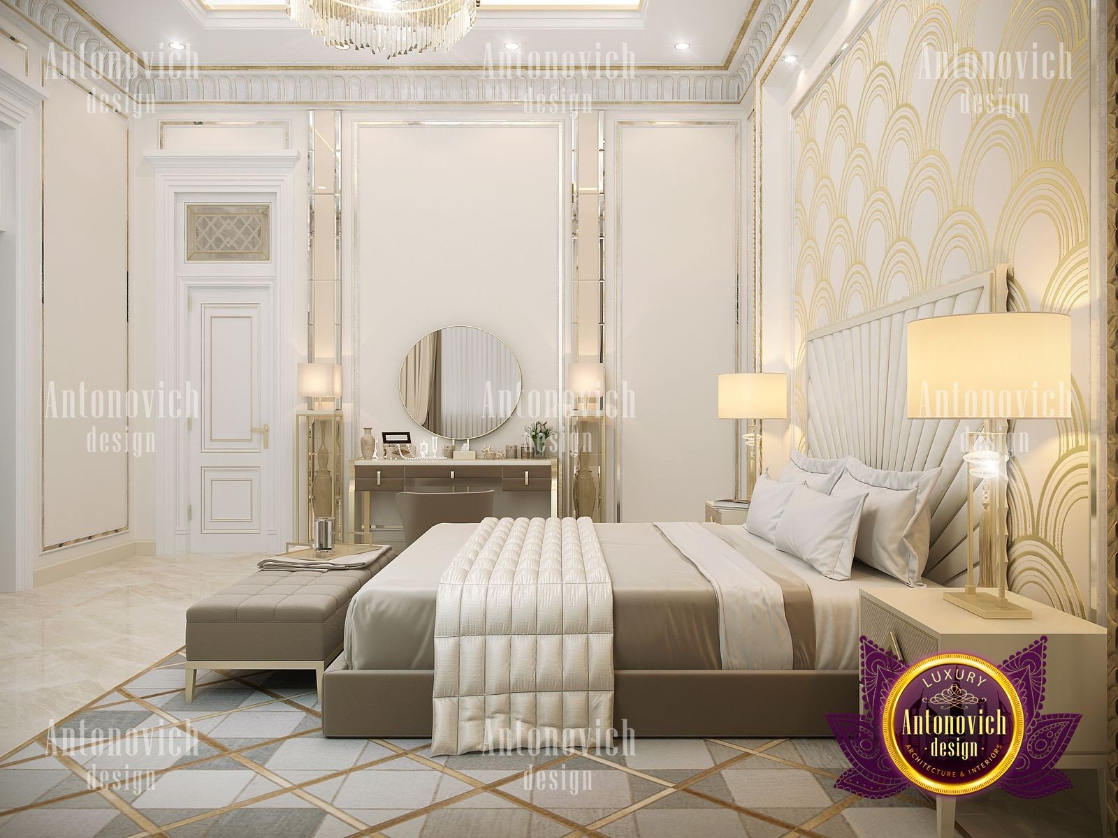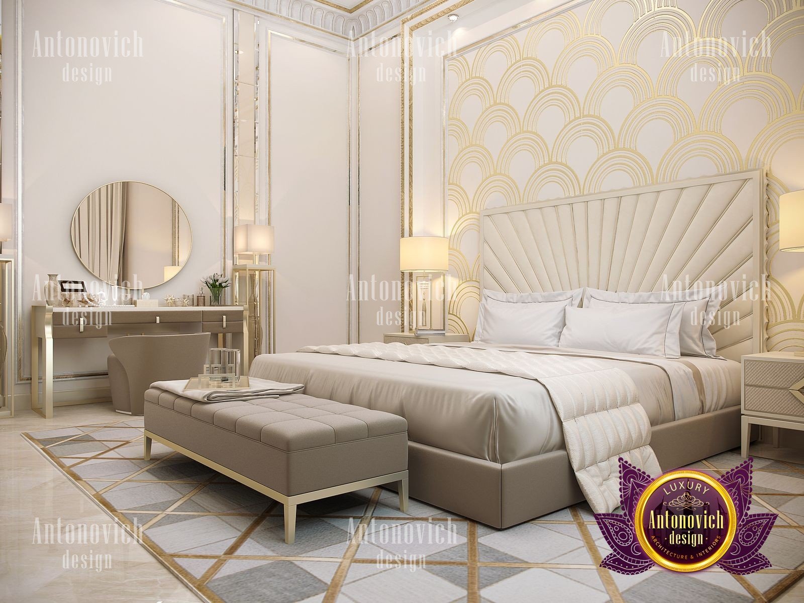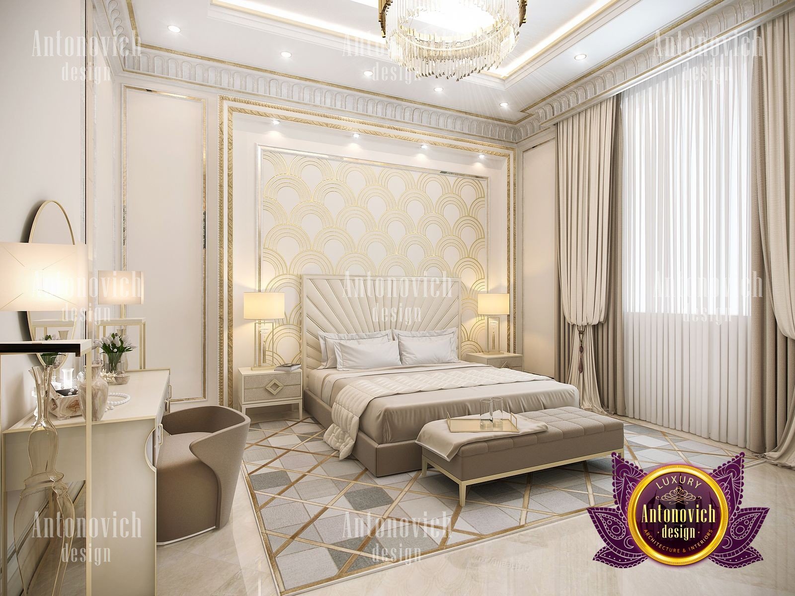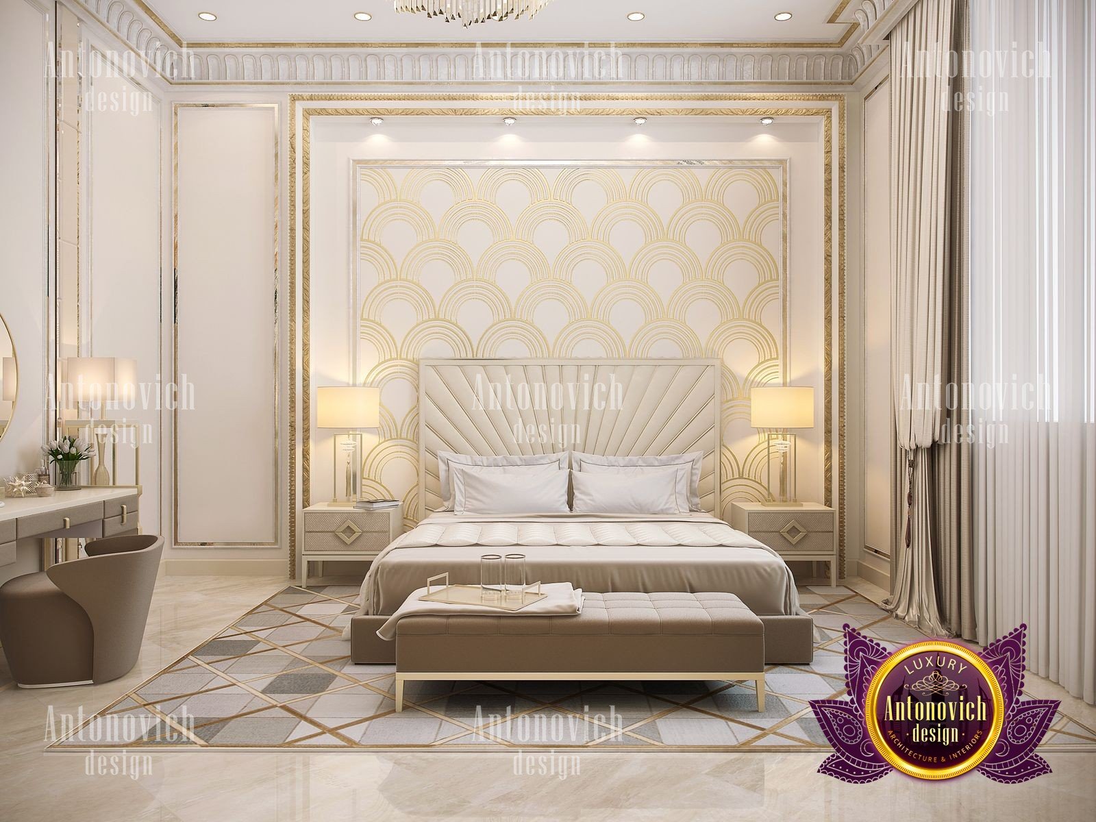 An island of calm, tenderness and exquisite beauty created by designer Katrina Antonovich in the bedroom interior. Neoclassic style smoothly flows into modern style. Monochrome color palette ensures the integrity of the interior and its specific mood. For this project, the interior designer offered a soft beige shade with different shades. Beautiful curtains of two types of silk: milky-beige and ash-cream decorated the large windows. Elegant folds of drapery, which are formed by soft holders in the form of laces and brushes. Laconic curtains made of white translucent tulle cover the window at the same time allow penetrating into the room enough sunlight. A high ceiling with interesting design solutions looks even higher and more spacious. Wide molding is outlined by a line of LED backlight and a thin strip with gilding. The elegant chandelier and round ceiling lamps fill the bedroom interior with a sufficient amount of light. One of the brightest elements of the decor is a beautiful 3D panel behind the bed headboard. A nice geometric ornament, a deepening with illumination and a gilding edging give this part of the room space a bright and expressive image. Interior designer Katrina Antonovich beautifully improvises with the geometry of lines and shapes. For the floor decor, she offered a laconic light marble on the background of which a very large natural carpet with geometric ornaments looks very bright. The interior, in general, brings pleasant emotions of tranquility and relaxation.