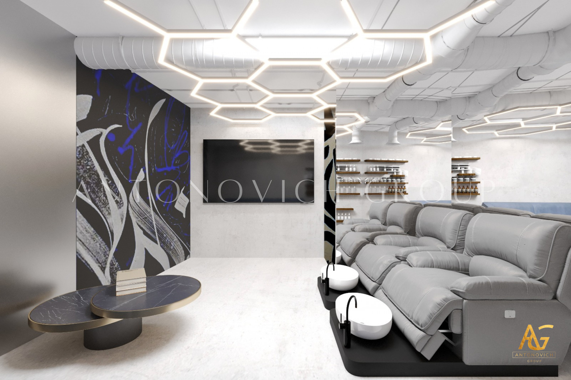 The Hair Salon interior design in Dubai by Antonovich Group takes into account every detail, ensuring that the layout is not only visually stunning but also functional. The open, airy space allows for maximum freedom of movement for stylists, while clients can enjoy ample room to unwind during their grooming sessions. Every piece of furniture and every fixture has been carefully selected to complement the shop's modern aesthetic while serving a specific purpose.
