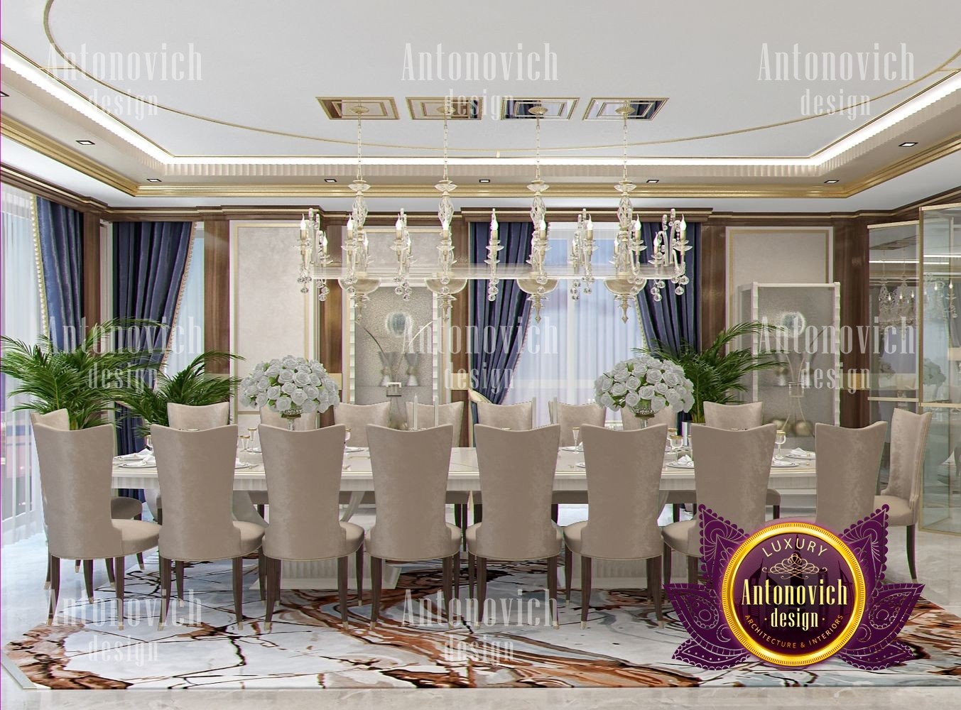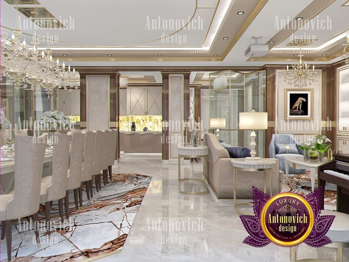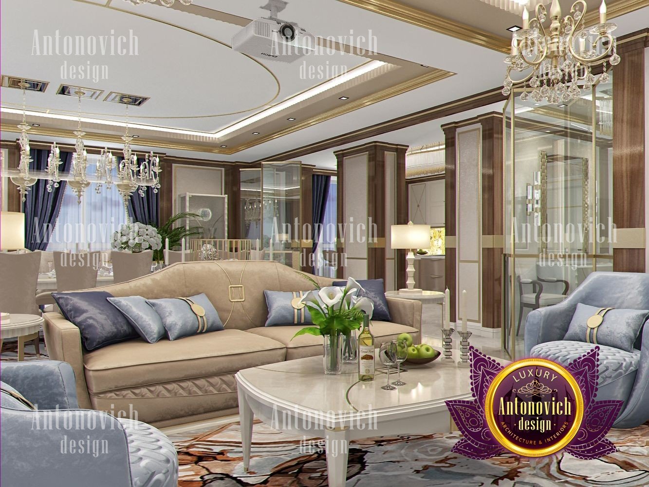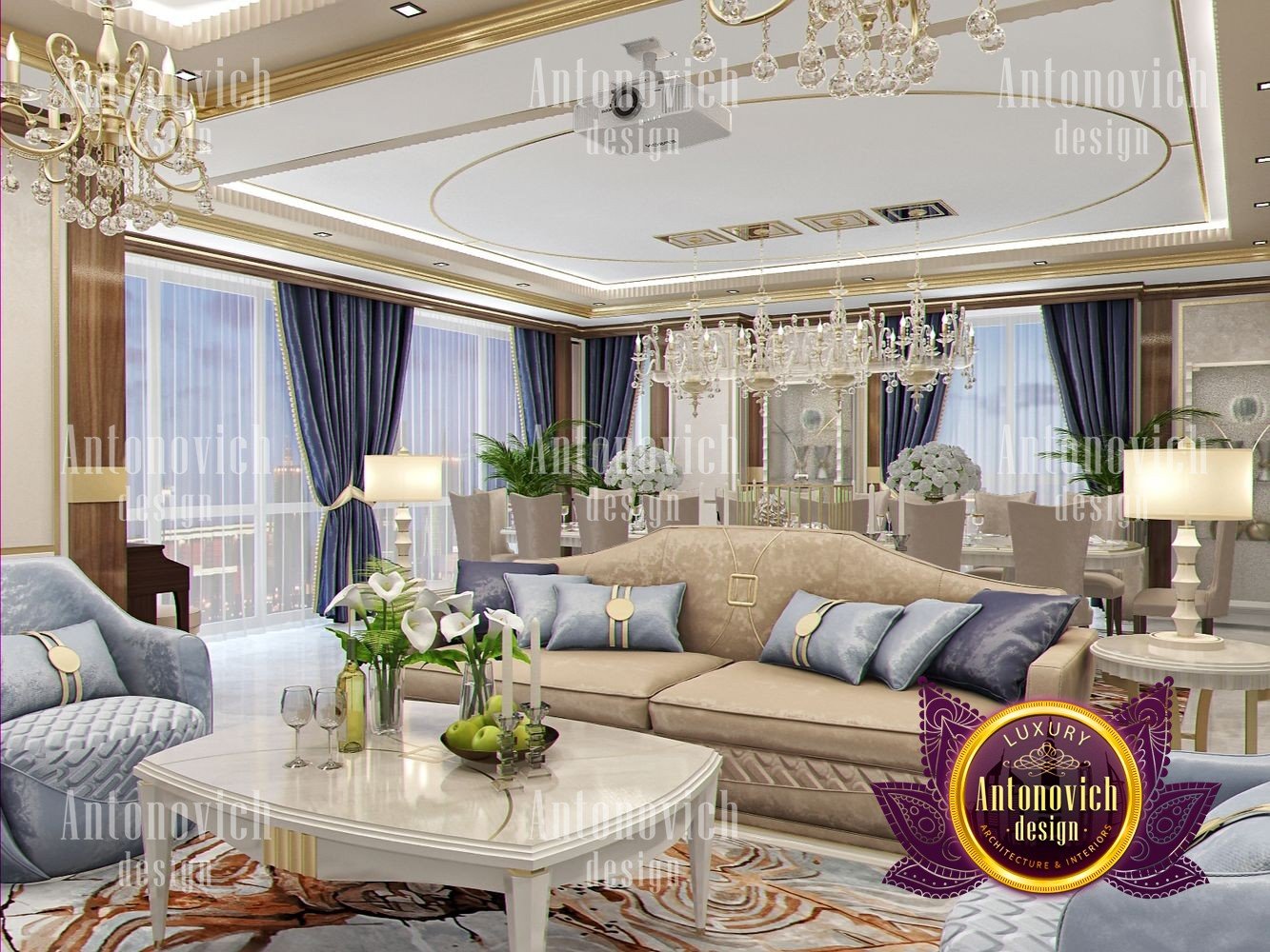 Luxury modern interior design made for the richest in the city. Live in a luxurious apartment with the help of the best luxury interior design company: Luxury Antonovich Design. Its living room is a combination of luxury and modernism. The beautiful blue and cream sofa are a good color choice. The chandelier is very luxurious with lighting that is equally superb. The dining area is designed to fit many people. The beautiful chairs and table are one of a kind with their luxury design.GORGEOUS DECORATION WITH LUXURY DETAILS