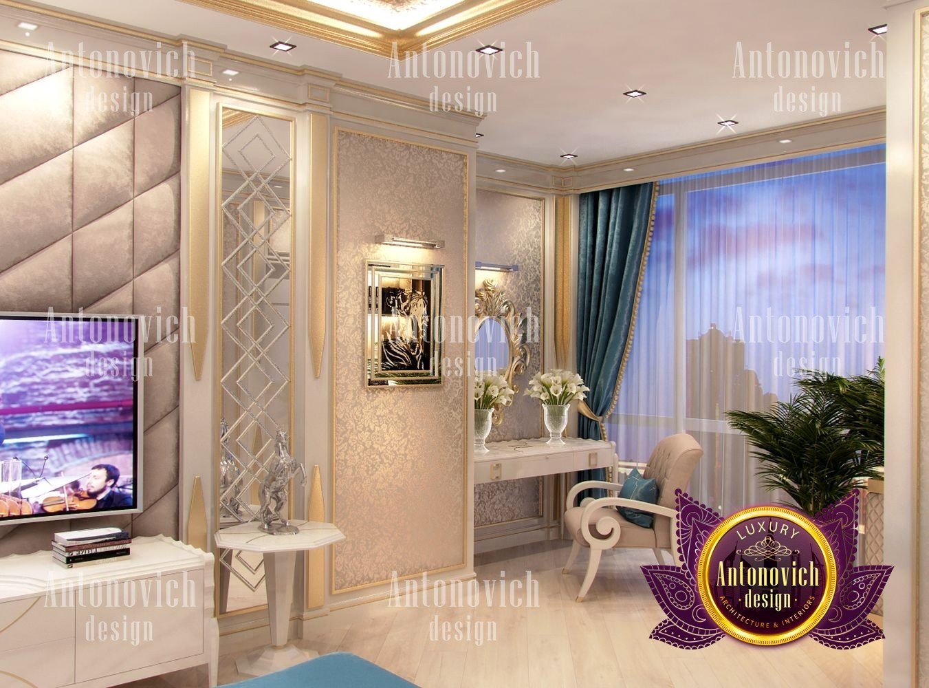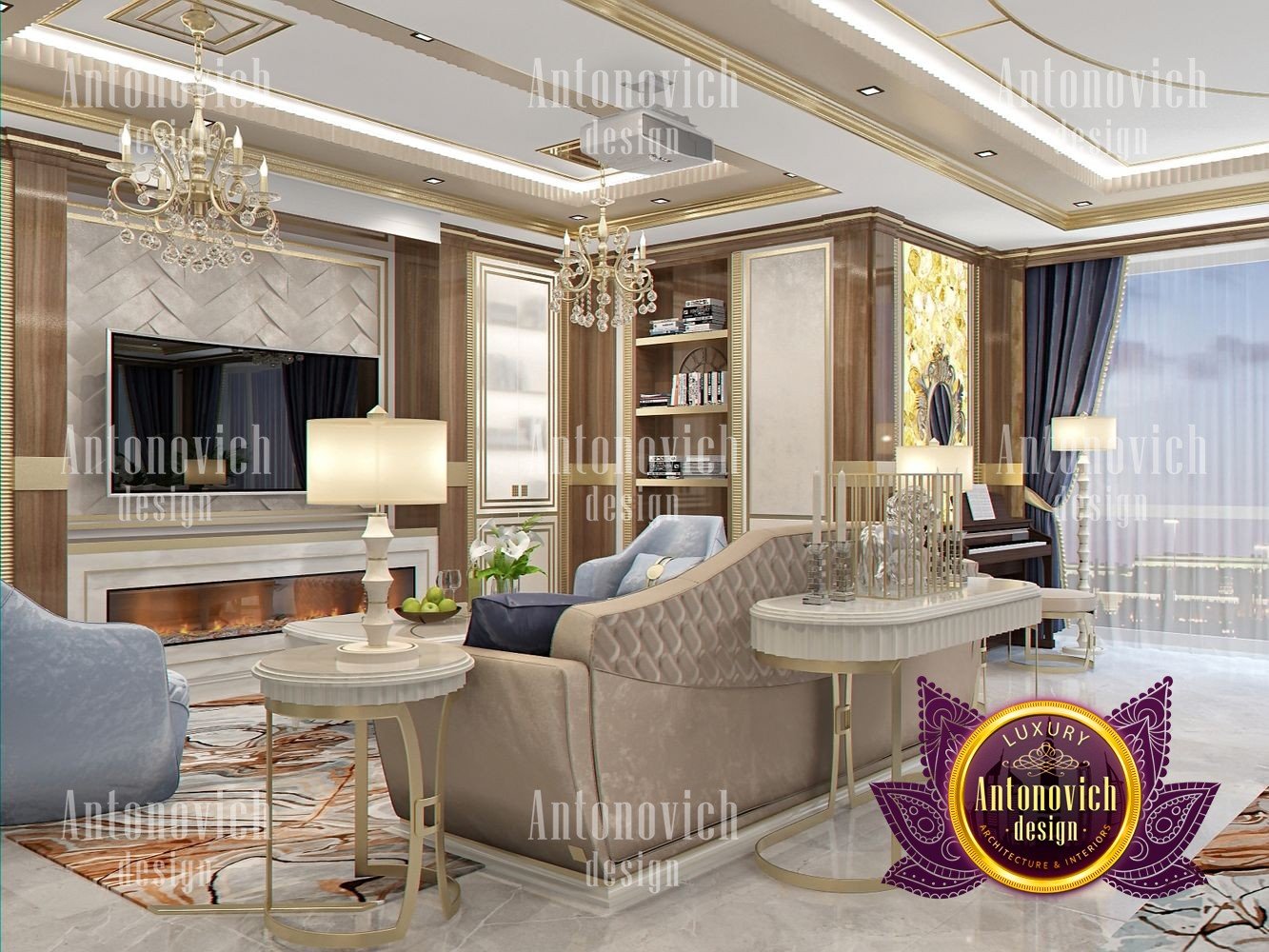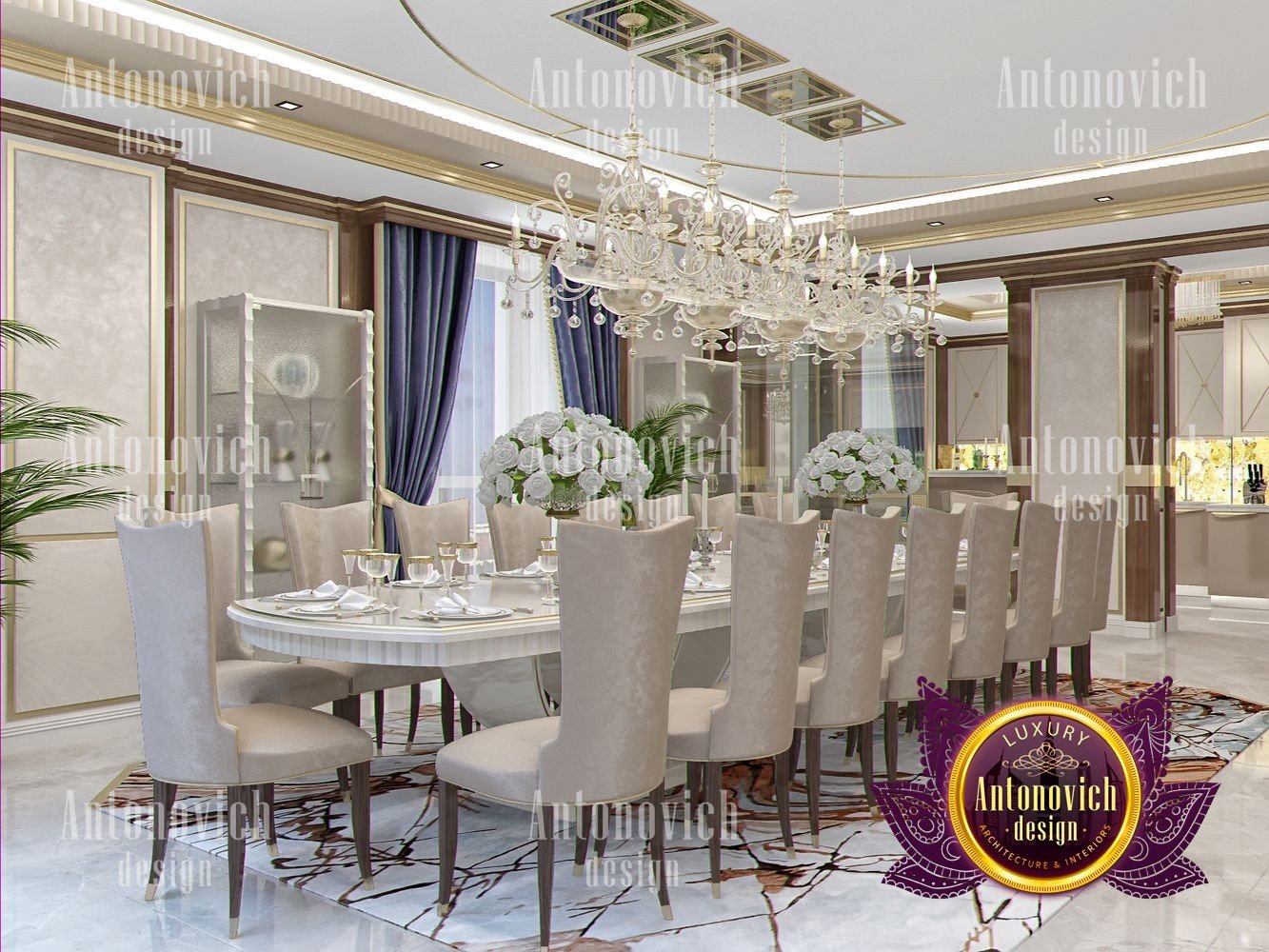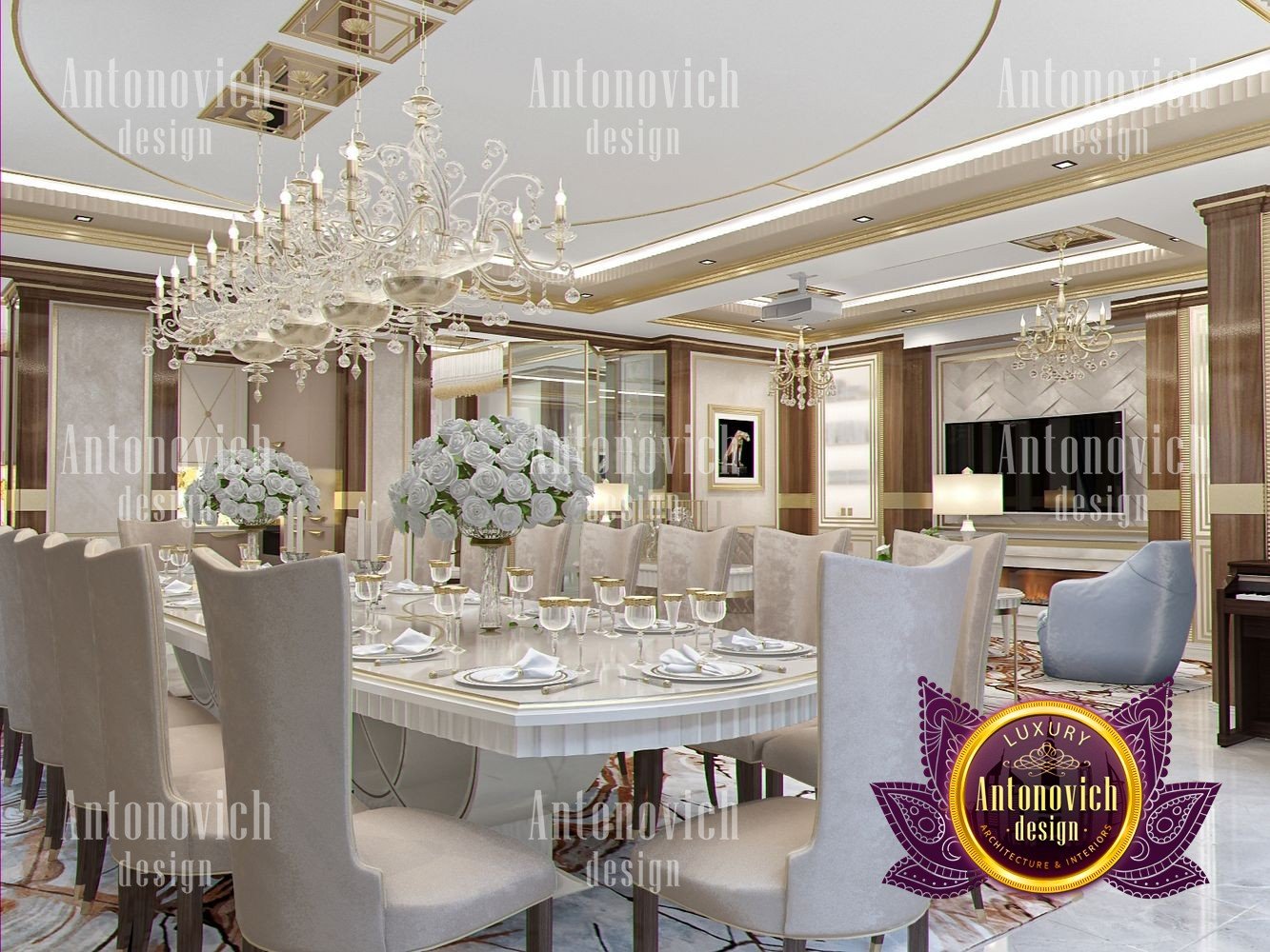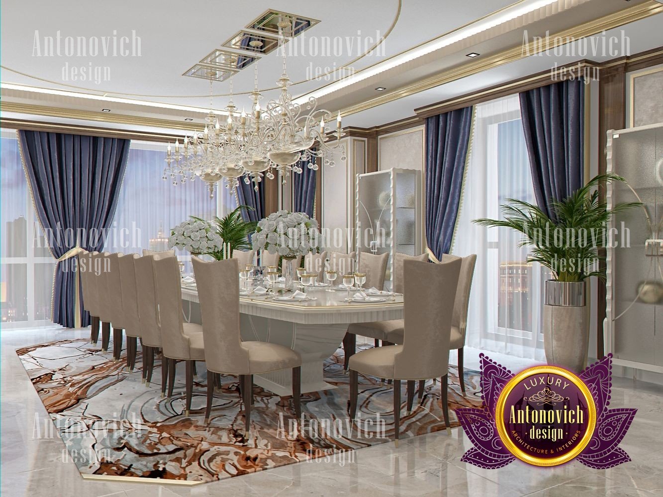 Luxury modern interior design made for the richest in the city. Live in a luxurious apartment with the help of the best luxury interior design company: Luxury Antonovich Design. Its living room is a combination of luxury and modernism. The beautiful blue and cream sofa are a good color choice. The chandelier is very luxurious with lighting that is equally superb. The dining area is designed to fit many people. The beautiful chairs and table are one of a kind with their luxury design.GORGEOUS DECORATION WITH LUXURY DETAILS