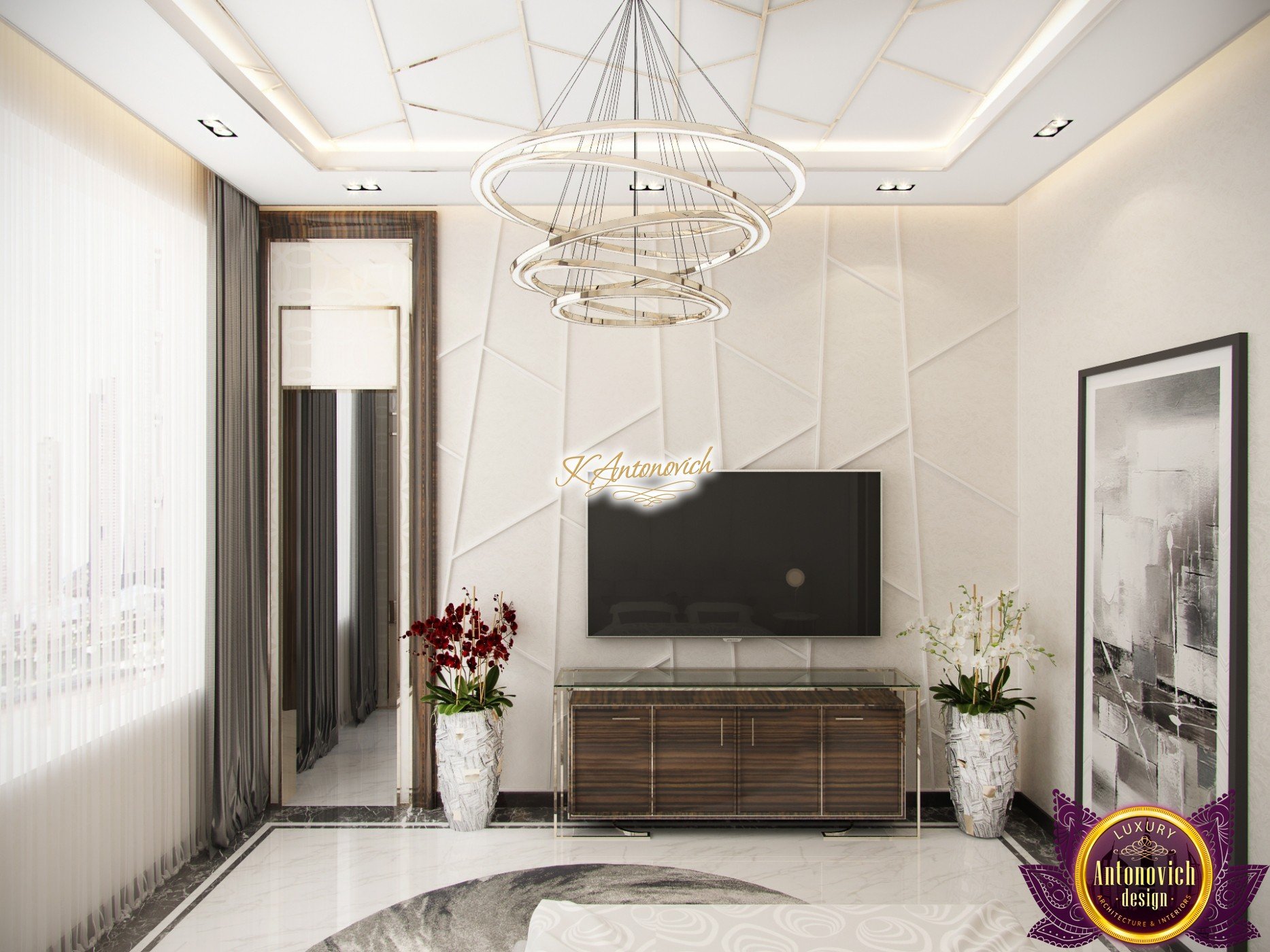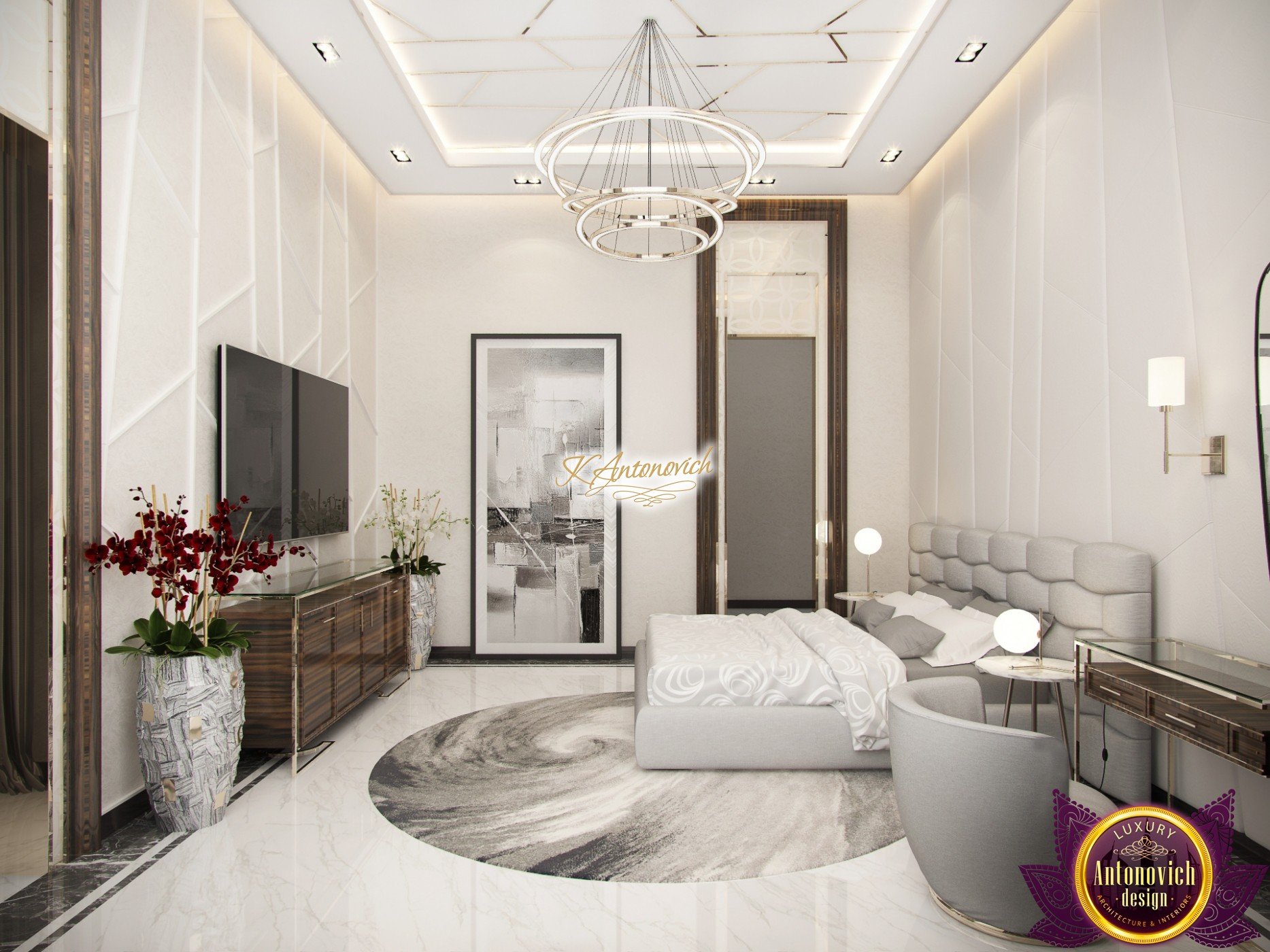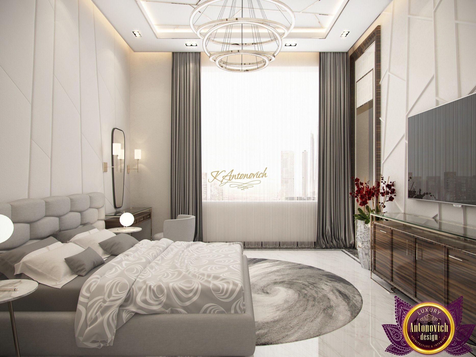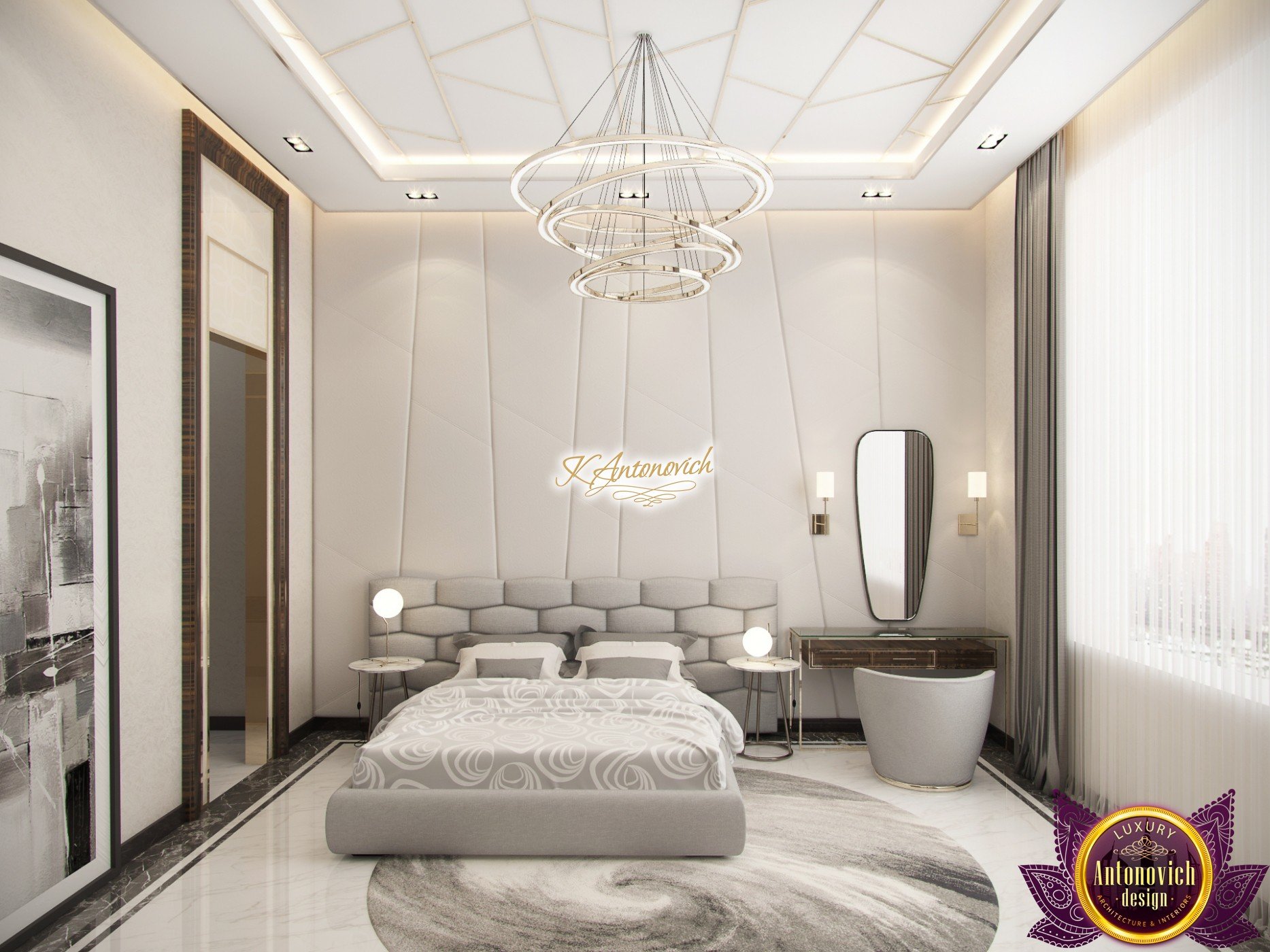 Part of the work on a design project of a luxury apartment has been the development of interior design bedroom for guests.Our customers are very hospitable and welcoming people who want with help of the bedroom interior to maximize demonstrate that they are always welcome guests and are ready to give them the best. The design of a bedroom combines minimalism style and modernity eccentric accents. The interior is dominated by a warm range of brown, cream and chocolate hues. Ceiling decor looks volumetric and dynamic.Suffice deep niche is outlined by a thin gold line and illuminated from within. The bedroom interior lighting provides elegant table lamp, an elegant chandelier, and ceiling lights. Curtains in a minimalist style of plain silk shade of milk chocolate brought to the interior of a bedroom very cozy mood. The Delicious mood of the bedroom interior consists of many original design ideas.So, the decor panel behind the headboard may well resemble a white chocolate tiles. The decoration of the walls is dominated by an elite plaster cream-colored with a matte effect, against which look great panels of wood, lacquered. Furniture made of dark lacquered wood fit perfectly into the interior.And using an ornamental frame of the same wood, interior designers very harmoniously put into the space of the guest bedroom a large plasma panel.Maximum comfort provides a king size bed and two nice armchairs by the window. For floor decoration, interior designers offered a natural carpet and gray marble tiles.
