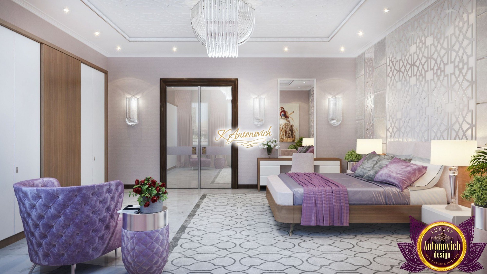 Beautiful purple details can be found throughout the luxury bedroom interior design. Every aspect of this gorgeous luxury bedroom includes all of the necessities for a luxurious home. With its layout, the lovely bedroom is carefully designed. The magnificent designs, such as patterns and accents, are attractive and are ideal for luxury bedroom interior design. With its gorgeous style and creation, the unique chandelier also creates a pleasant ambiance.