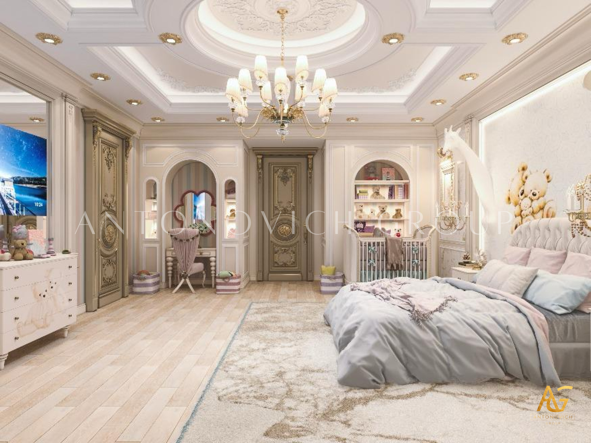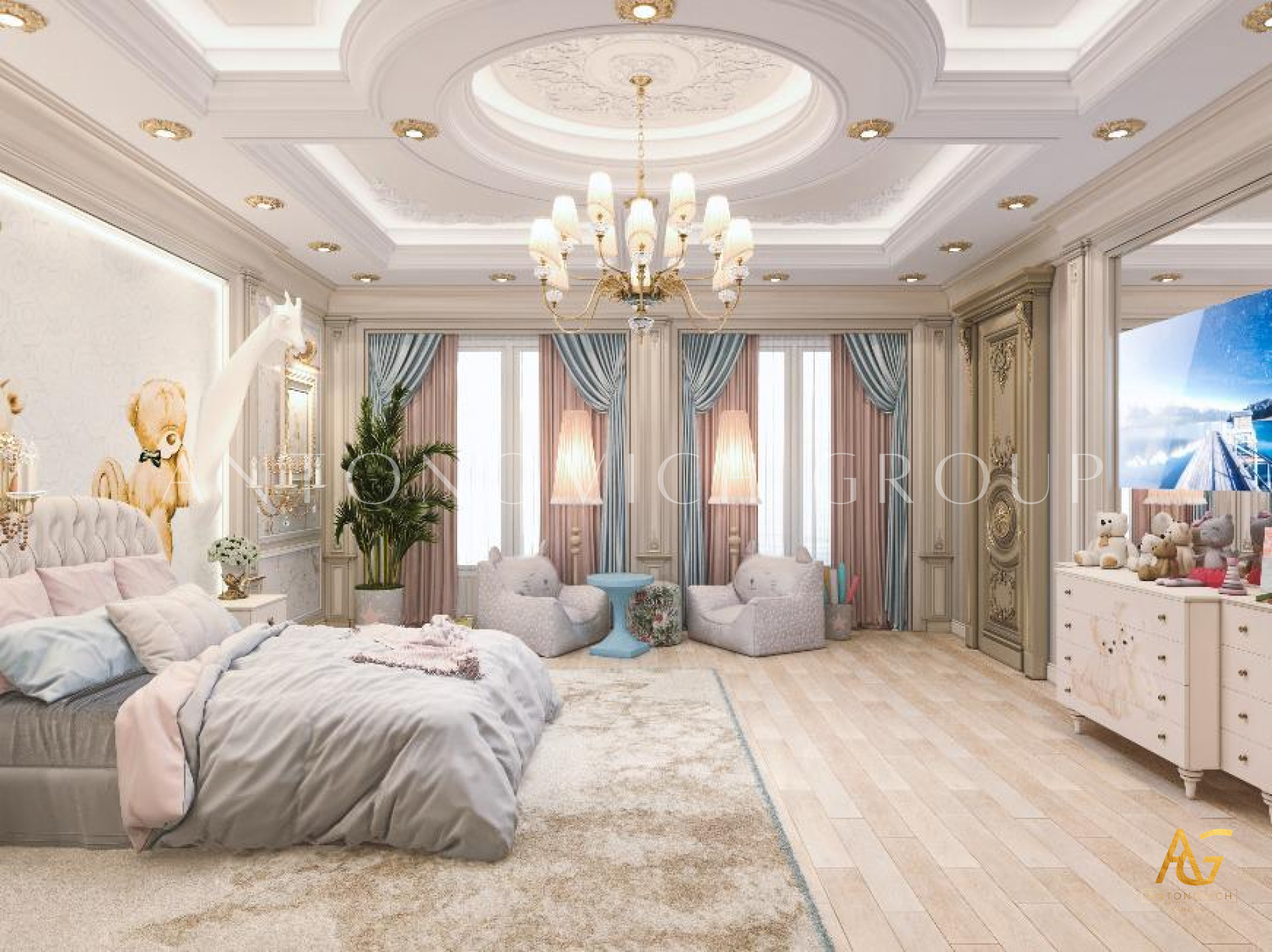 House project in Dubai reflects the dreams and needs of each family member. Apart from a few children's rooms interior designers offered in the attic a separate playroom for children of home owners and their friends. Children's room interior design is the creation of a luxury space in accordance with the child's psychology. Each child is unique as each architectural project is. Dubai Interior designers create interiors that bring up a child's sense of beauty and good taste. Children's room design in the attic of the villa wonderfully reflects the cherished child's dreams of his room, where you can rest and play games or watch movies. Villa Design Dubai is in the classical style, but for the children's room interior project authors proposed a completely different version from other apartment in a contemporary style. Children's room design features are perfectly underlined in the attic room. The arches of the ceiling are decorated with stucco of silk texture, which shimmers with delicate pearly luster. Window curtains are decorated with concise pale blue hue. The basis of the interior lighting became ceiling lights, which are evenly placed around the perimeter of the ceiling. Wall decor has become a highlight of the interior. Glossy panel is supplemented with LED backlight, and one of the walls is adorned with great artistic panels with fabulous scenery. The ergonomic and stylish furniture perfectly blended in the cozy interior of the children's room. Special joy is brought to children's room with a fairytale castle and library area with a decorative starry sky on the ceiling.