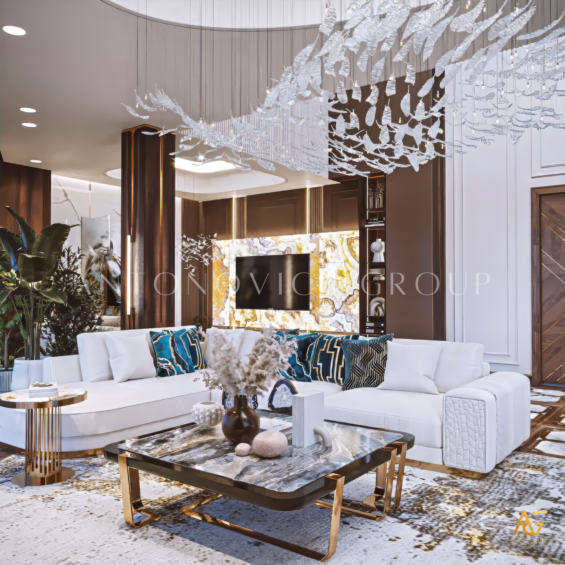 The concept of “exclusive design” at Antonovich Group is more than a title — it represents a commitment to authenticity and craftsmanship. Every project is uniquely developed, ensuring that no two living rooms ever look the same. From custom-made furniture pieces to bespoke lighting installations, every element is designed to complement the architecture and spatial dynamics of the home.