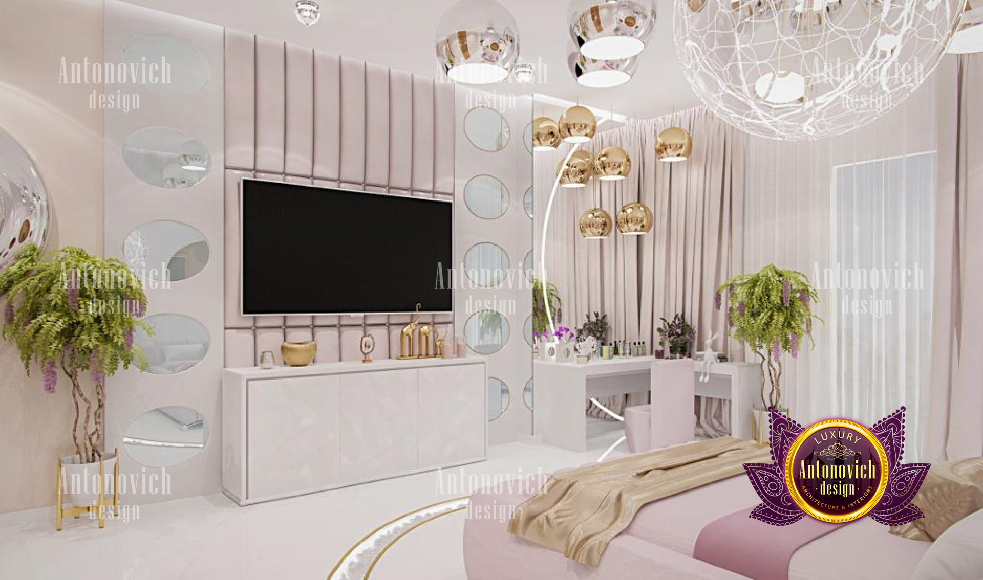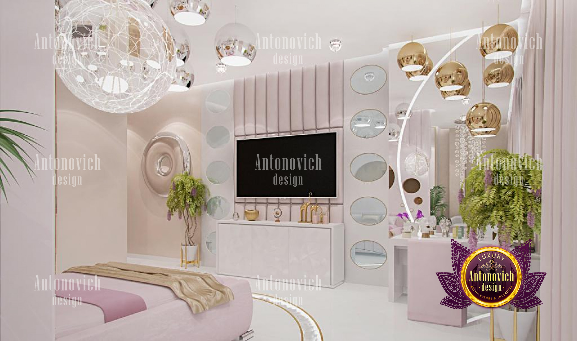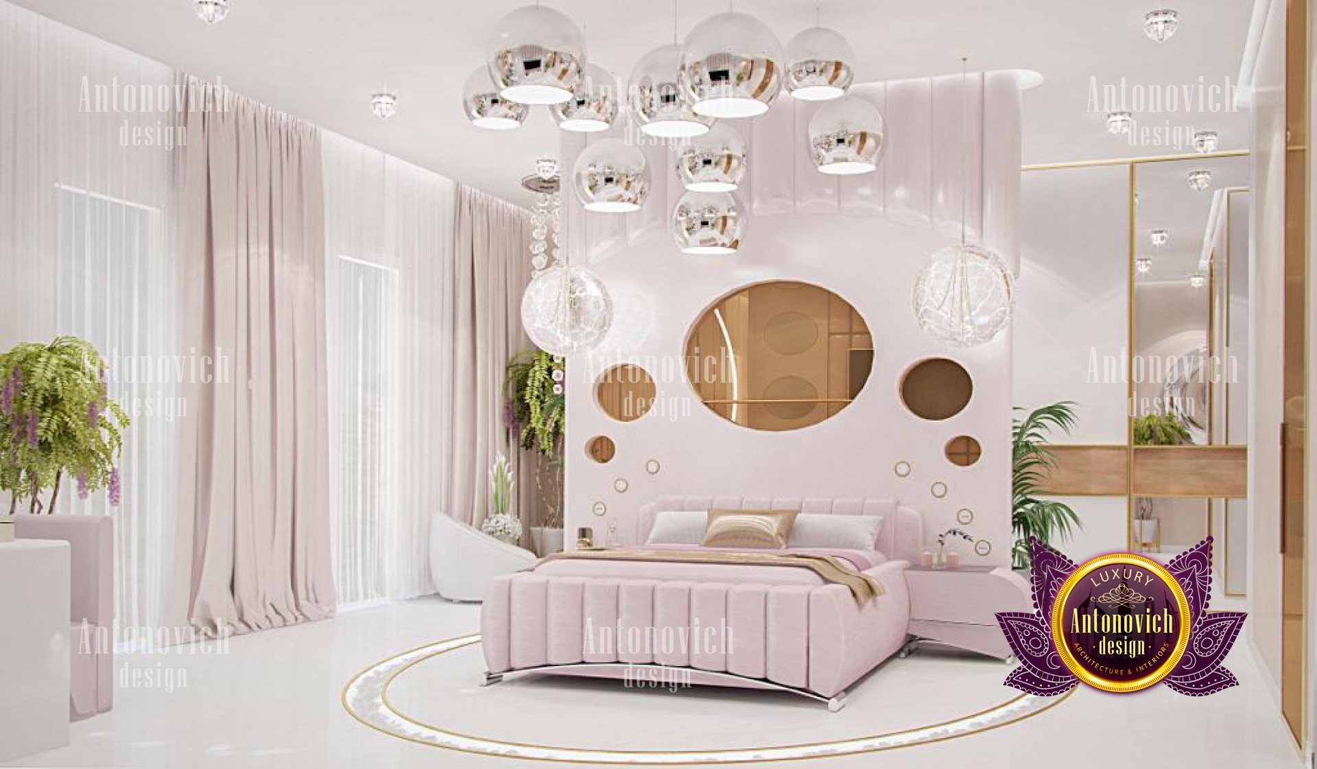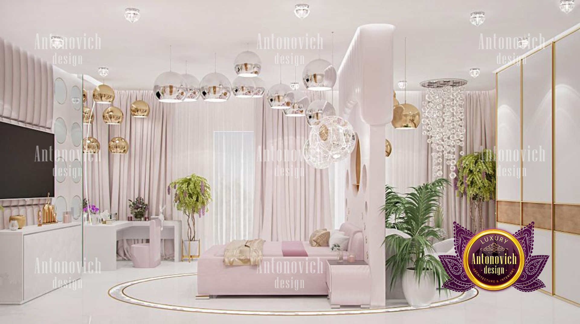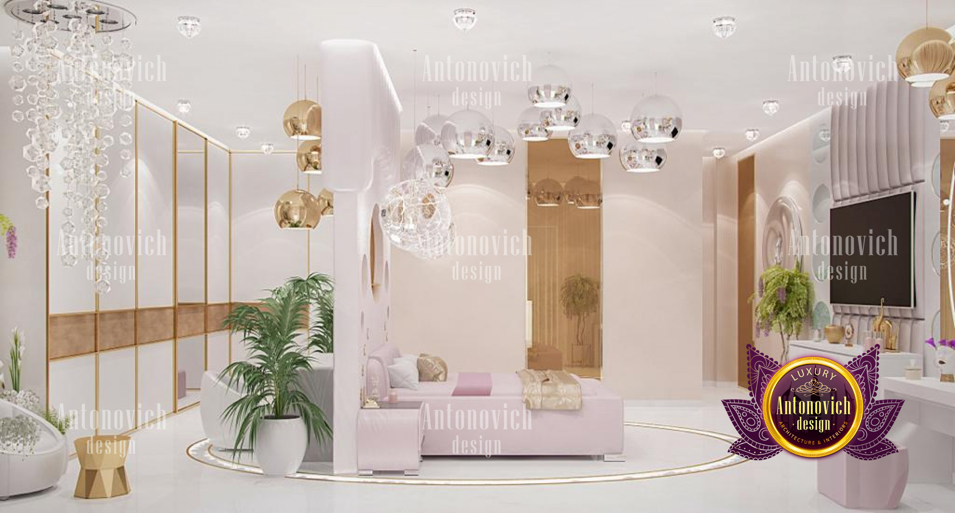 This magnificent bedroom interior design is certainly a masterpiece made for maximum luxury by the best interior designers in Jeddah, with pink highlights and lovely accents. The interior design is elegant, with excellent furniture and decorations. This stunning work by Luxury Antonovich Design is made with so much beauty and refinement, as reflected in the great furniture designs. The space has a relaxing color design with its stunning dark brown accents and white tones. The chandelier is stunning and one-of-a-kind, with a form that complements the luxurious decor.