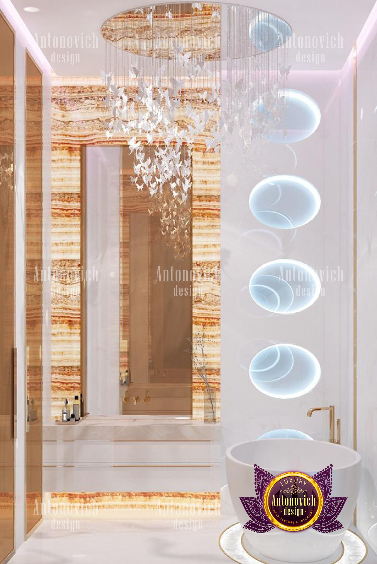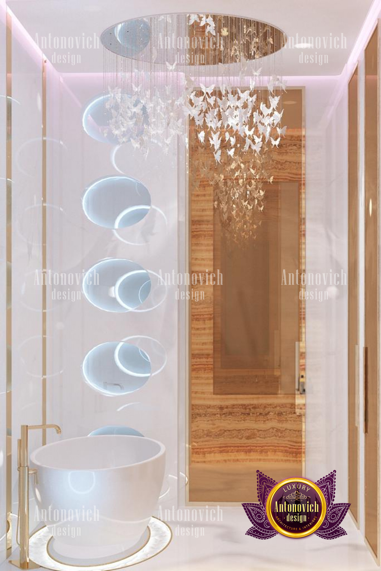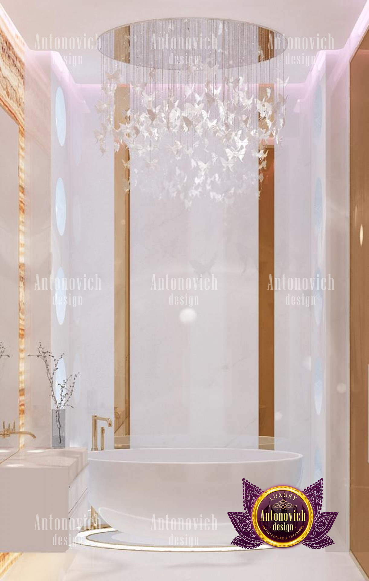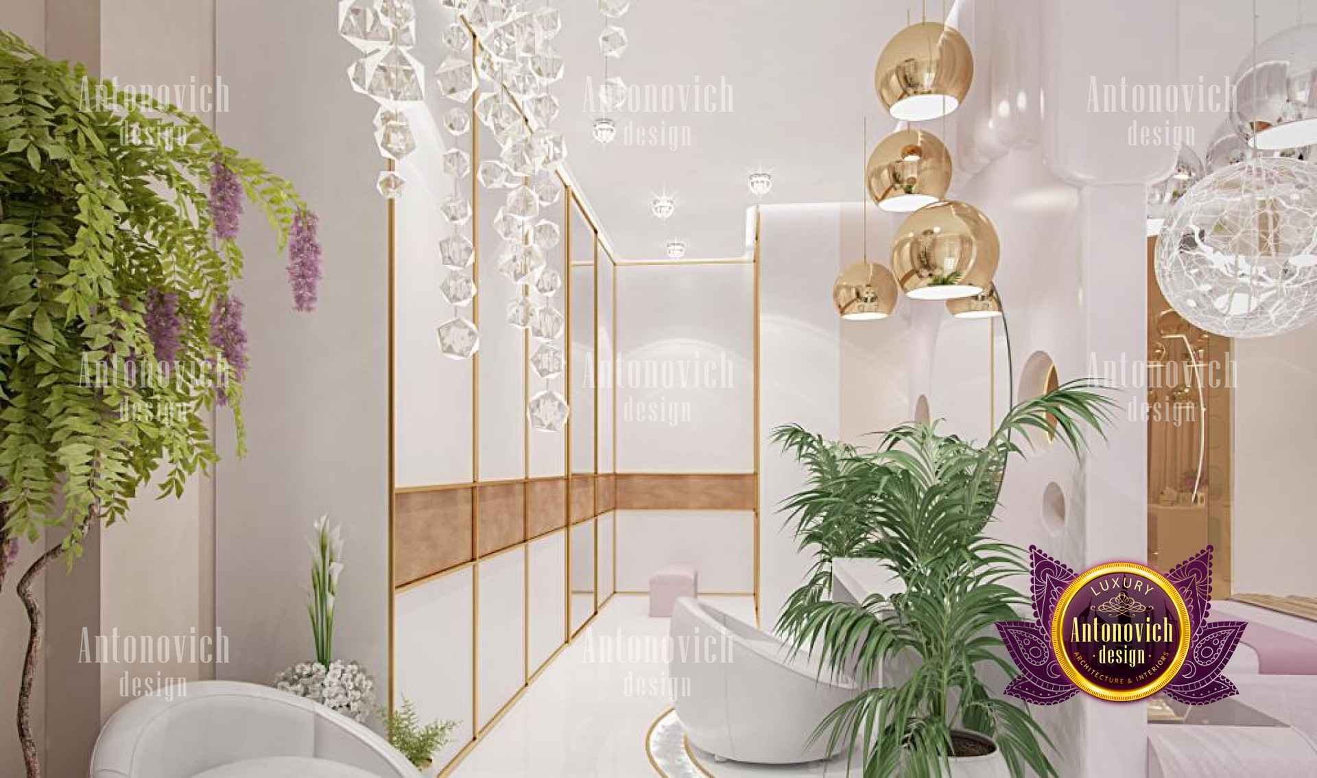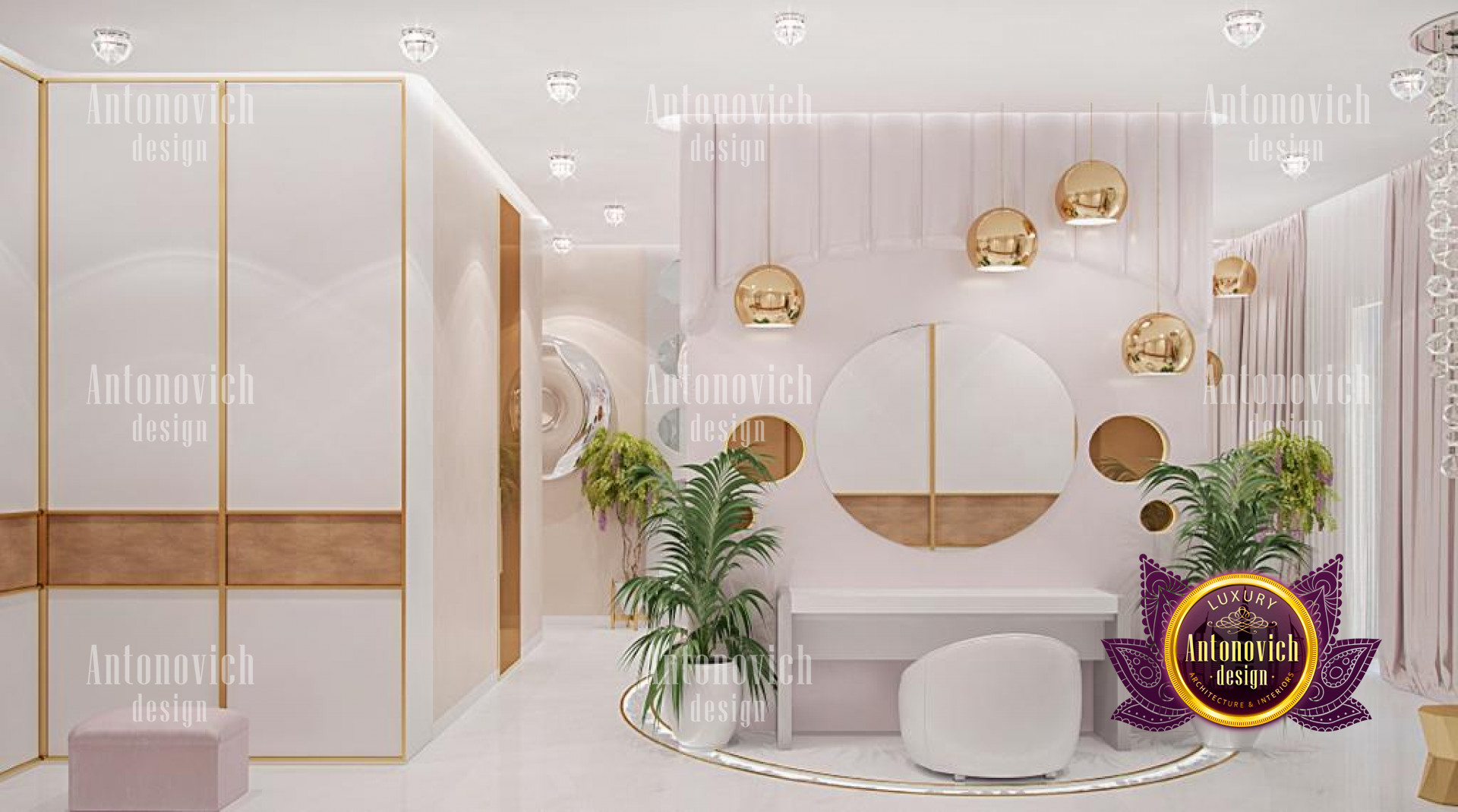 This magnificent bedroom interior design is certainly a masterpiece made for maximum luxury by the best interior designers in Jeddah, with pink highlights and lovely accents. The interior design is elegant, with excellent furniture and decorations. This stunning work by Luxury Antonovich Design is made with so much beauty and refinement, as reflected in the great furniture designs. The space has a relaxing color design with its stunning dark brown accents and white tones. The chandelier is stunning and one-of-a-kind, with a form that complements the luxurious decor.