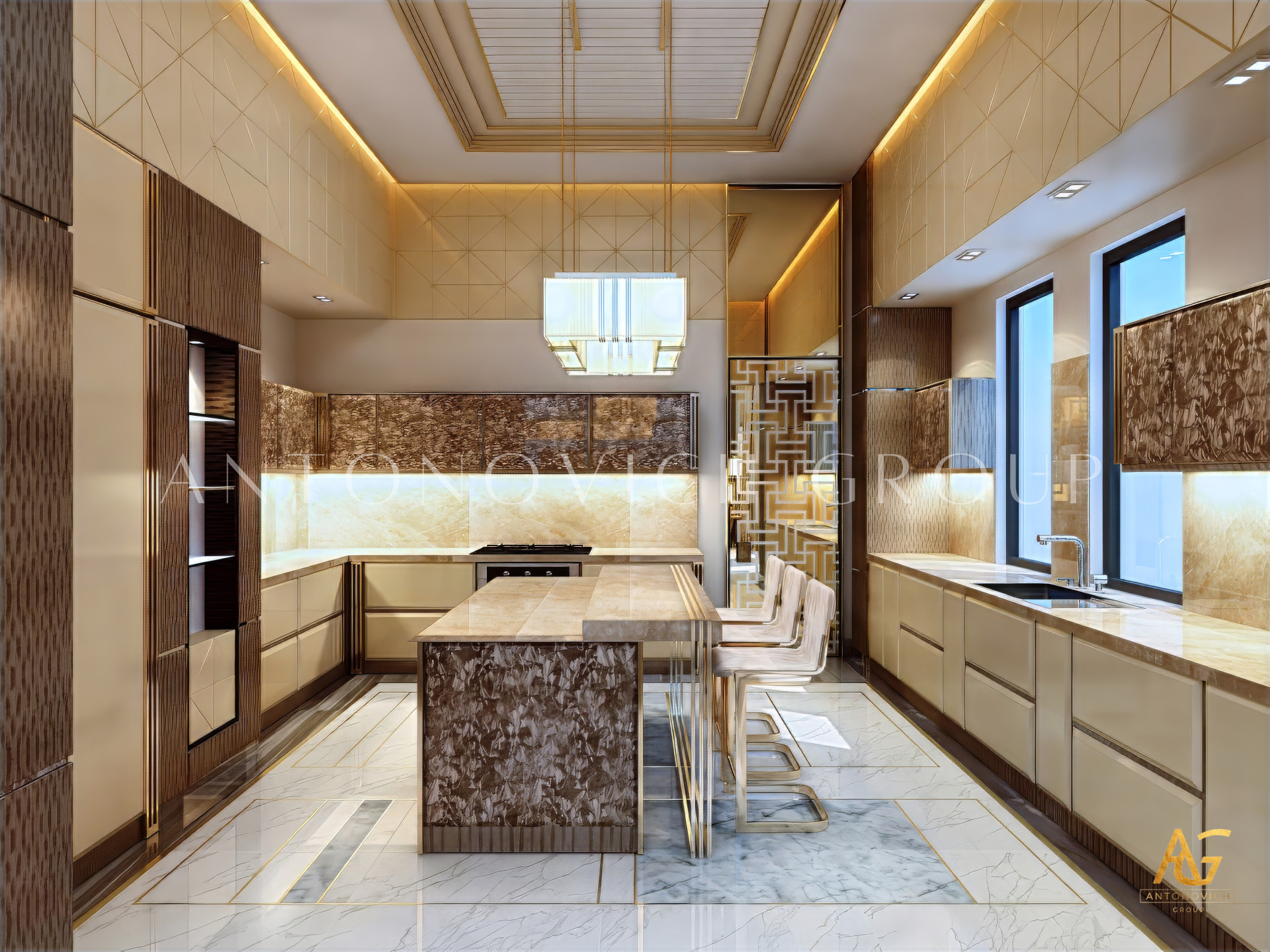 When it comes to the design of interiors of large houses and country residences, the kitchen design becomes so big deal that it can be equated to a design project for an apartment. In this example, we want to present the design of a kitchen for an elite house. This option included the design of the kitchen itself, as well as a small living room and dining area. All these premises are united in a single space on the ground floor of the house. In a small but very cozy and luxurious living room, you can enjoy meals and drinks while watching movies on a large plasma panel. In the decor, interior designers used all those moments that are present in the rest of the rooms. The window was decorated with luxurious Italian curtains. Upholstered furniture with carved decor and gilding filled the space with the charm of royal luxury. Molded decor and elegant chandeliers in the decor of the ceilings complete this beautiful solemnity in the interior. The living room smoothly flows into an interesting variant of the dining area. Interior designers violated traditions and canons and offered a very convenient option for a large counter with a tabletop made from natural marble, which is surrounded by soft chairs in beautiful upholstery. Such a bold move is justified. After all, according to the draft of the house for the reception of guests, there is a separate large dining room. And here you can get together with your family at any time of the day. A warm palette of hues and juicy accents create the right mood of happiness in the interior.