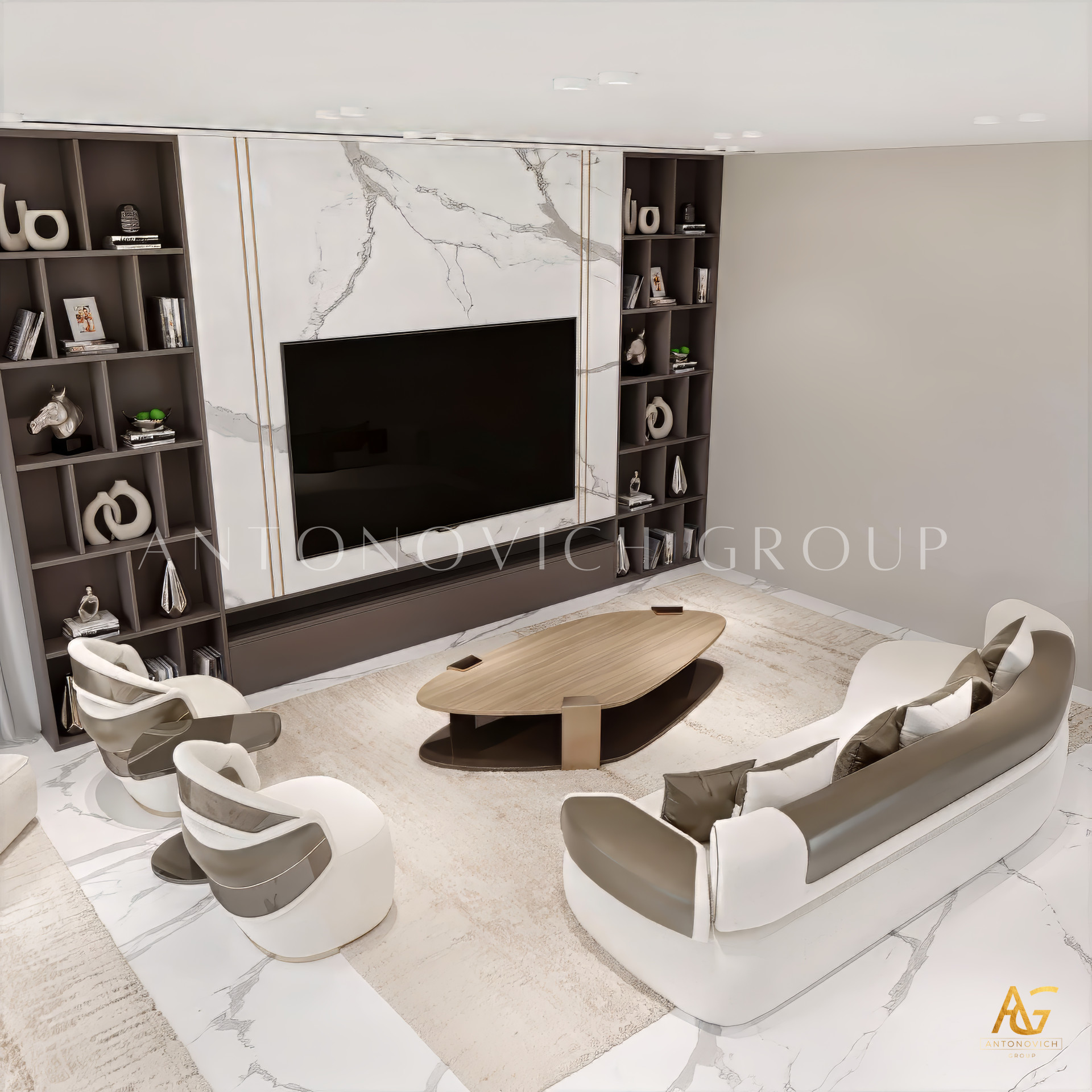 One of Antonovich Group’s hallmarks is its expertise in space planning solutions. For living rooms, this means creating a seamless flow between seating areas, entertainment zones, and access to outdoor or adjoining spaces.