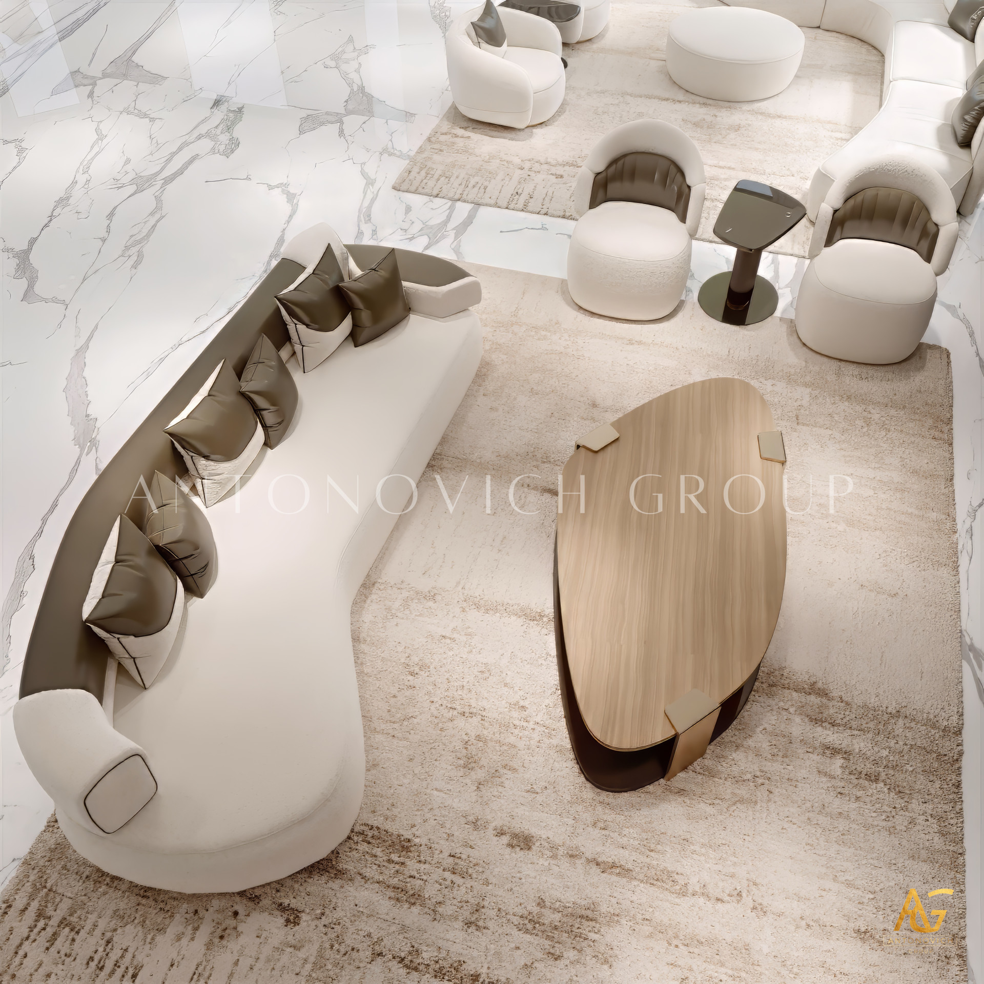 The use of premium materials such as natural stone, polished wood, and high-quality textiles reflects Antonovich Group’s commitment to luxury. Whether it’s a sleek modular sofa, a handcrafted accent chair, or an artistic centerpiece, every element is thoughtfully chosen to elevate the interior.