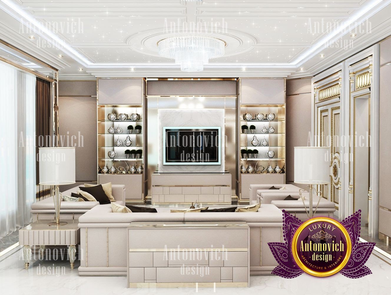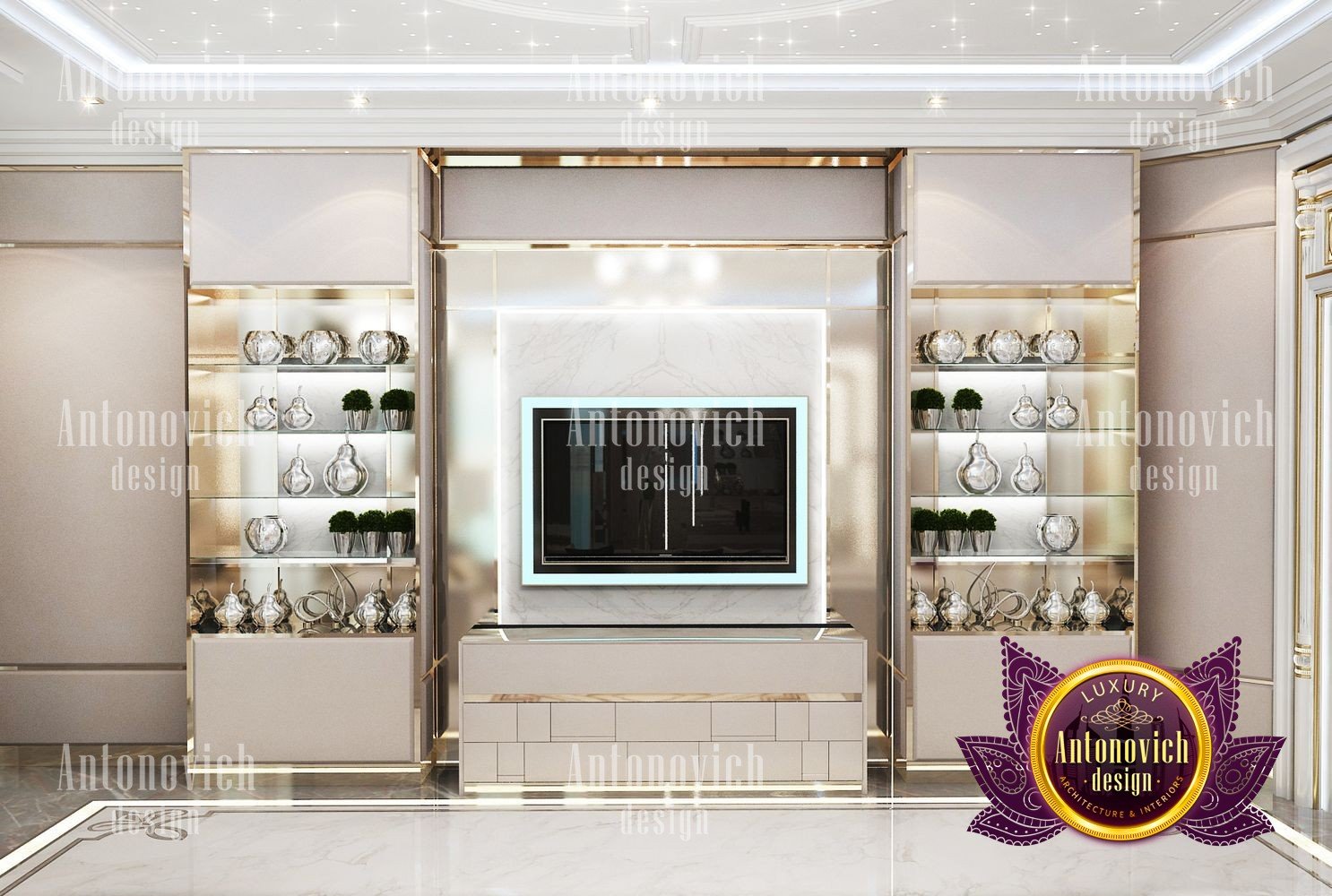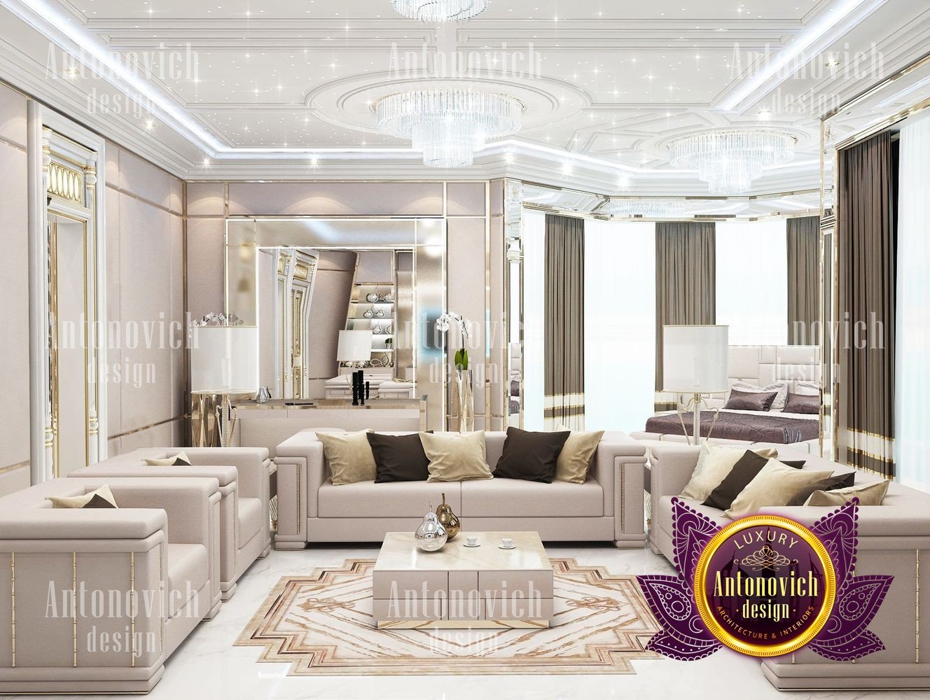 The flight of a designers fantasy depends on many factors. It is the inspiration, first of all, from communication with customers and penetration into their dreams. But even such a moment as a large area for the project of the interior of the bedroom can add many new moments in creating unique design ideas. The main bedroom in the big house became a luxurious masterpiece in the Art Nouveau style. The main zone is located near a large semicircular panoramic window. Beautiful curtains made of silk chocolate shade evenly distributed with vertical folds around the perimeter of the window. The elegant ceiling was decorated with a polygonal suspension with a lot of lamps and lines of mirror stripes all around the perimeter. The design of the ceiling becomes the most important point in the interior of the bedroom. In such space, in the morning and evening lying in bed, you can admire such bright and elegant details. The large headboard is upholstered in natural leather with a texture in geometric ornament. This extravaganza of bright and festive notes is complemented by the floor design made of natural marble and onyx elements with illumination. Continued the interior by a small living room with stylish furniture in a modern style. A lot of showcases with open shelves and lighting. The ceiling is also strewn with small LED lamps, which gives the bedroom interior a very romantic mood. In the decor of the walls, the matte plaster is decorated with thin strips of polished brass, which mirror the shimmering under the light of the chandelier and lamps. The interior design of the bedroom reflects the future fashion trends in the design of interiors.
