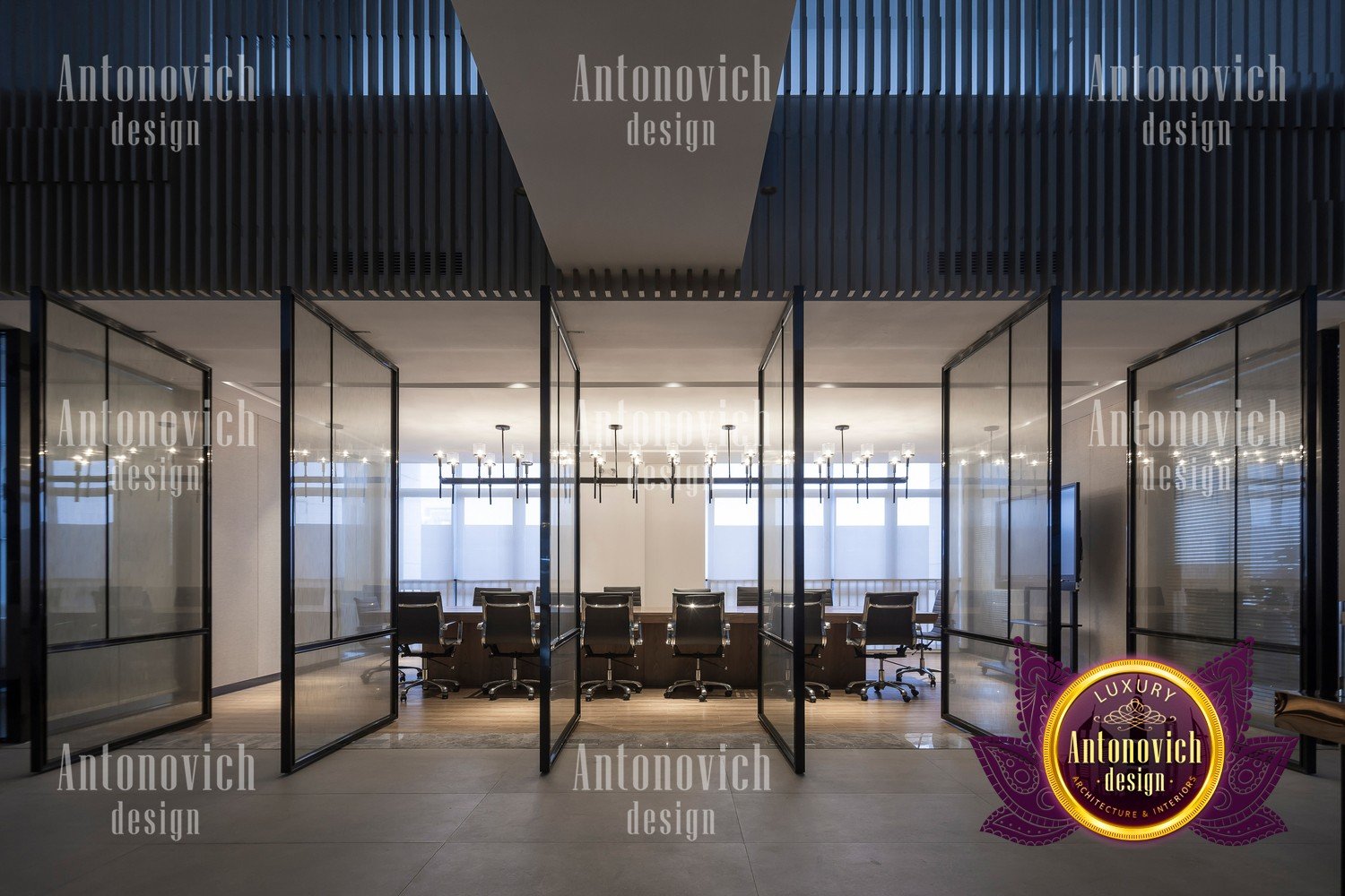 In the office landscape by Luxury Antonovich Design all the tables are arranged in a peculiar order, at a different angle to each other, forming working zones of different sizes and configurations. In this creative “chaos” lies a clear order based on a detailed study of the relationship between different departments and individuals. The situation in the office of such a plan leads to an exchange of views and communication. Thanks to this, company employees are becoming more united in every respect.