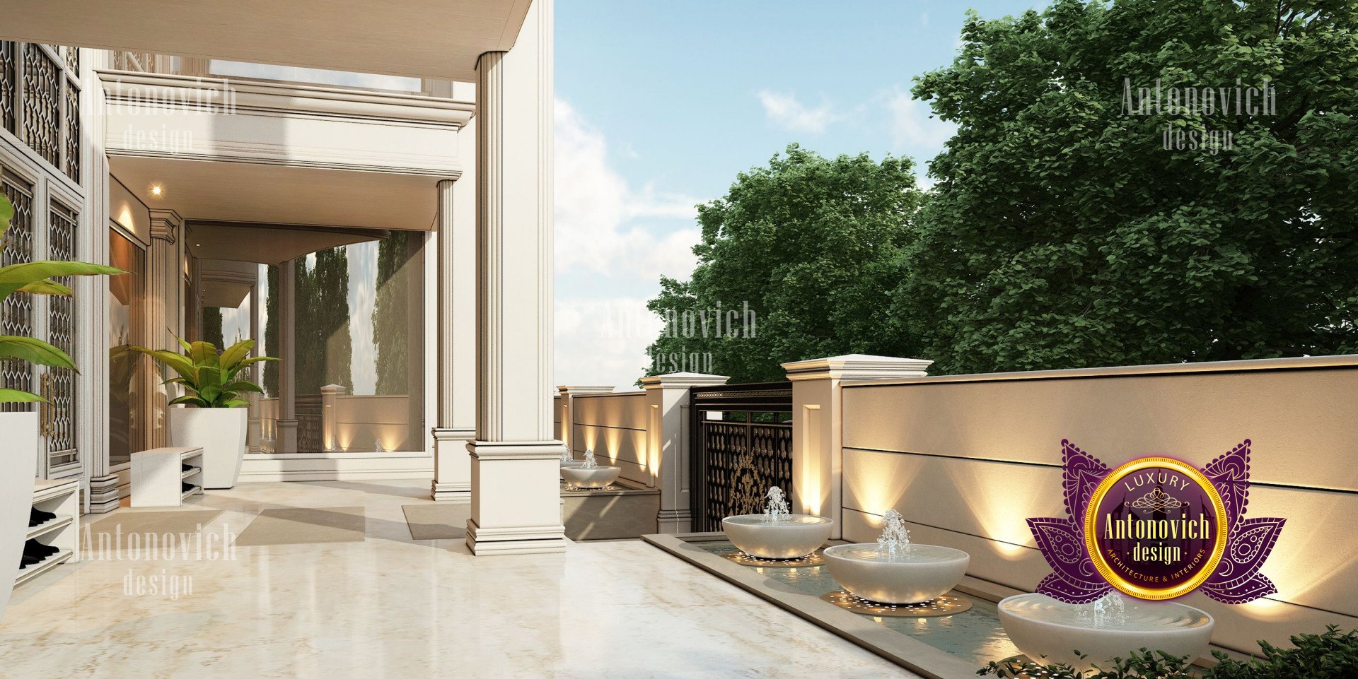 Luxury Antonovich Design created this huge, luxury modern exterior design in Abu Dhabi, which is full of high-end modern external design. It has a very clean design with an all-white, classic façade that is trendy and modern-like at the same time. According to Luxury Antonovich Design, they were required to adhere to a certain appearance and finish that matched the modern theme of this royal exterior design in Abu Dhabi. Straight accents and other subtle modern-style embellishments were incorporated into what is still essentially a conventional modern exterior design in Abu Dhabi. The luxury exterior design in the Abu Dhabi facade appears to be a contemporary design from the main entrance, but the luxury exterior design in Abu Dhabi is really multi-level, spreading down towards the back. A large garden or landscape may also be seen in the heart of the exterior in Abu Dhabis stylish external design. Another attractive feature of this modern exterior design in Abu Dhabi is the excellent landscaping. The large open area may be used for large events. A really lovely door may be seen in the modern exterior style of the UAE. One of the hallmarks of the classic exterior design in Abu Dhabi is the towering pillars.