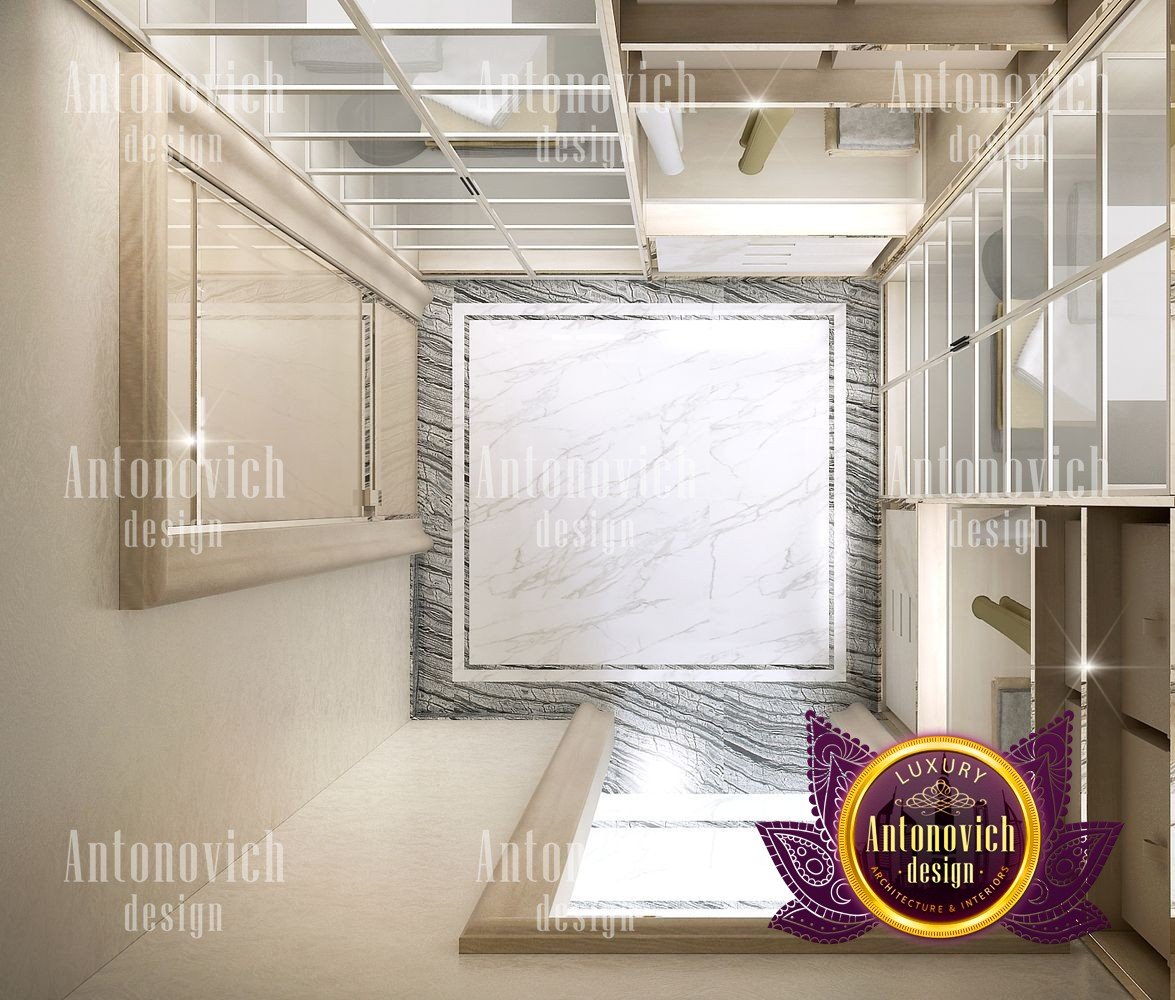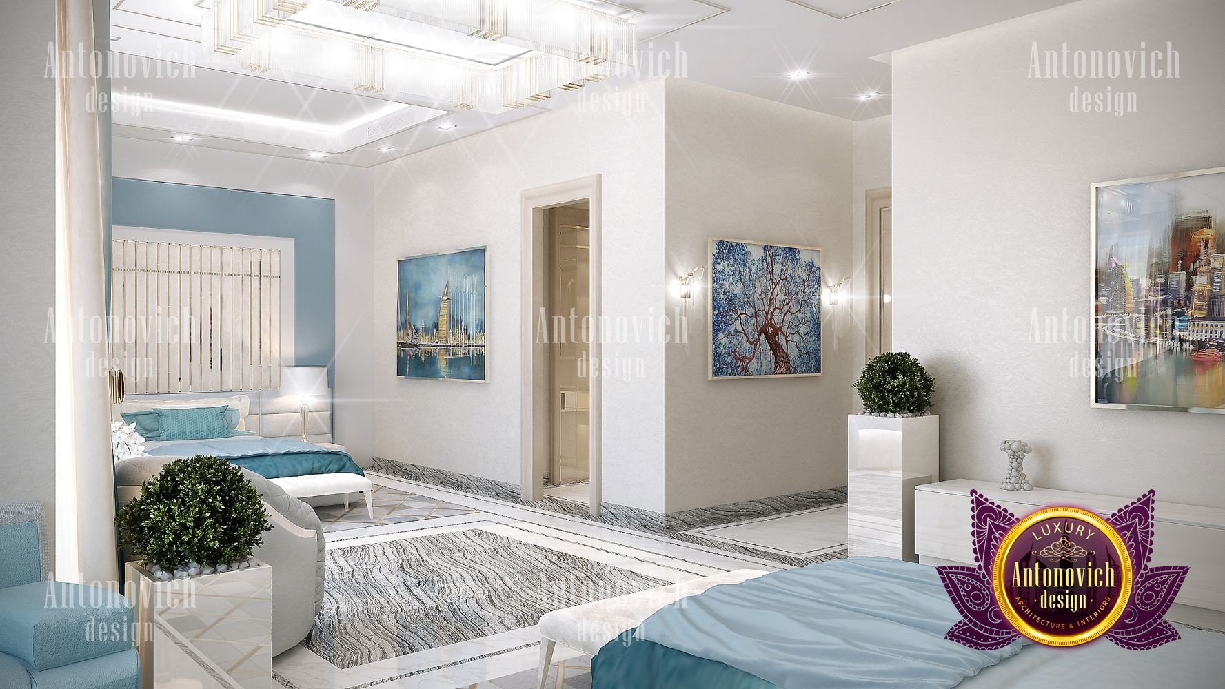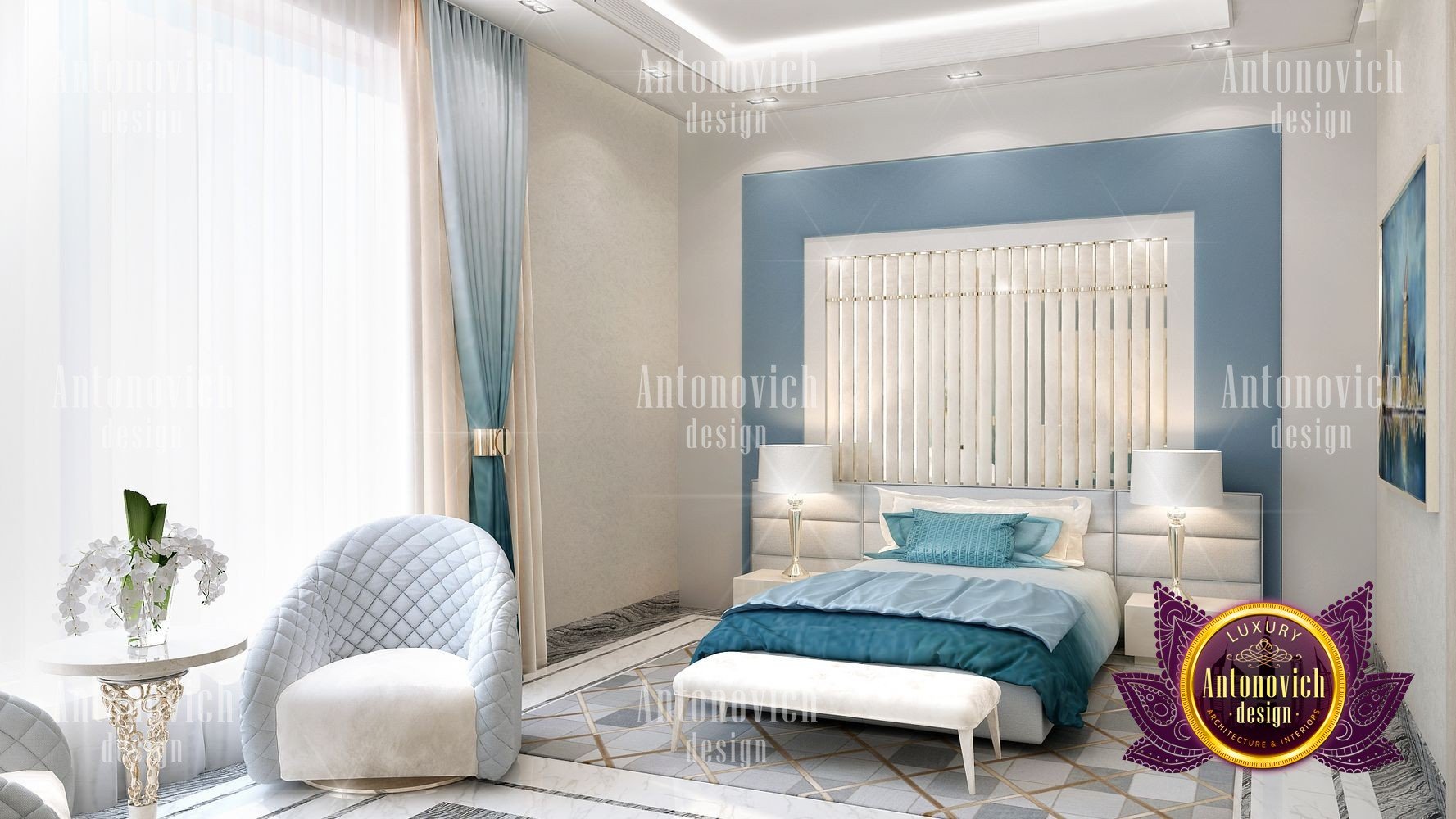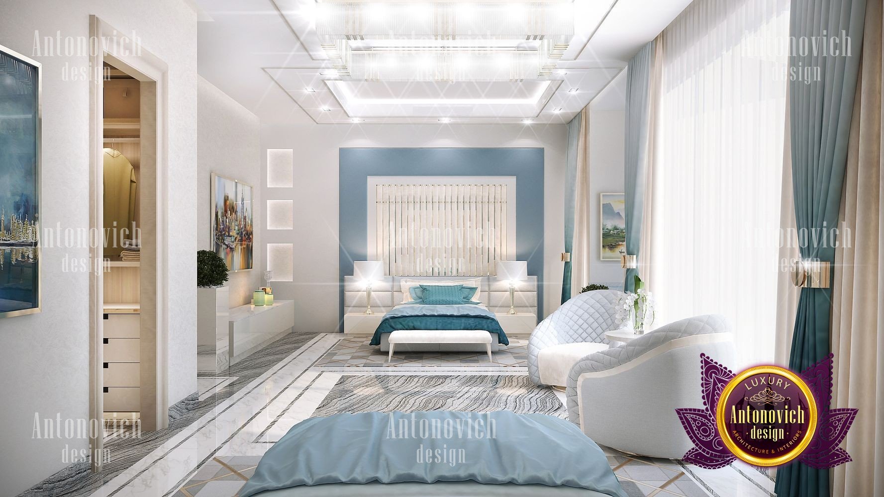 Sometimes only a geometric pattern can play a decisive role in the formation of an artistically expressive image of the interior. And in this bedroom, the beautiful motifs of the mesh rhomboid ornament exquisitely decorate the interior. The interior design of the bedroom combines classic style and art deco motifs. In the best traditions of the mentioned above art deco, the wall behind the headboard was decorated with large faceted mirrored panels. It not only visually expands the interior but also makes it very catchy and bright. Inside this radiance, a decorative panel of many stylized suns is very expressive and bright. To highlight these bright and elegant accents, the interior designers use more restrained motifs in the decor of the ceiling and furniture. Almost invisible closet perfectly fit into the bedroom interior, without loading it. A pearly white smooth surface of the ceiling was decorated with a neat chandelier with small lamps and a soft backlight along the perimeter. The authors of the project continue geometric improvisation in the design of the floor. On the parquet of light wood interestingly looks a large natural carpet with a large pattern. The bed and soft furniture of ash-blue color become the color accent. The high headboard and its footplate are decorated with a soft panel of silk with small rhombs. For window design, curtains of two types of silk were perfect. One of ash-blue color, which repeats the shade of upholstery furniture, and another of warm bronze shade. Elegant boudoir table by the window is complementing an exquisite image of the interior.