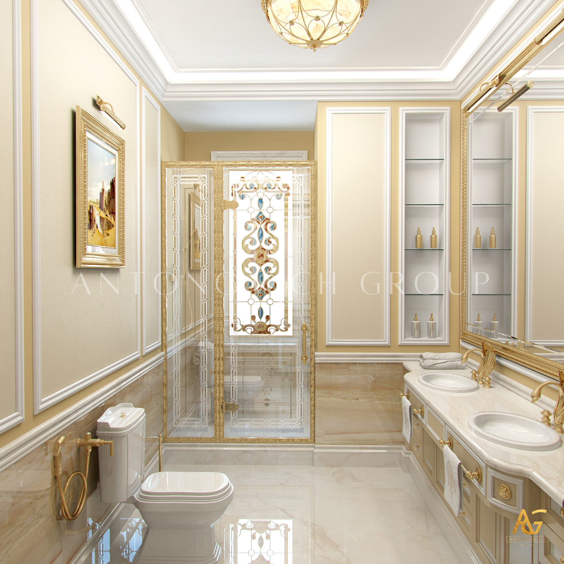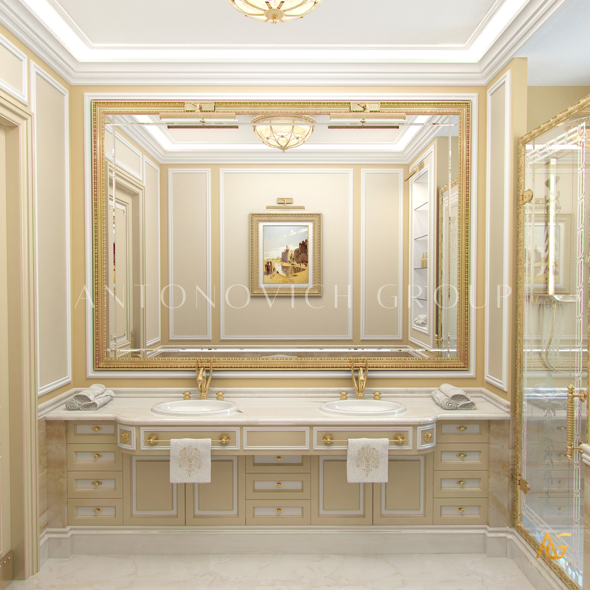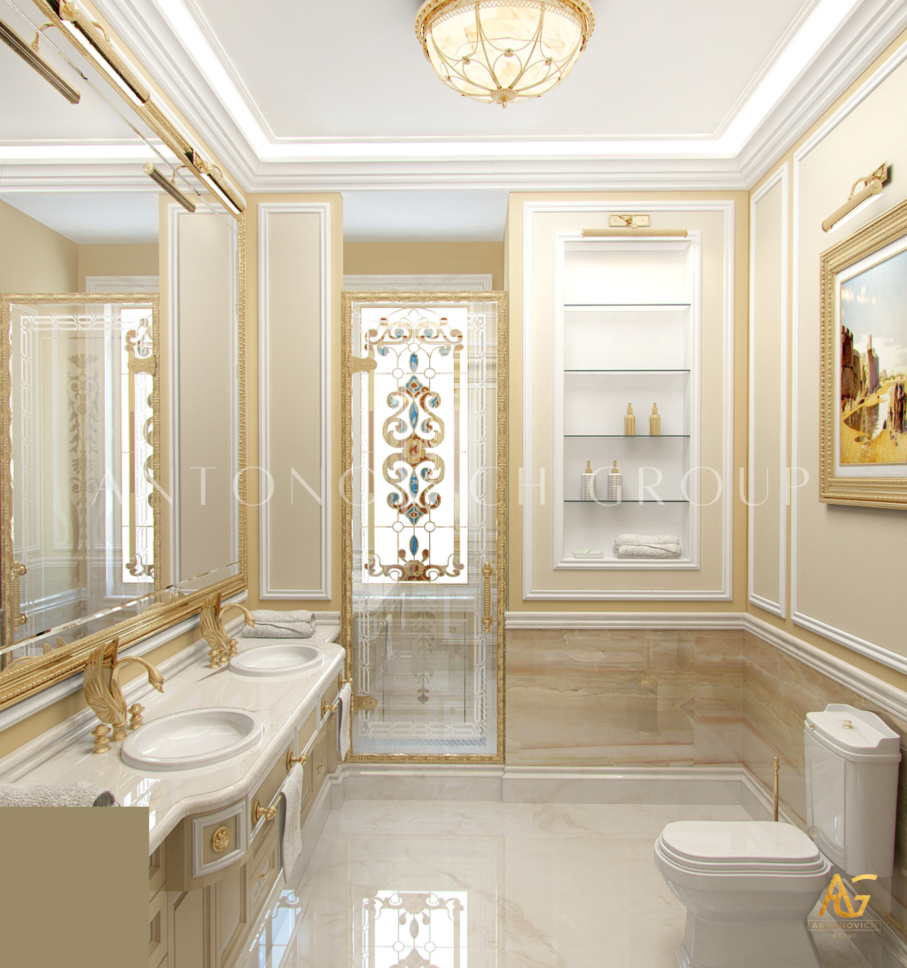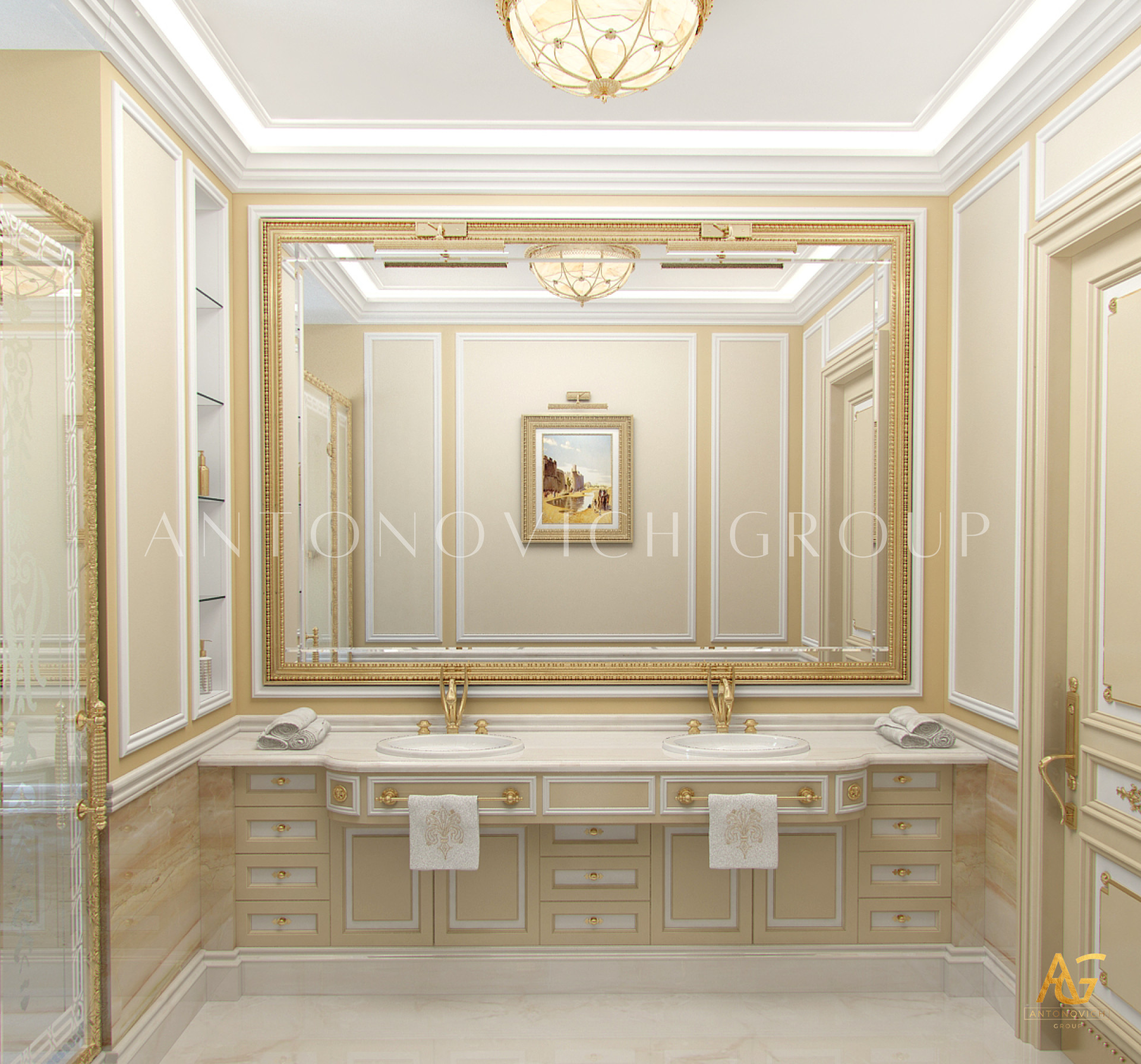 Antonovich Group’s design philosophy centers on customization. Their bespoke bathroom fixtures and furniture are designed to match the overall architectural theme of the house. Freestanding bathtubs, handcrafted cabinetry, elegant mirrors, and lighting fixtures are carefully selected to create a cohesive and luxurious ambiance. Every detail is tailored to meet the client’s lifestyle, ensuring both functionality and beauty.