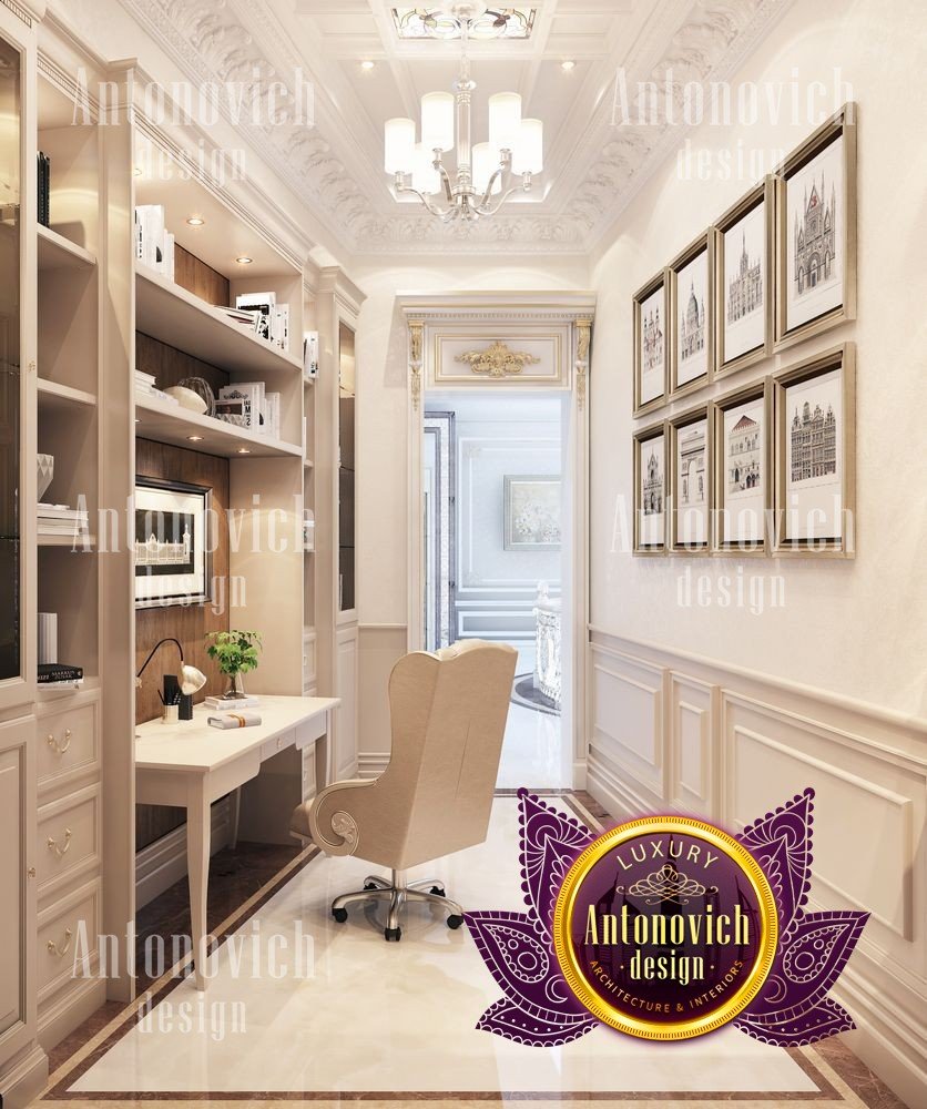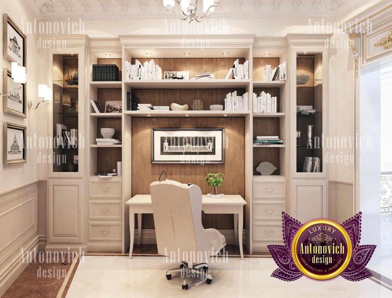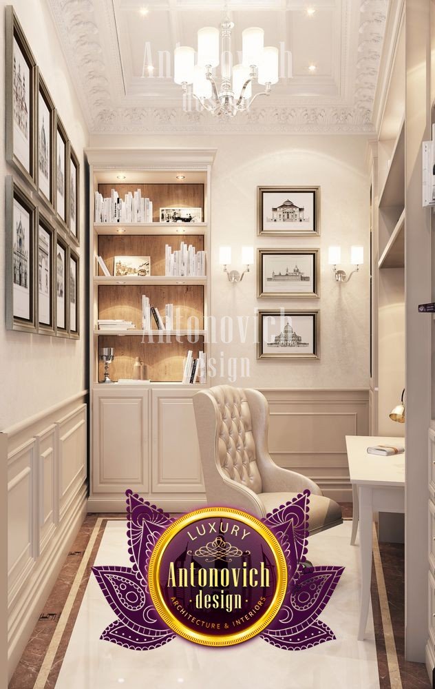 This beautiful brown and cream office room is partnered with classy decors. The huge company of Luxury Antonovich Design has talented interior designers that will help you achieve your dream luxury office interior design. Everything from the racks and table is a top creation. The luxury interior design is designed to give extreme productivity and elegance in order to achieve a luxury vibe for an office interior design. Just like this beautiful luxury office interior design by Luxury Antonovich Design.