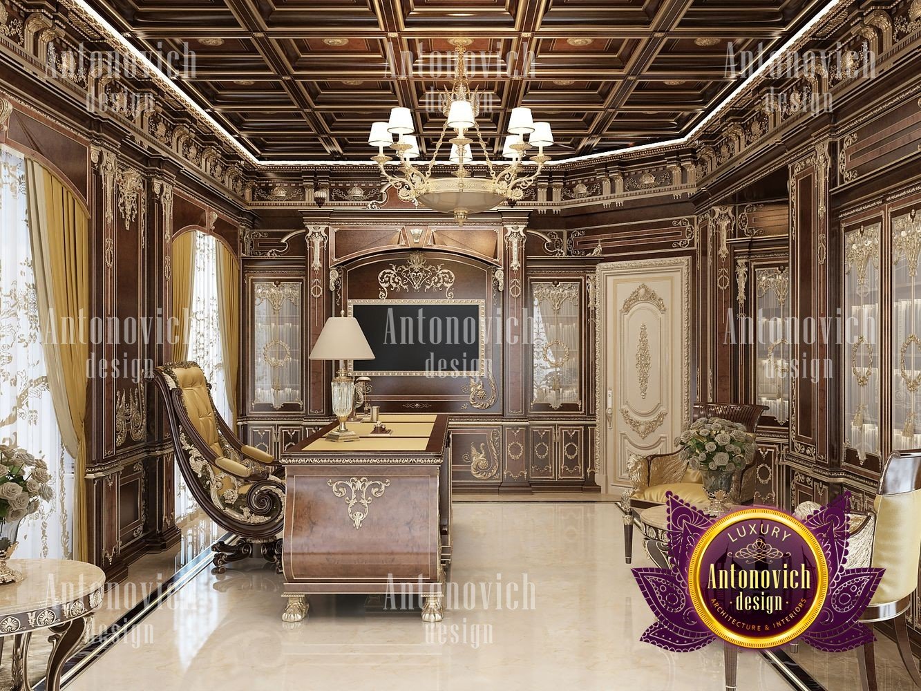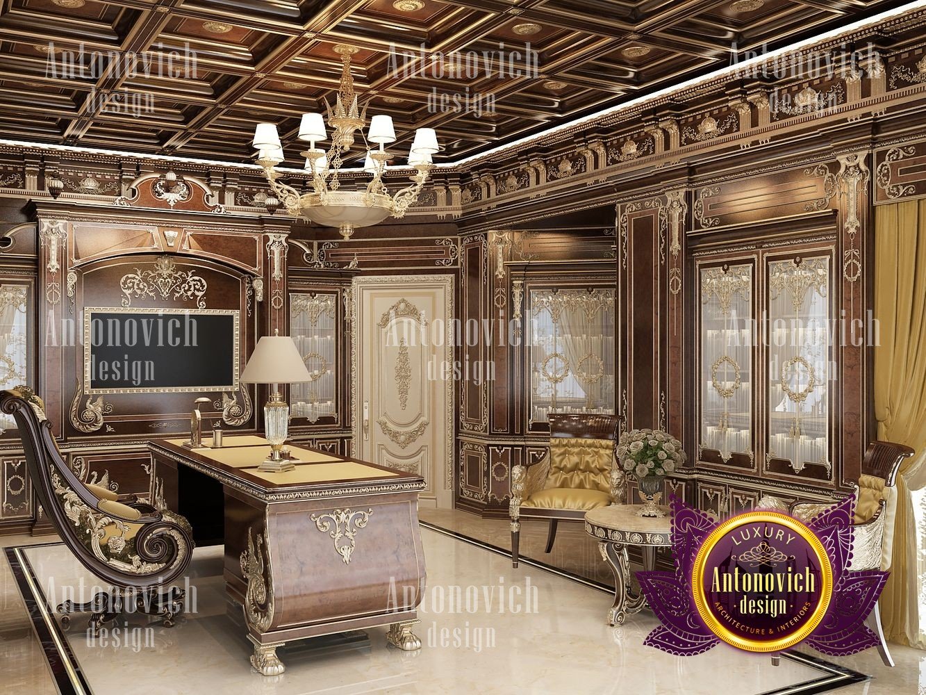 The mood of inspiration, concentration, seriousness and, at the same time, the warmth of home comfort and perfect harmony. It was these moments that interior designers tried to combine when decorating the home office space. A noble, elegant classical style filled the interior of the home office with perfectly right mood. If we look at the details of the decor, we will see many interesting and exquisite moments. So, for example, interior designers proposed to decorate the interior with luxurious silk wallpaper of ash-lilac shade, on which a large floral ornament shimmers with a pearl luster. Wallpaper filled decor panels, which framed very elegant pilasters with gilding in the form of thin vertical lines. Window decor. Curtains in neoclassic style from natural monophonic silk brought a mood of freshness and warmth of home comfort to the room. Upholstered furniture in upholstery made of genuine leather with a light beige shade hints at the respectability of this house. A light soft furniture exquisitely contrasted with a beautiful work table of dark wood. Furniture with its shades in perfect harmony with upholstered furniture, and with a table. In the decor of the ceiling, there is also an elegant restraint and elegance. The niche inside is decorated with a diamond-shaped ornament. The soft LED lighting line and the classic chandelier fit perfectly into the interior of the home office in classic style with a hint of the English classic style.