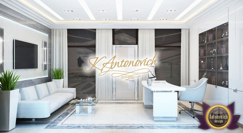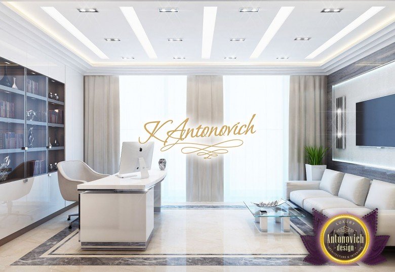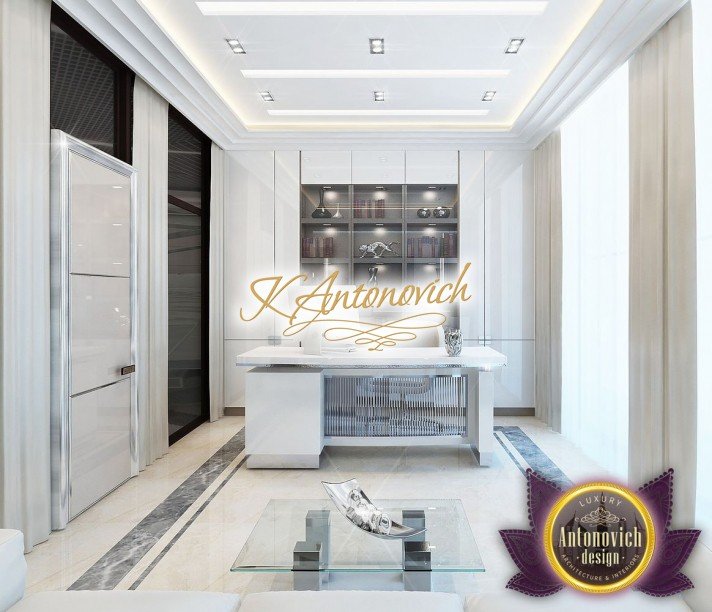 what is interior design from Luxury Antonovich design? In the first place - this is the owners dream about their ideal interior. A perfect interior - this is a comfortable environment in all its aspects. Many of our customers - are successful businessmen and politicians. A comfortable work area it is very important for them in their own houses. And our interior design studio developing unique office design ideas. All these office ideas serve as source of inspiration. This interior design we proposed in a contemporary style with accents of minimalism. It differs somewhat from the overall design of the house concept in classic style. This method is an excellent way for the house owner to dive right working environment. The basis of the colors palette was white. Illumination office interior also plays an important role in the workWe have proposed instead of the traditional chandelier, modern ceiling lamps of different formats. The floor is decorated with marble of light tones.