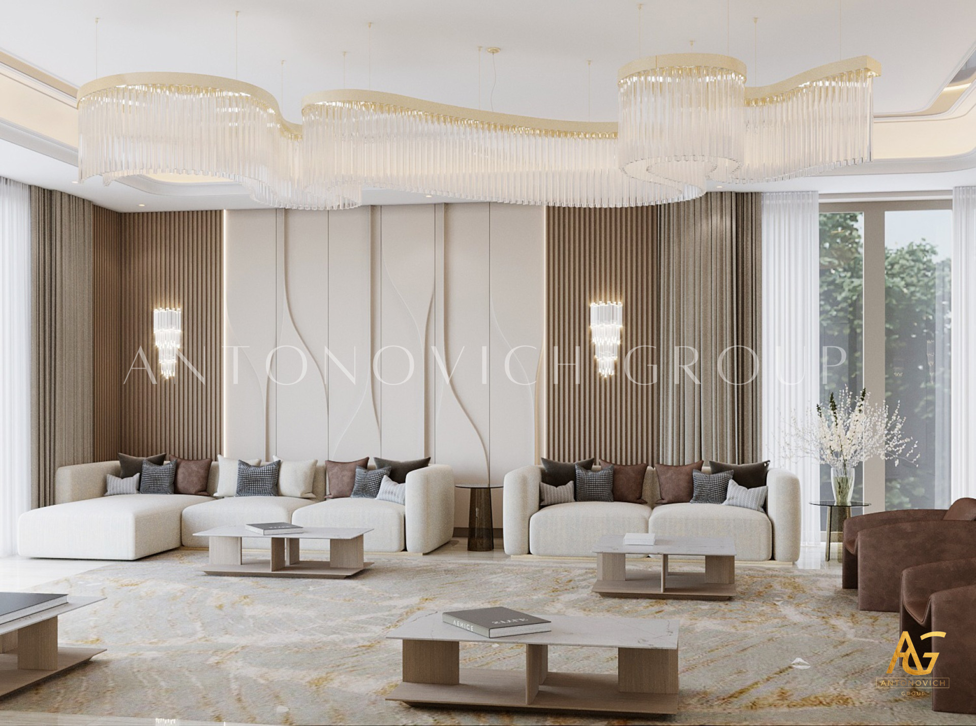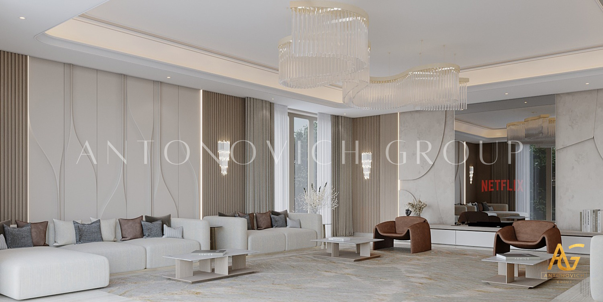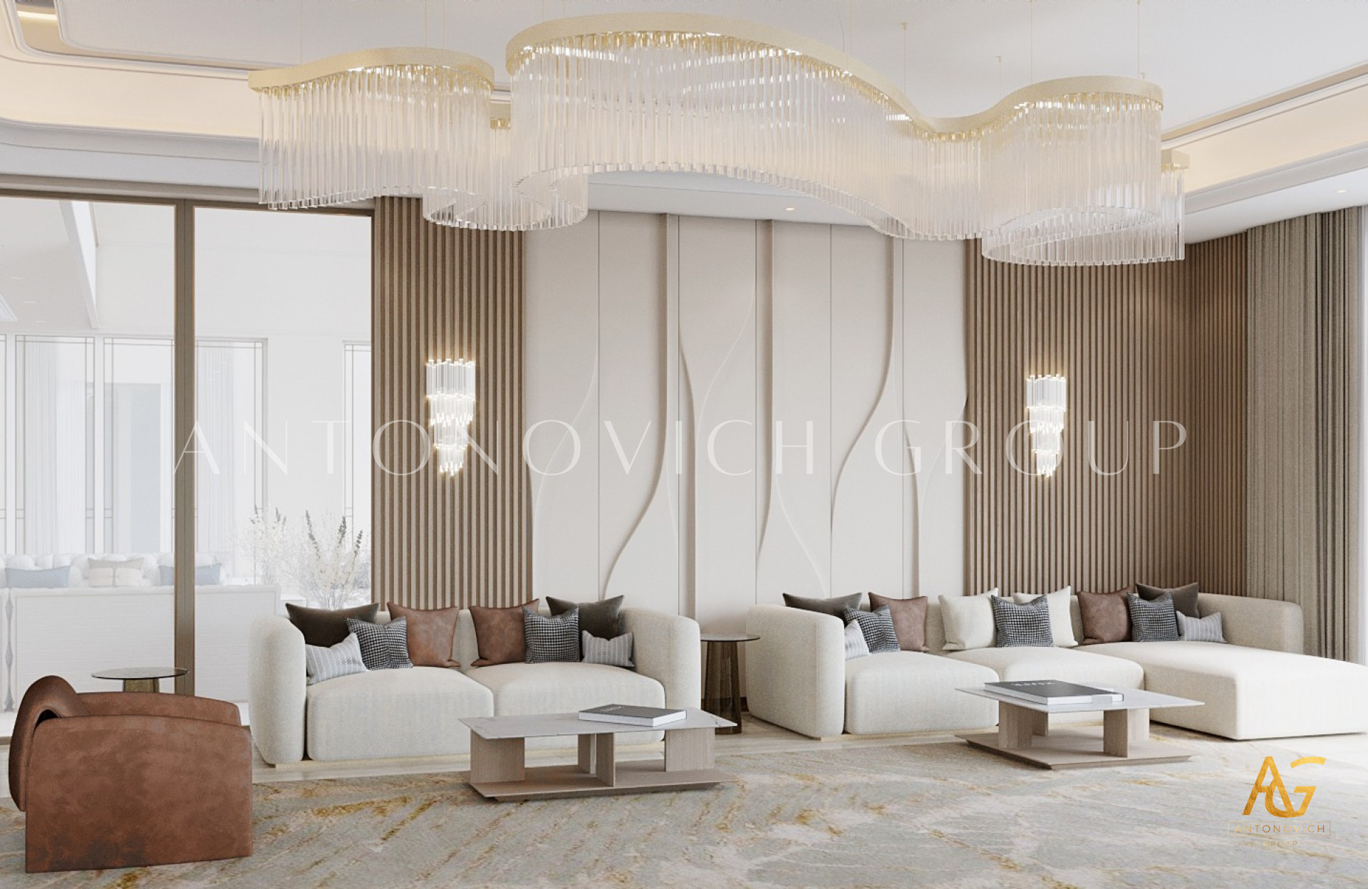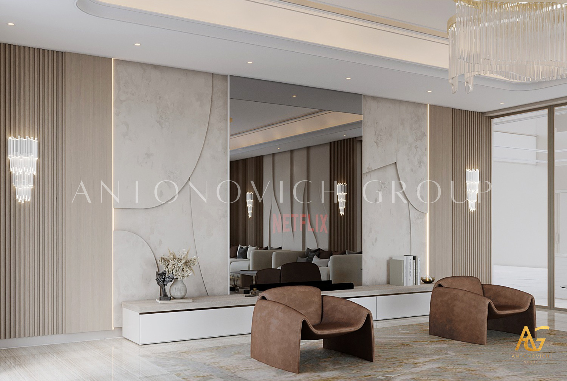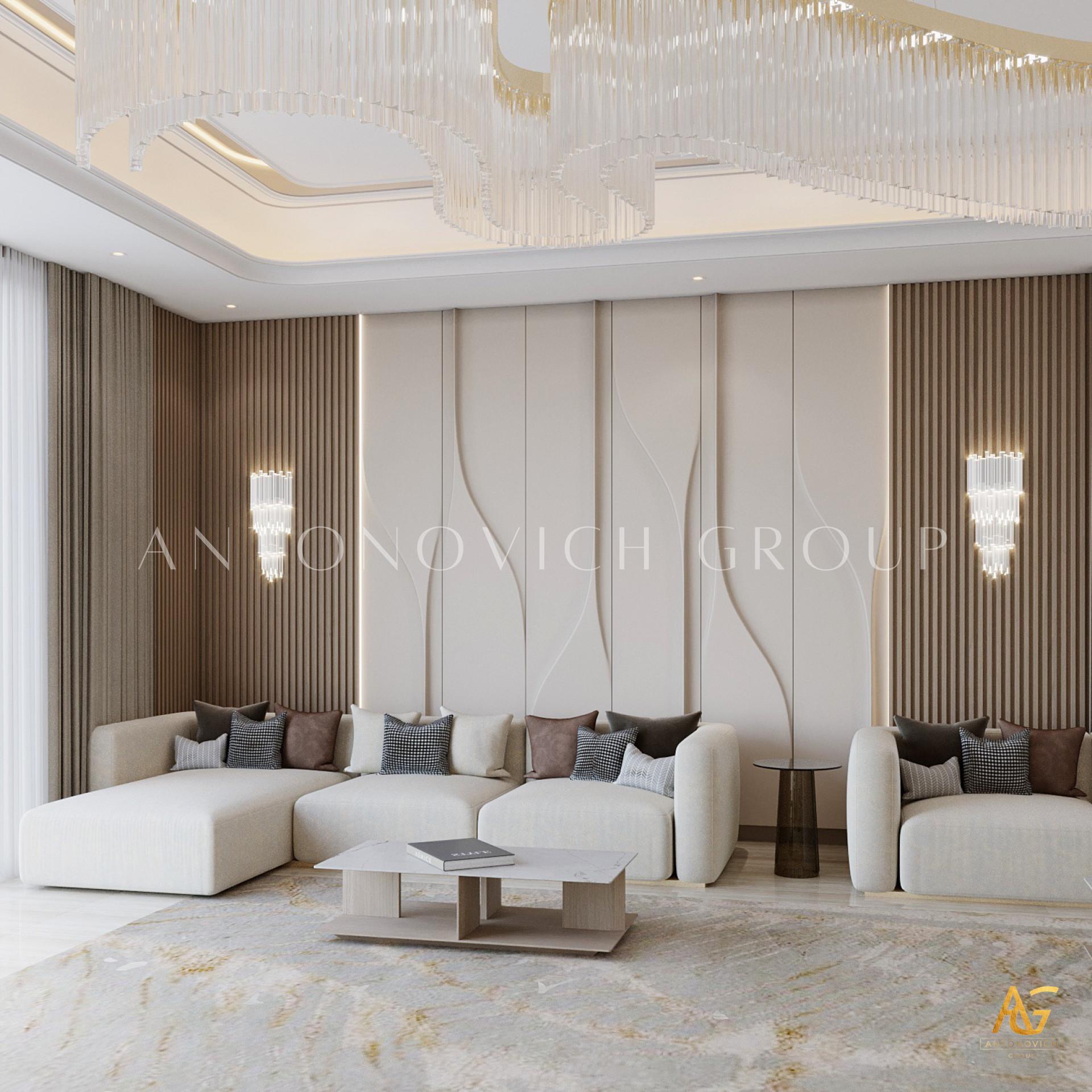 The owners of luxury apartment in Dubai dreamed of their own oasis within the urban apartment. Living room interior design, as if copied from their dreams. touches the delicate strings of the soul, and gives them the wonderful feeling of relaxing holiday, which they dreamed. Living room interior design in modern style supports the overall design concept of the interior. Laconic shapes and lines in the author's project acquires special meaning, especially the philosophy of absolute comfort. Part of this feeling of comfort is that a single space merge harmoniously living area, dining area and kitchen. And each of the zones like flow into one another, setting up to full harmony and aesthetically perfect visual perception. Living room design has a sufficiently bright and unique character. Here, interior designers Dubai delightfully combined tenderness and severity, the warmth of home and respectability. The wall, which is decorated with natural stone, is complemented by contemporary fireplace. Sofas and chairs are upholstered in a noble textile of black shade. They wonderfully contrast with the original three-dimensional panel on one wall. Ceiling design gives the living room interior a dynamism and originality. Snow-white expanse is dicorated with lines of LED backlight, which form a whole abstract ornament. Interior lighting is added with a charming and contemporary floor lamp and ceiling lamps. Smooth facades of the kitchen with natural ornaments delicately melted into the general picture of the cozy interior.
