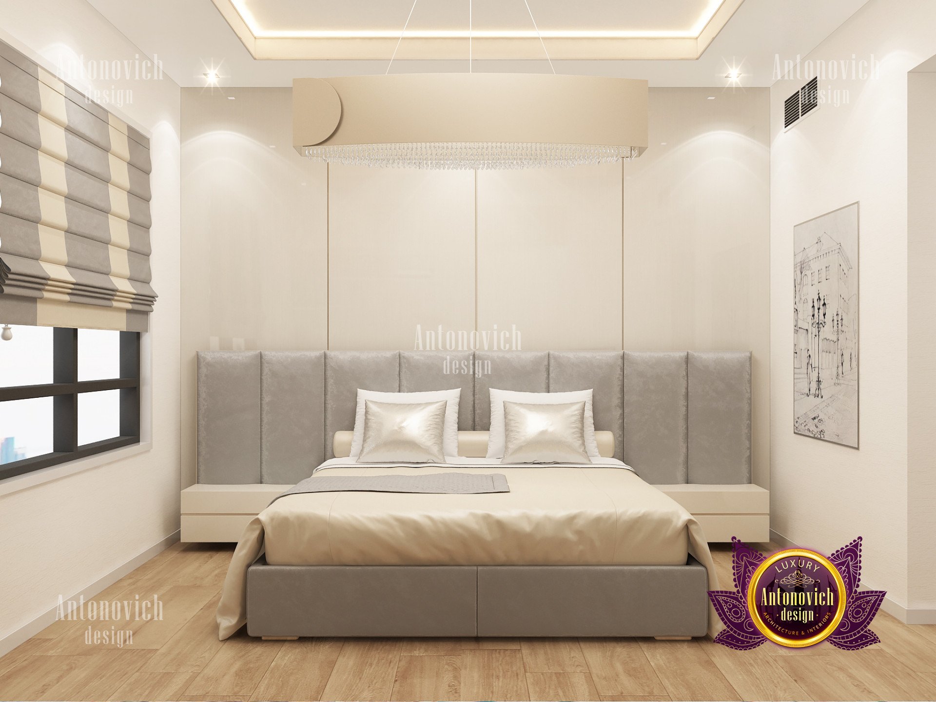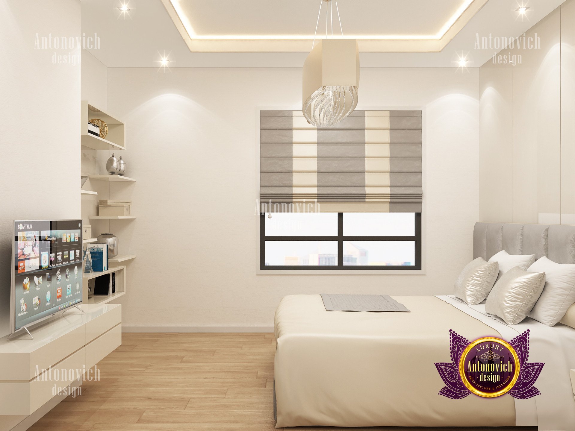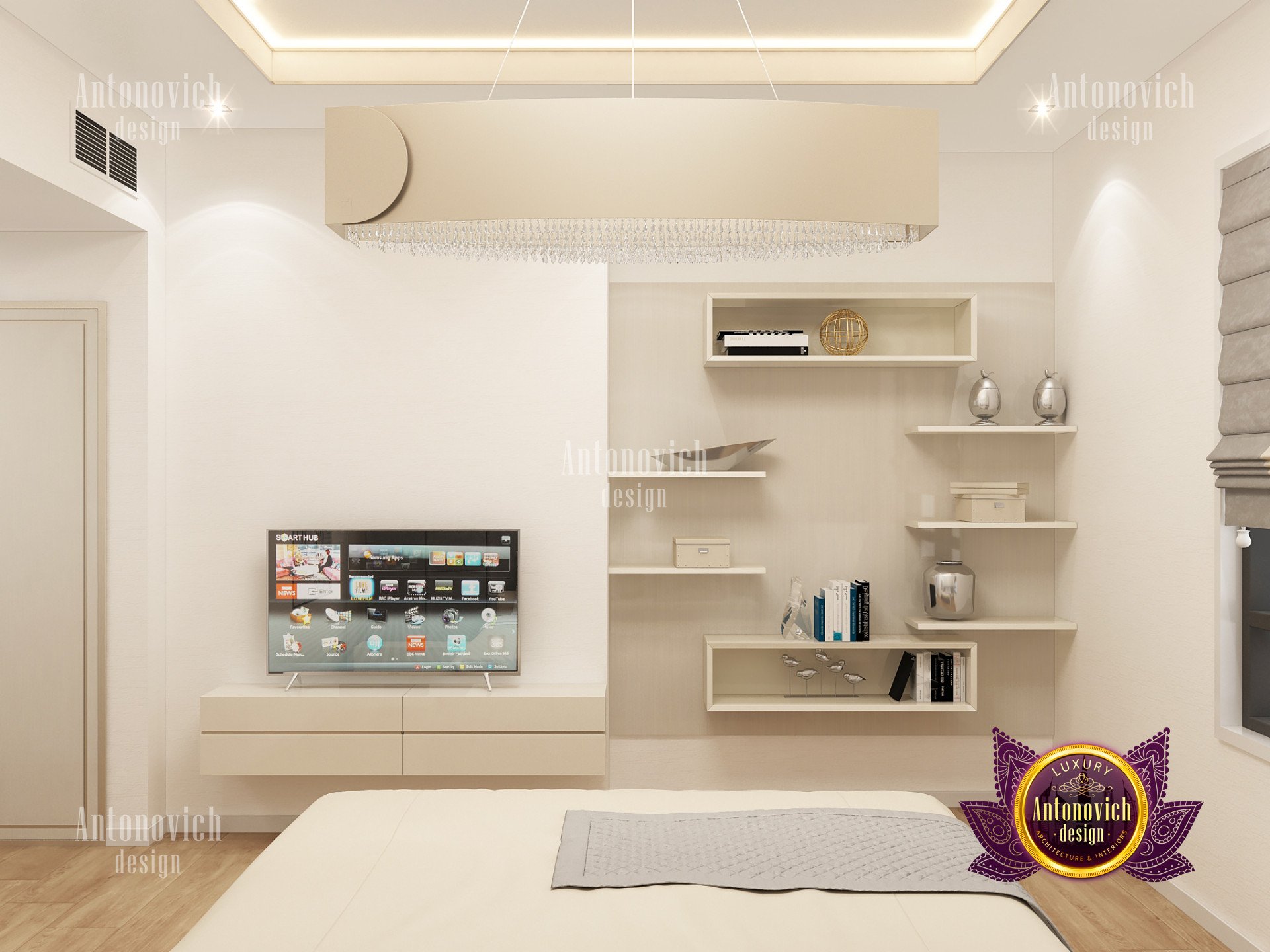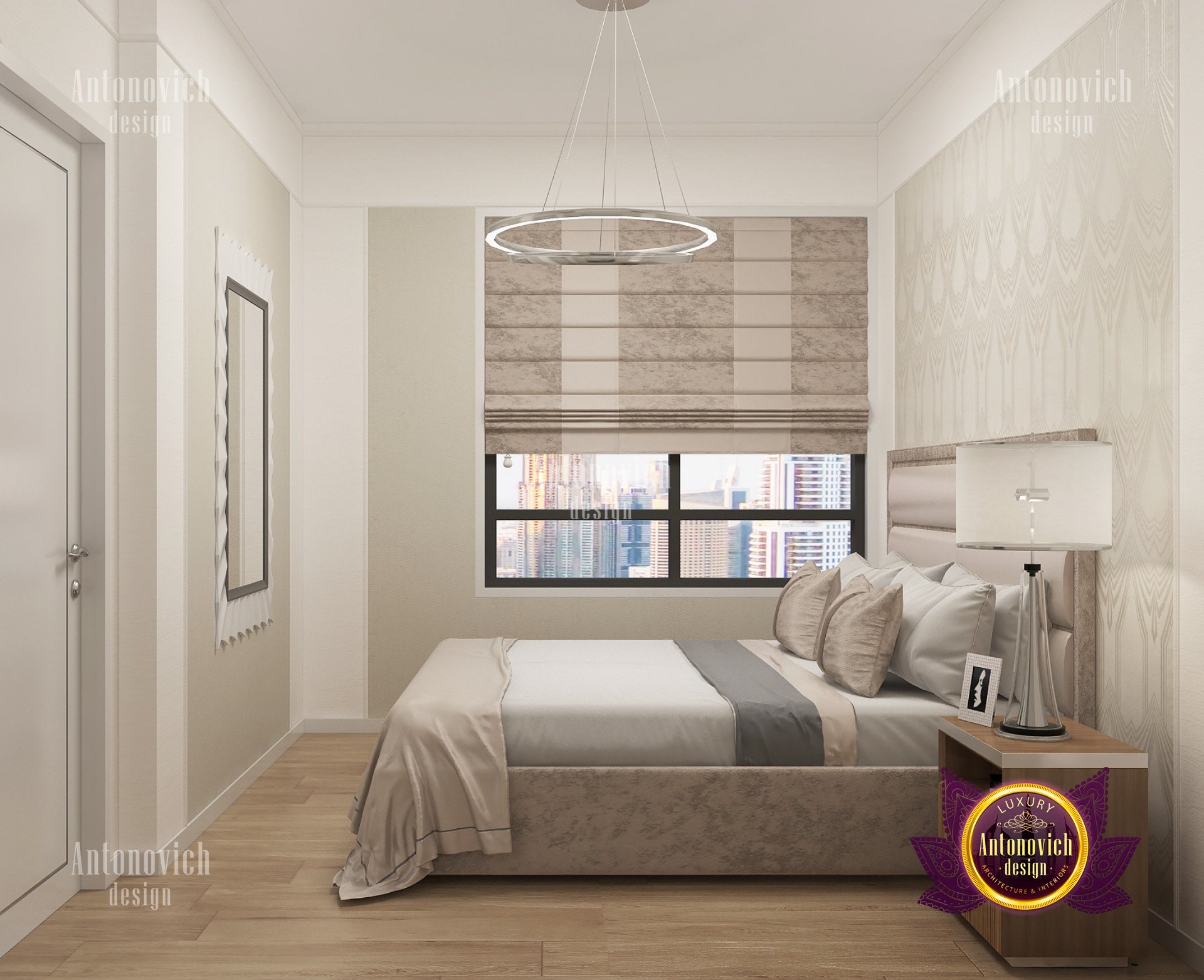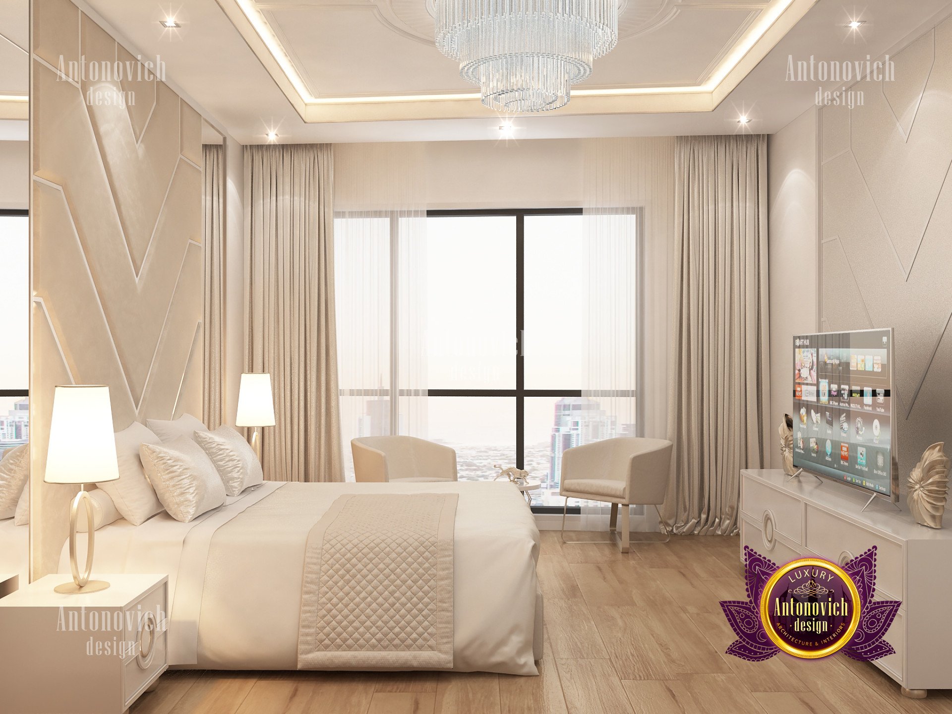 The bedroom has an extravagant open space feel with its cream look and feel. The beautiful interior design is the perfect combination of modern and contemporary interior design. The elegant detail which makes the room a good one is its layout. The open space design has elevated the room by creating an ambiance of space. The round and playful chandelier is a great addition to the already beautiful interior design of the room. Living in Dubai is definitely the best experience ever and topping it with a beautiful interior design for your apartment is a great feeling.