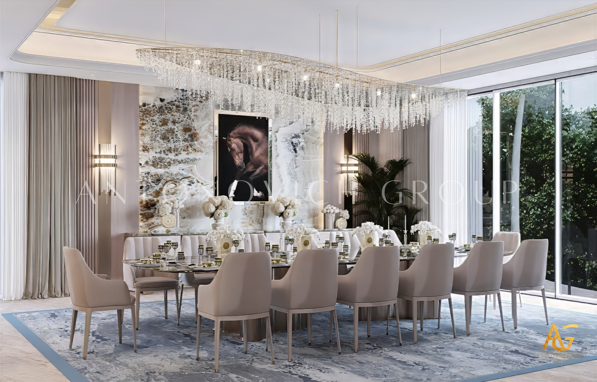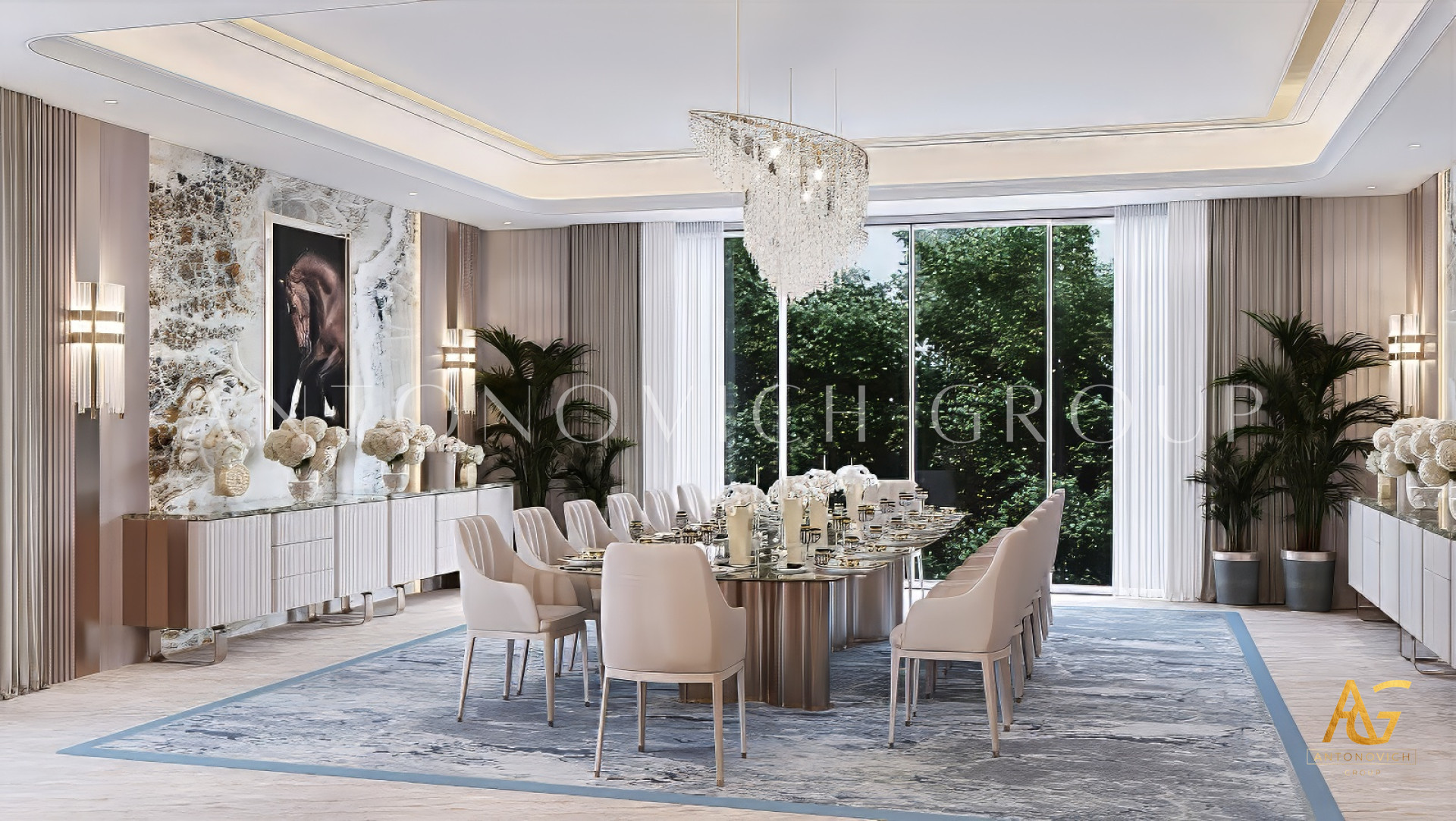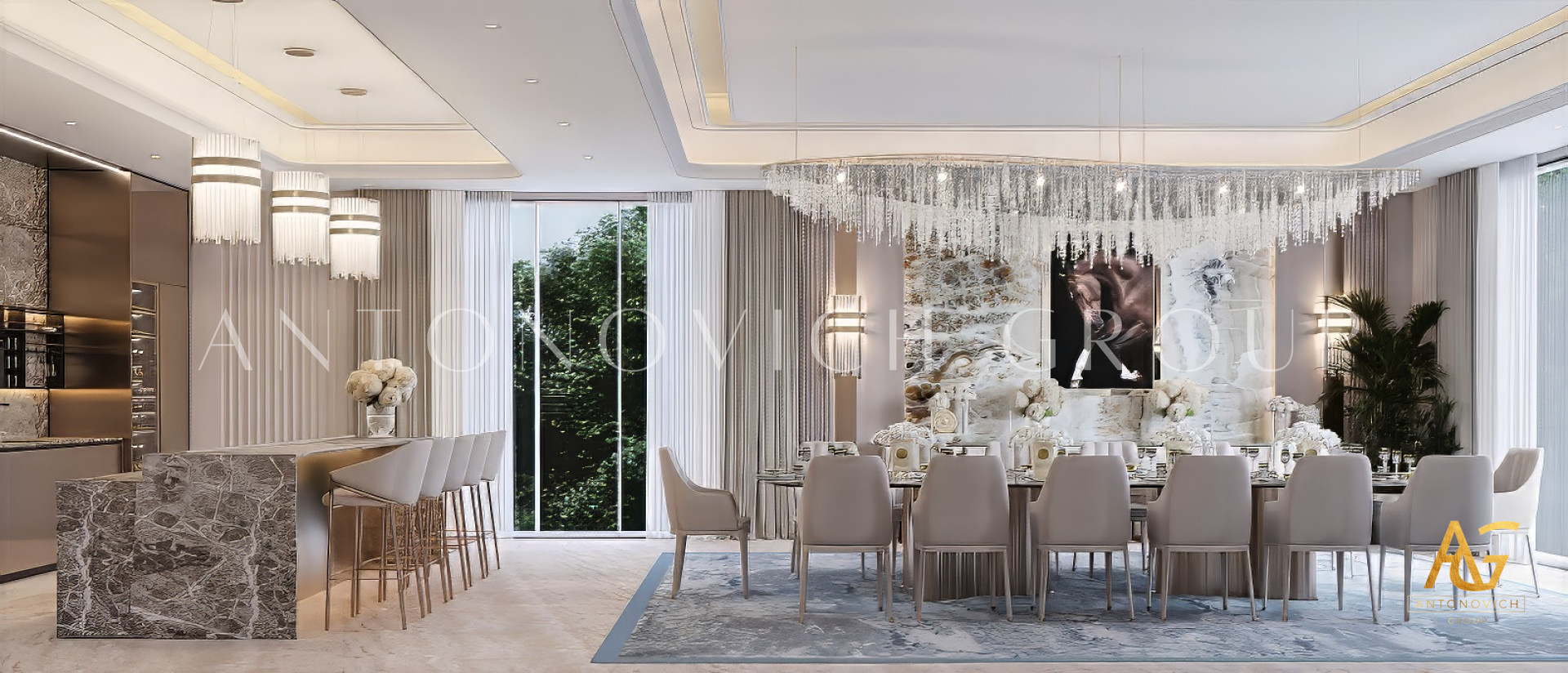 A luxury dining room designed by Antonovich Group is more than just a functional space — it’s a masterpiece that embodies style, atmosphere, and individuality. Every detail, from architecture to accessories, is carefully curated to reflect the client’s taste and lifestyle while meeting the highest standards of design and execution.